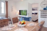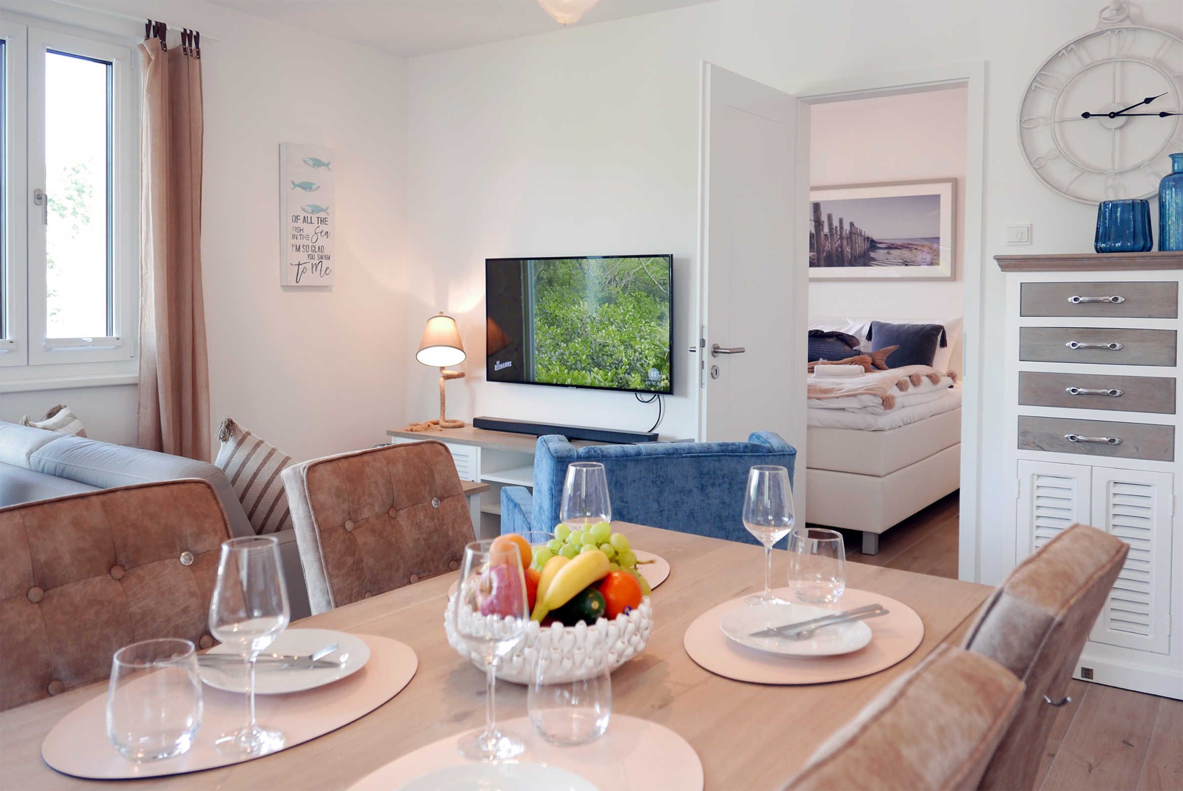 Der Wohnbereich verfügt über einen Essbereich und eine gemütliche Sofa- und Sessellandschaft. Das Sofa kann zu einem Schlafsofa mit den Maßen 140 x 200 cm umfunktioniert werden. Ebenfalls ist ein großer Flachbildfernseher sowie eine bluetoothfähige Soundbar vorhanden. Die Küchenzeile ist gut ausgestattet mit 4-Platten-Ceranherd, Kühlschrank (inkl. Gefrierfach), Backofen, Geschirrspülmaschine, Mikrowelle, Kaffeemaschine, Toaster und Wasserkocher.