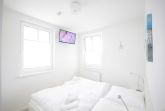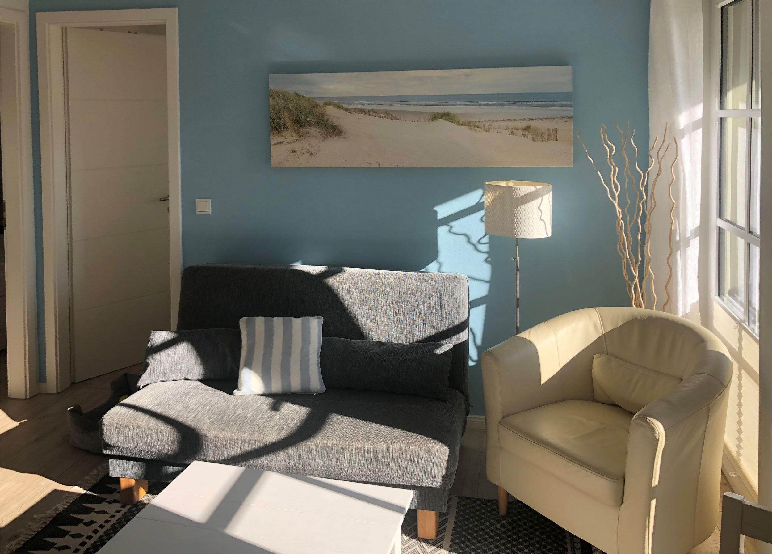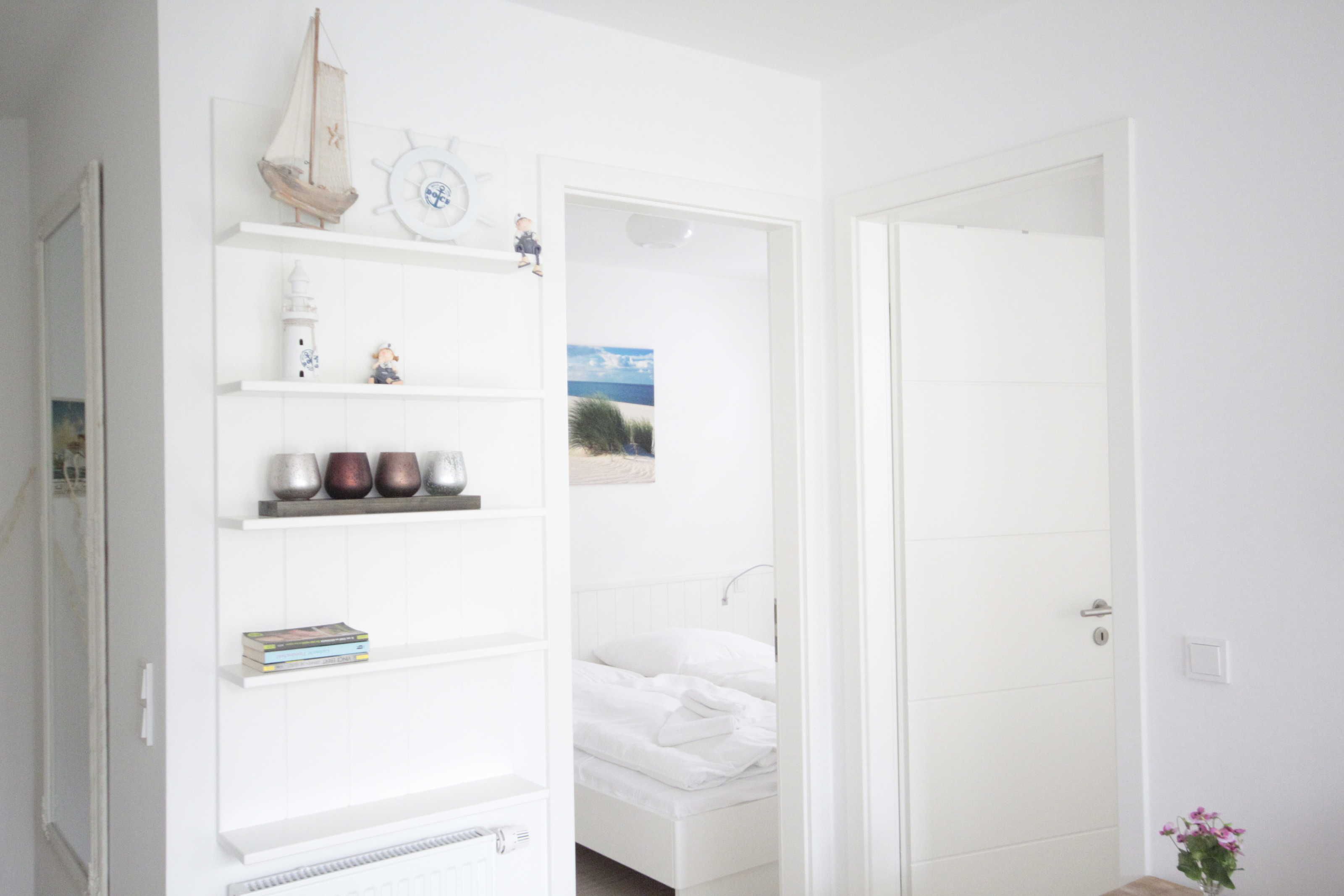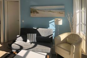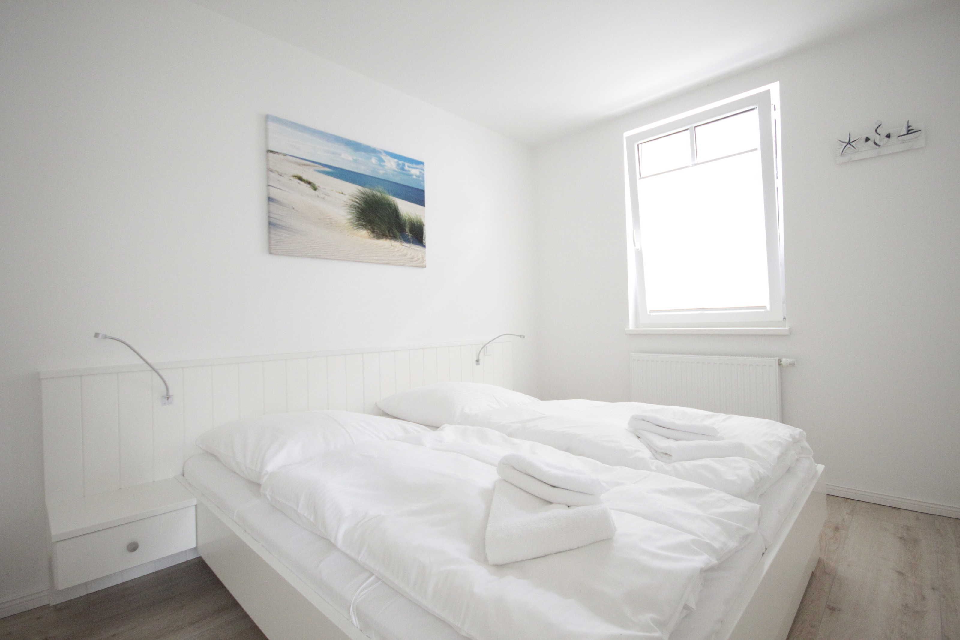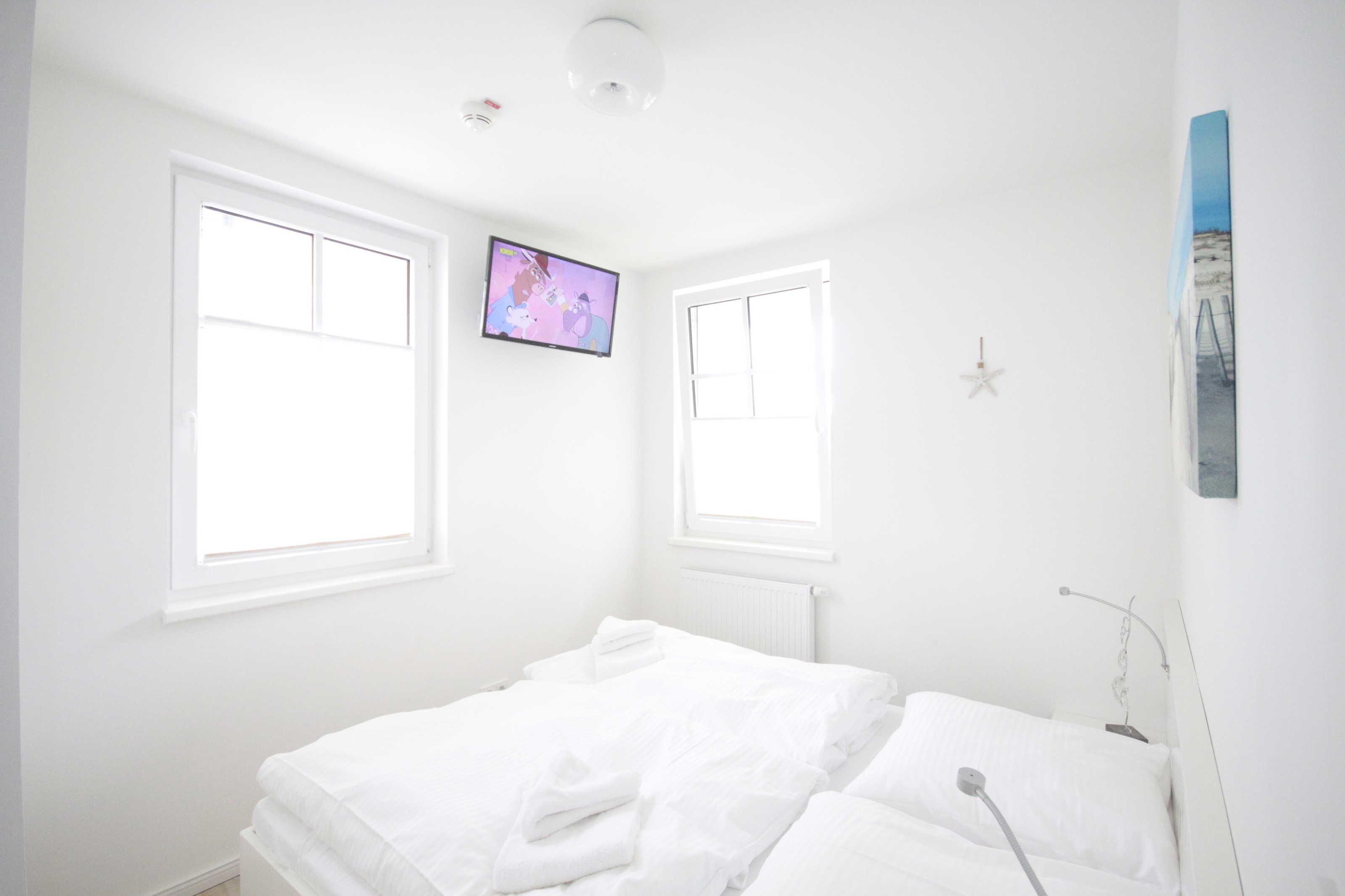 Helle moderne 3 Zimmerwohnung mit 2 Schlafzimmern mit jeweils einem Doppelbett und einem Fernseher. Große Sonnenterrasse mit Strandkorb. Hier kann man morgens aufstehen und direkt zum Strand gehen. Von hier können Sie das Meeresrauschen hören!
