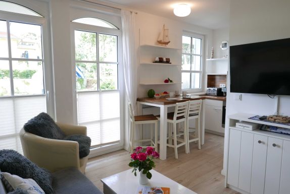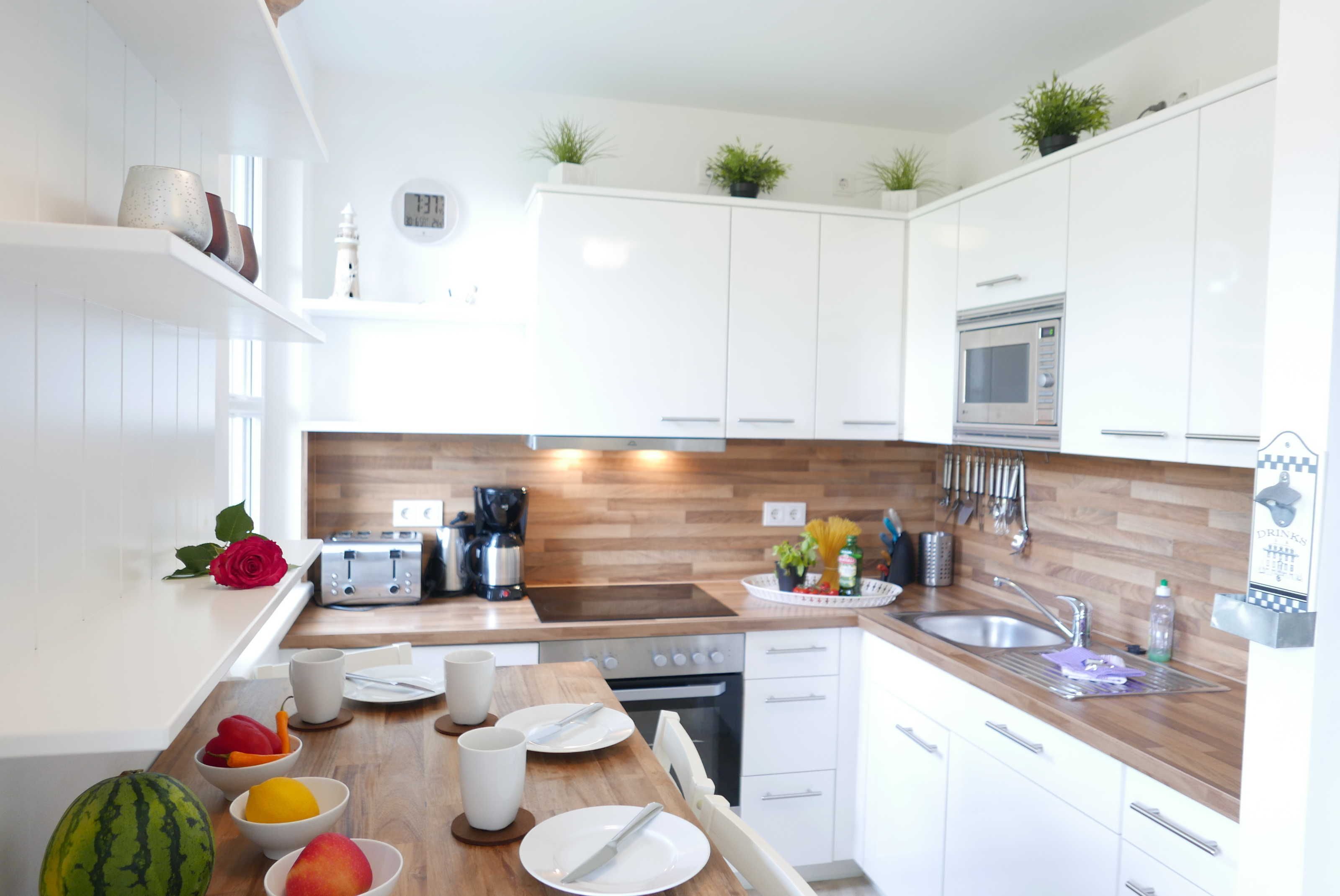 Die Wohnung hat eine offene, modern ausgestatteten Küche (Ceranfeld, Backofen, Mikrowelle, Kaffeautomat, 4-fach Toaster, Wasserkocher, Kühl-Gefrierschrank, Staubsauger) und einen kombinierten Wohn-Eßbereich mit einem Esstisch und 4 Stühlen sowie ausziehbarer Schlafcouch und einem 42 TV mit Radio, CD, DVD und Blu Ray Player.