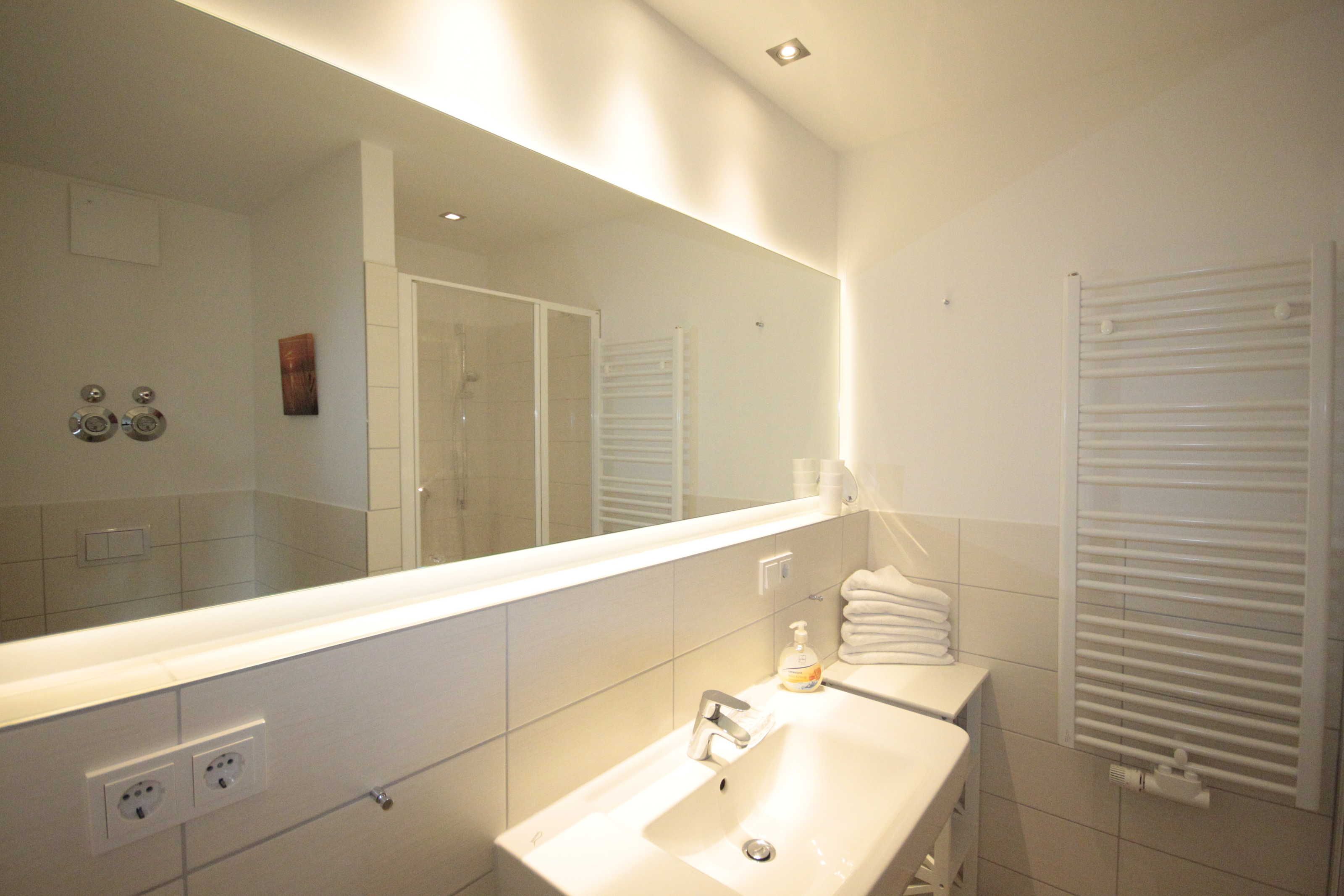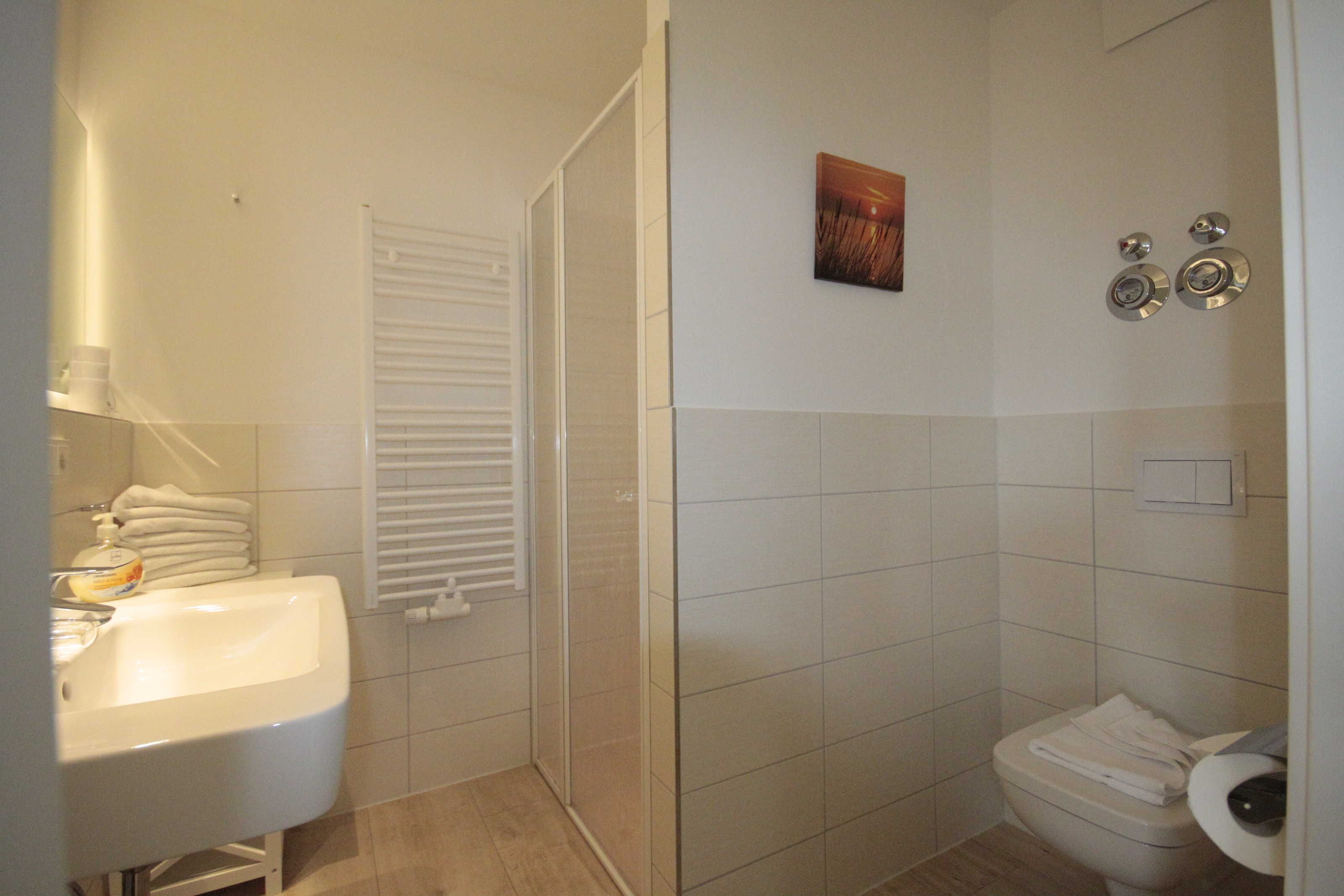 Dusche, Waschbecken, WC, Handtuchheizkörper und Fön und eine Abstellkammersind selbstverständlich.