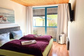 Die Ferienwohnung SYTO 1 bietet dir auf 35 m² alles, was du für einen erholsamen Urlaub mit bis zu 4 Personen brauchst. Schon der Eingang über die Terrasse heißt dich herzlich willkommen und führt direkt in den offenen Wohnbereich, der mit einem Schlafsofa (180x200) und einem TV zum Entspannen einlädt. Die angrenzende Küche ist nicht nur modern, sondern auch voll ausgestattet. Ob Herd, Kühlschrank, Spülmaschine, Kaffeemaschine, Toaster oder Wasserkocher – hier findest du alles, um leckere Mahlzeiten für dich und deine Liebsten zuzubereiten. Im separaten Schlafzimmer erwartet dich ein gemütliches Doppelbett (180x200), das für erholsame Nächte sorgt. Ein Kleiderschrank bietet ausreichend Stauraum und auch hier musst du auf einen TV nicht verzichten – perfekt für einen entspannten Abend. Das Bad ist praktisch und modern gestaltet, mit einer Dusche und einem WC, damit es dir an nichts fehlt. Auf der zweiten Terrasse hinter dem Haus kannst du die Sonne genießen oder den Tag bei einem guten Buch und einem kühlen Getränk ausklingen lassen.
