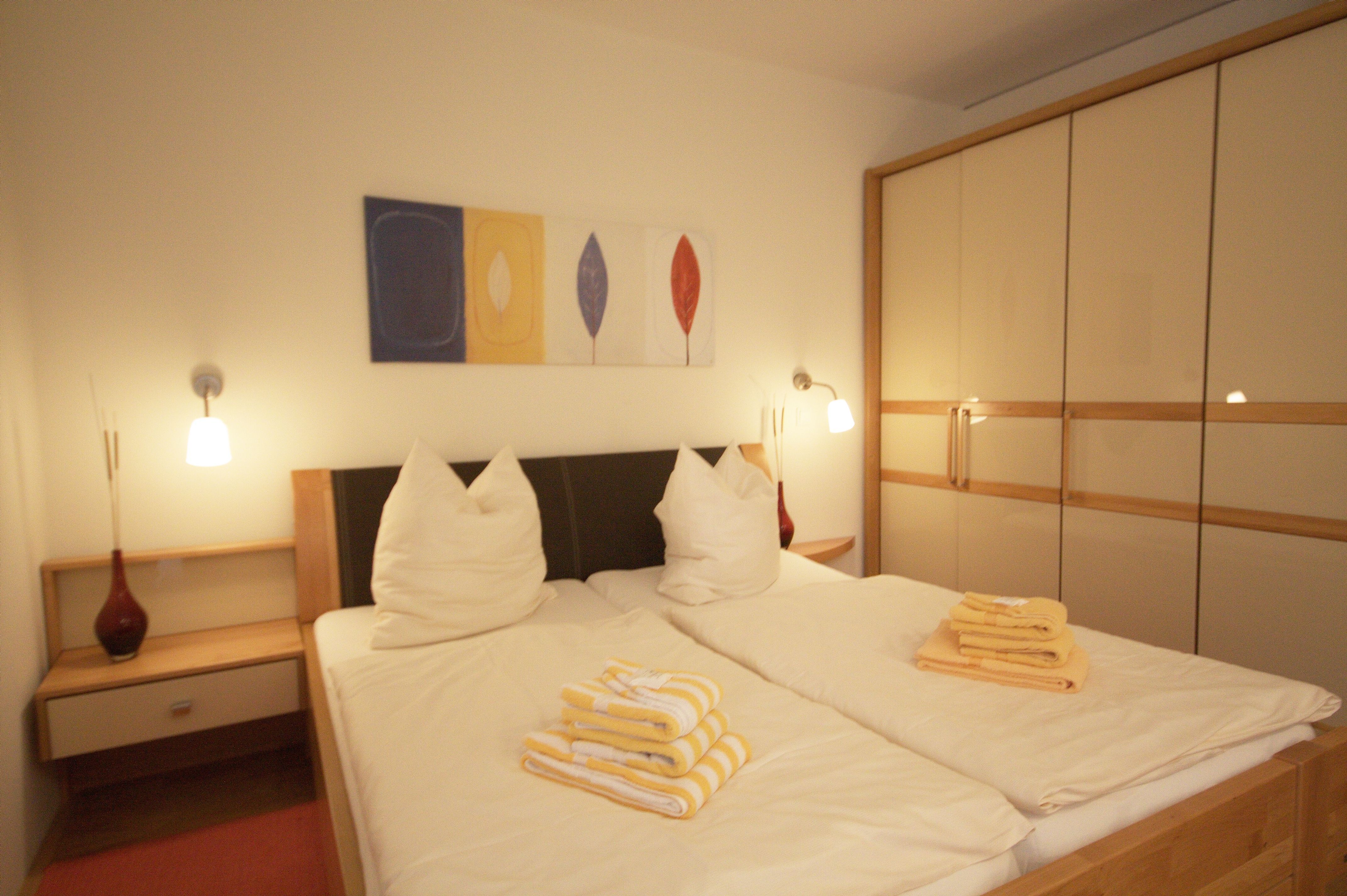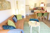 Neben dem großen Doppelschlafzimmer mit Ausgang zur Terrasse befindet sich ein großzügiger Wohn/Ess- und Schlafbereich. Der Schlafbereich ist optisch abgetrennt und mit einem Schrank und Doppelbett eingerichtet. Bodentiefe Fenster geben den Blick zum Kurpark frei. Die Küche ist mit allem Komfort ausgestattet und zum Wohnraum hin offen, so das ein schönes Raumgefühl entsteht.
