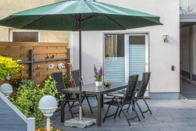 Die eigene Terrasse mit Grill, Sonnenschirm und gemütlichen Terrassenmöbeln lädt dazu ein, entspannte Stunden im Freien zu verbringen und den Tag bei einem gemeinsamen Essen unter freiem Himmel ausklingen zu lassen.