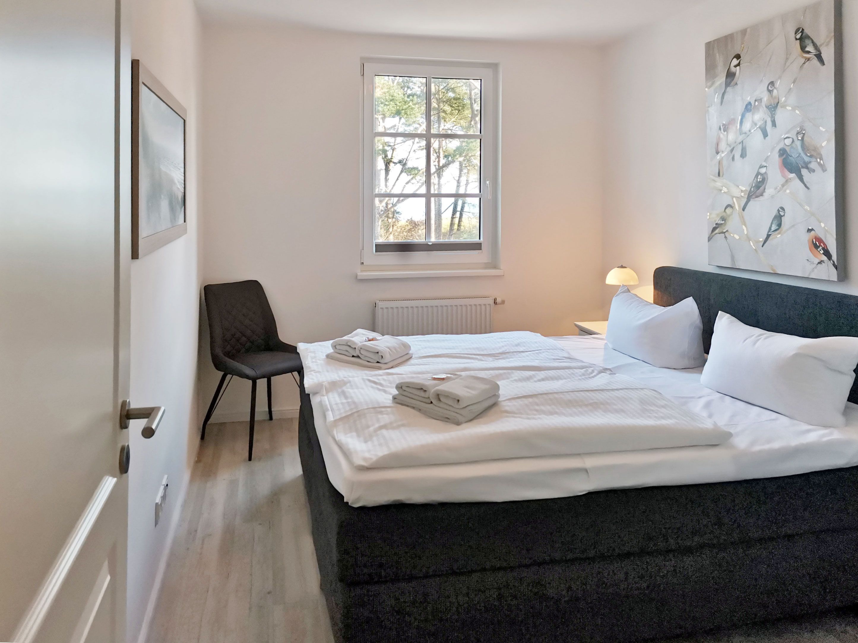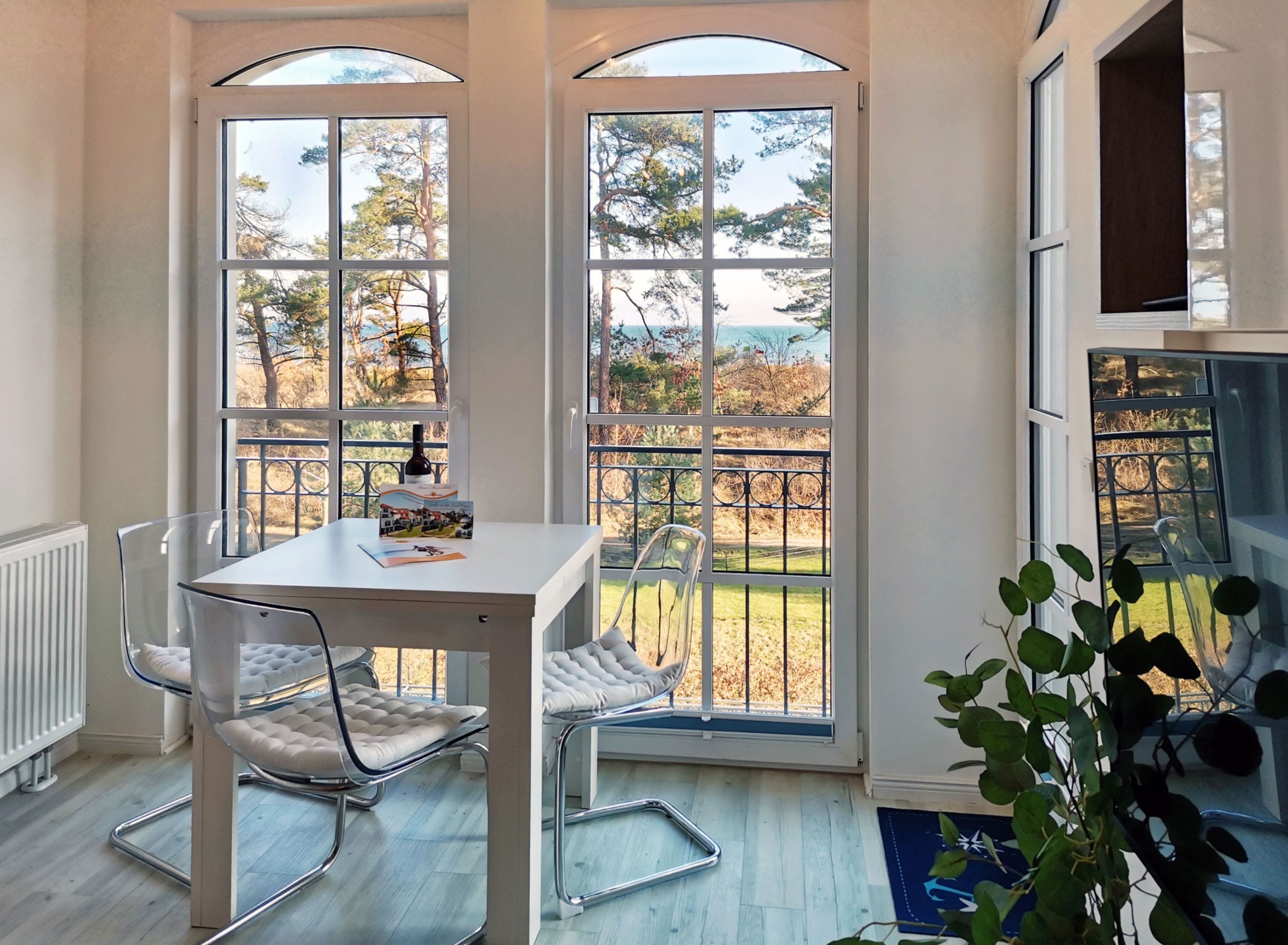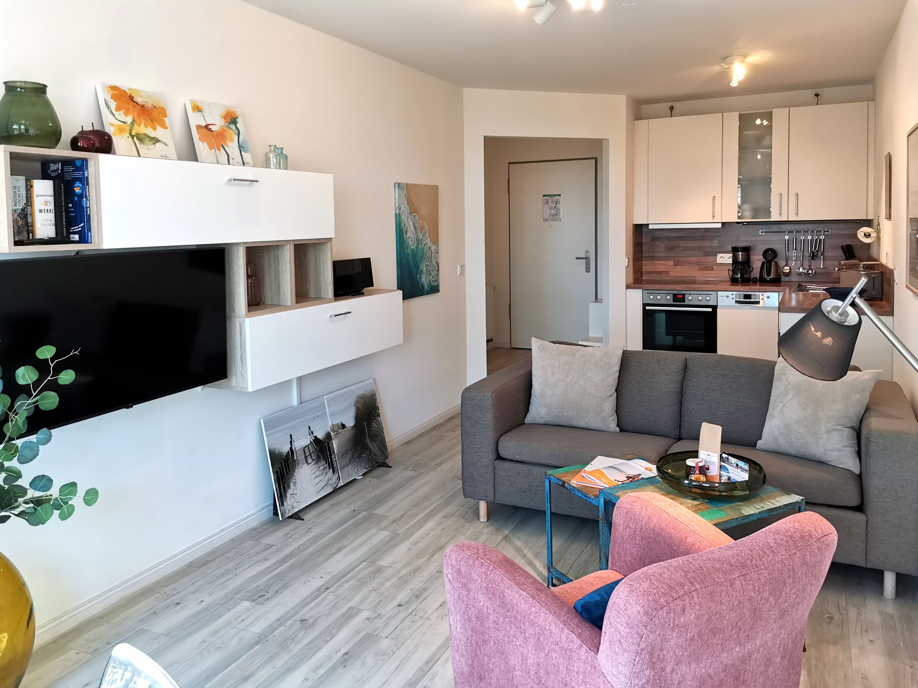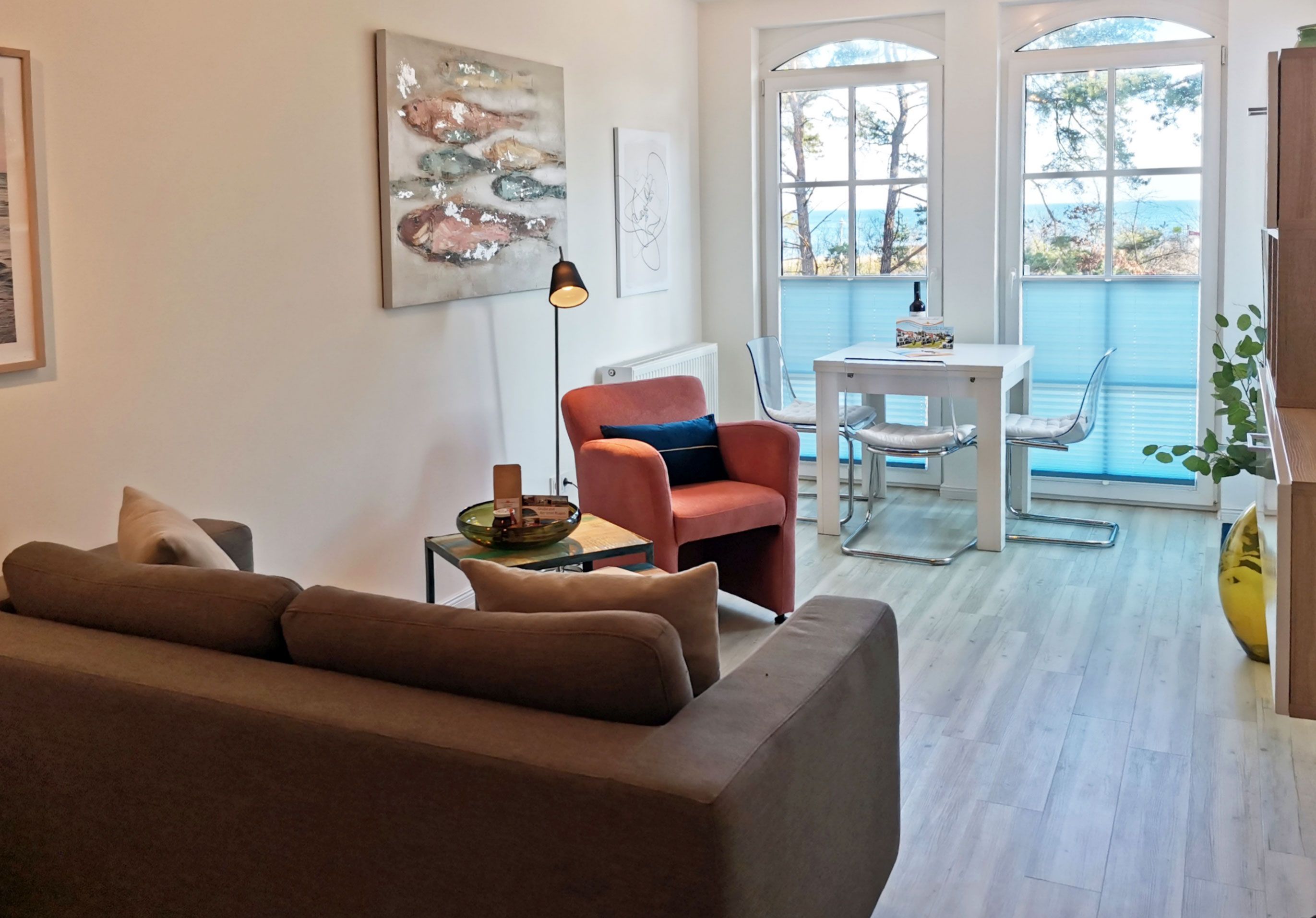 Genießen Sie den Blick auf das Meer von dieser kleinen aber feinen Ferienwohnung für bis zu 3 Personen. Sie liegt im 2013 fertiggestellten Haus Meeresblick. Die Ferienresidenz hat einen direkten Zugang zum Strand. Das Haus ist mit einem Fahrstuhl, einer Tiefgarage und einem großen Wellnessbereich mit Schwimmbad (ca. 8,00 m x 4,00 m - 1,35 m tief), zwei Saunen (eine finnische Sauna/eine Bio-Sauna) und einem Massagebereich ausgestattet.