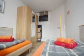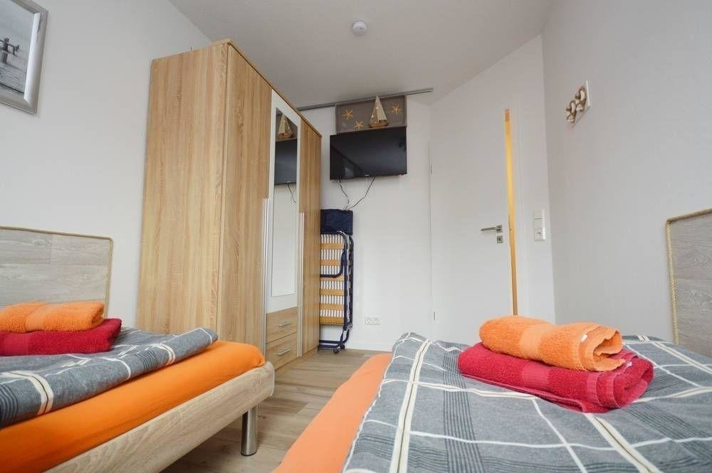 Von hier aus gelangen Sie in die einzelnen Zimmer, dass Schlafzimmer mit zwei Einzelbetten, dem Kleiderschrank, einer Garderobe und einem TV an der Wand.
