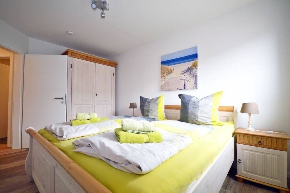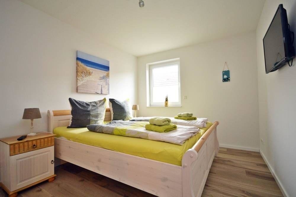 Im nächsten Schlafzimmer befindet sich ein Doppelbett, ein Kleiderschrank, die Nachttische und auch hier einem TV an der Wand.
