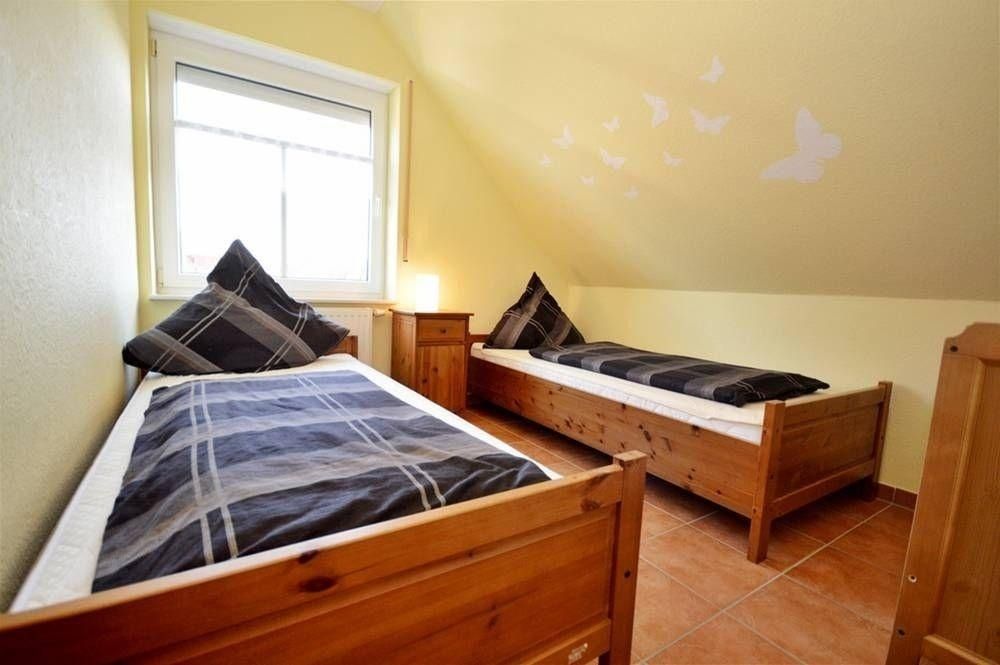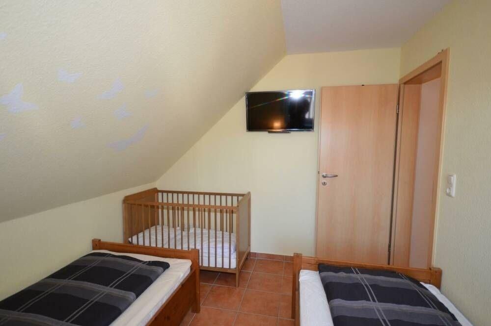 Zwei weitere Einzelbetten gibt es im zweiten Schlafzimmer. Hier steht neben Nachtschränkchen & TV ein Gitterbett für Sie bereit.