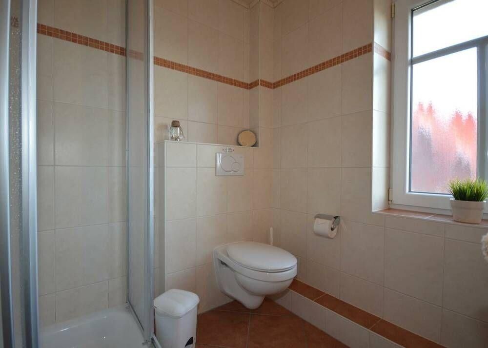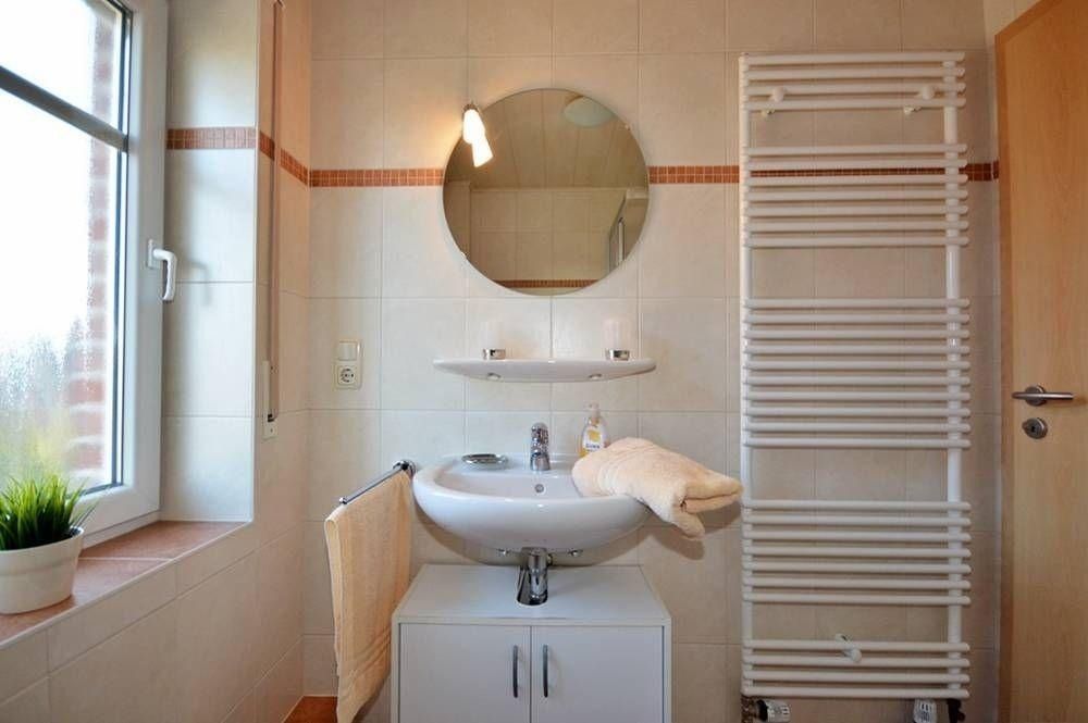 Die 0,90 x 0,90 m große Dusche mit Raindance-Brause im Tageslichtbad macht das Duschen zu wahren Vergnügen. Des weiteren gehört ein Handtuch-Heizkörper, ein Waschbecken mit Spiegel und Unterschrank zur Badezimmerausstattung.