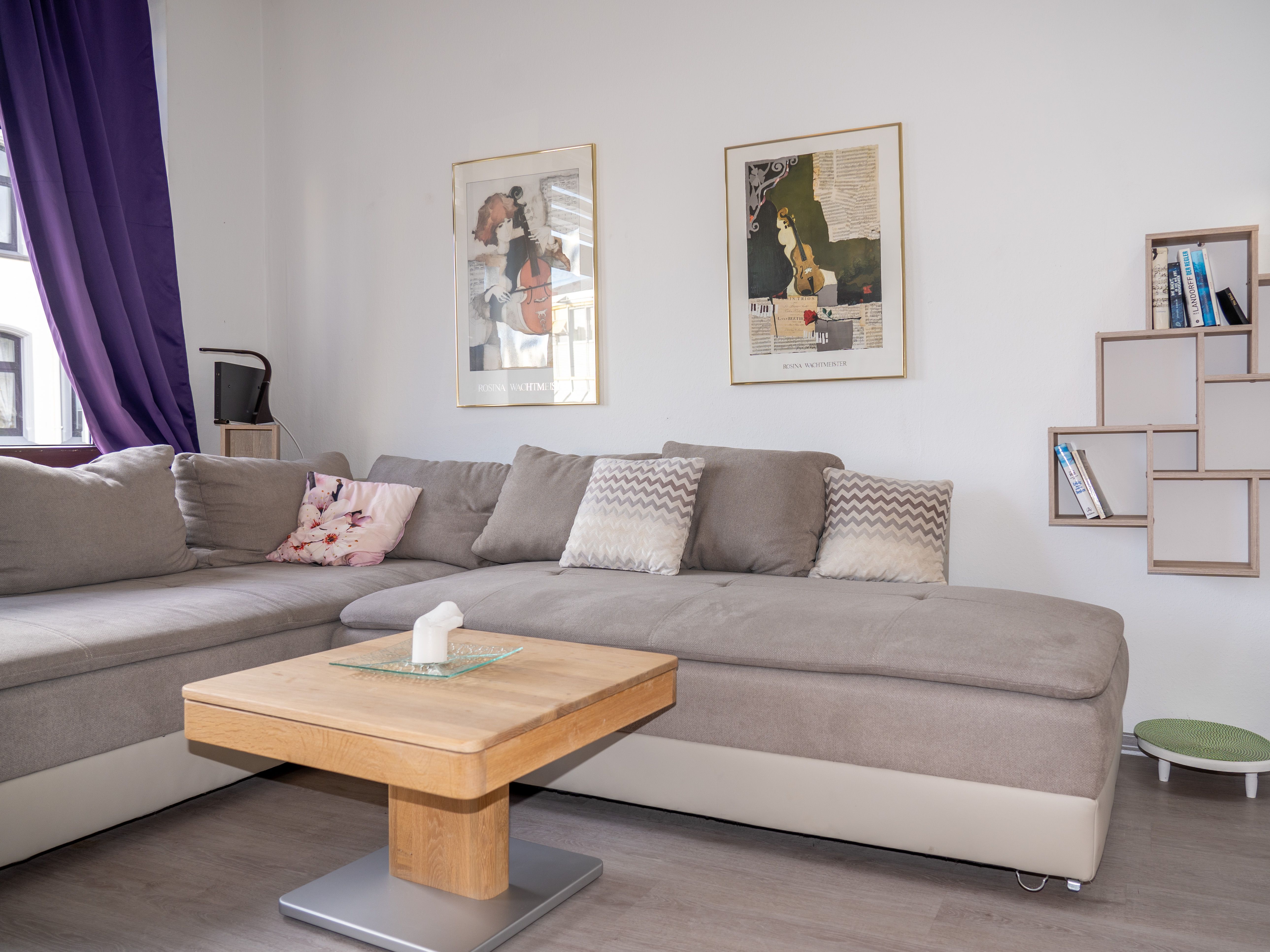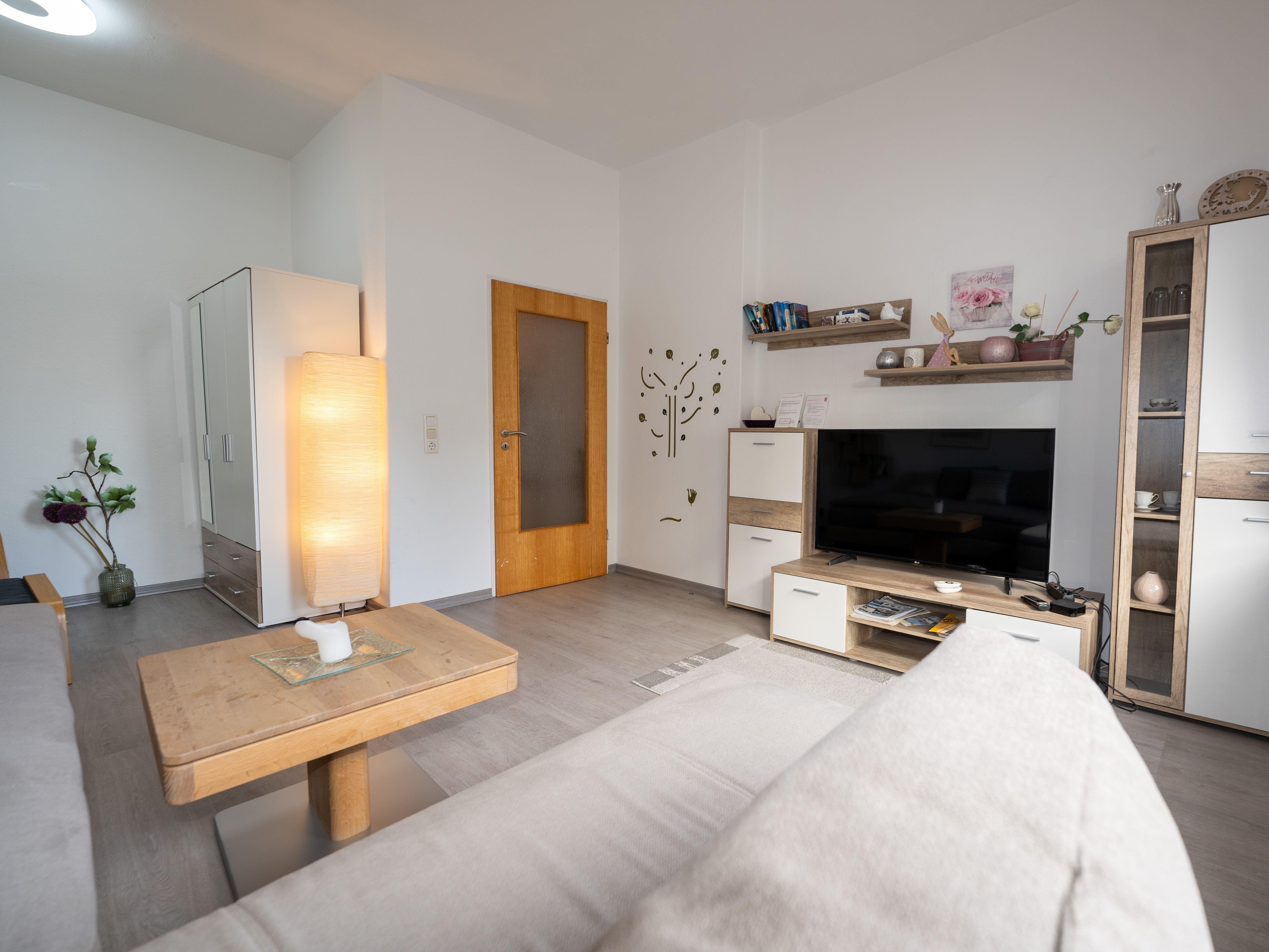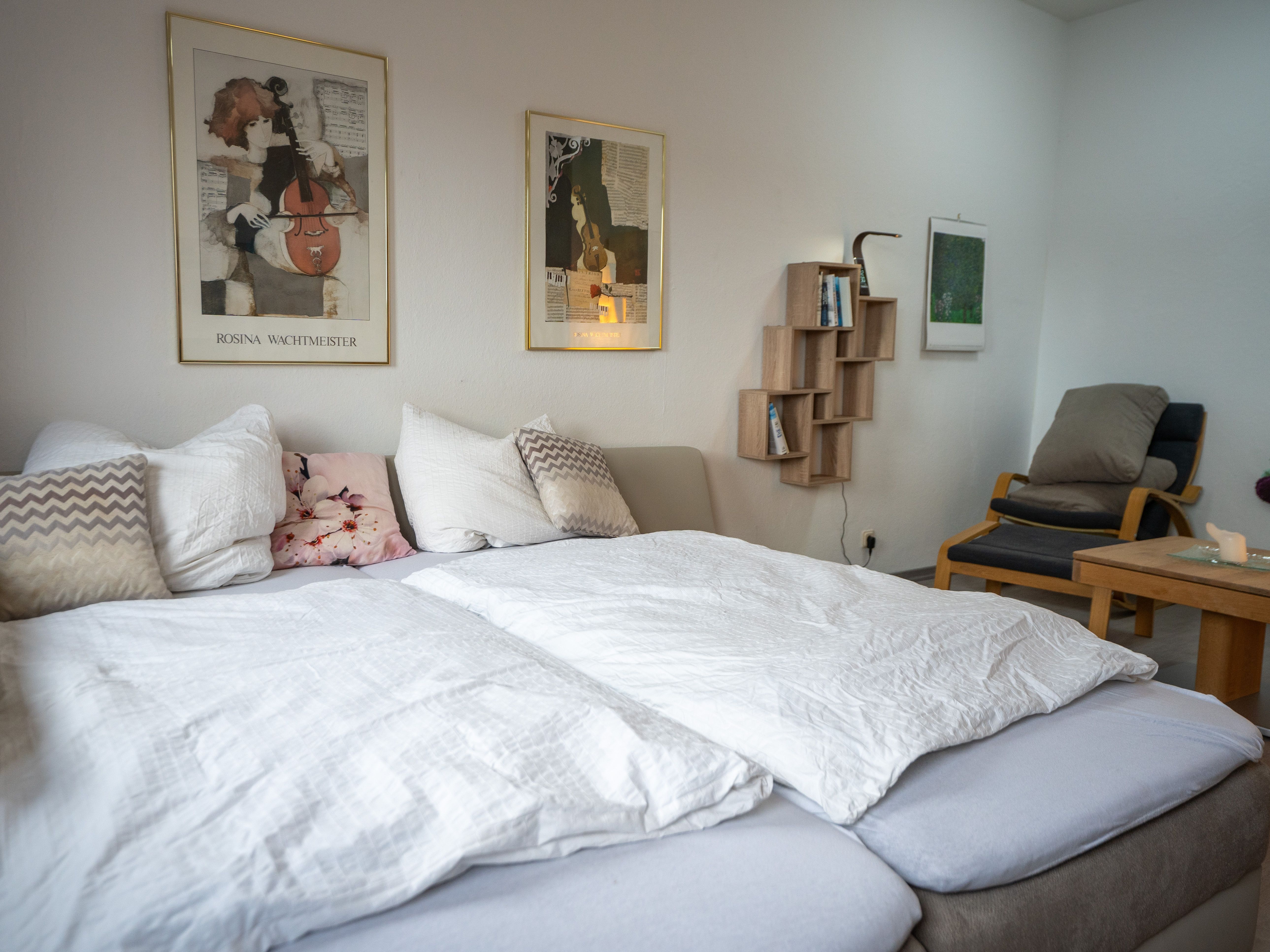 Die Wohnung ist mit einem großen Wohn/Schlafraum ausgestattet. Die Sofalandschaft lässt sich problemlos zu einem großen, bequemen Doppelbett zusammenschieben. Ein Kinderreisebett ohne weitere Ausstattung ist ebenfalls vorhanden. Eine kleine Leseecke hat in diesem großzügigen Wohnraum ebenfalls einen Platz gefunden. Kabel-TV, Apple-TV und WLAN stehen Ihnen zur Verfügung.