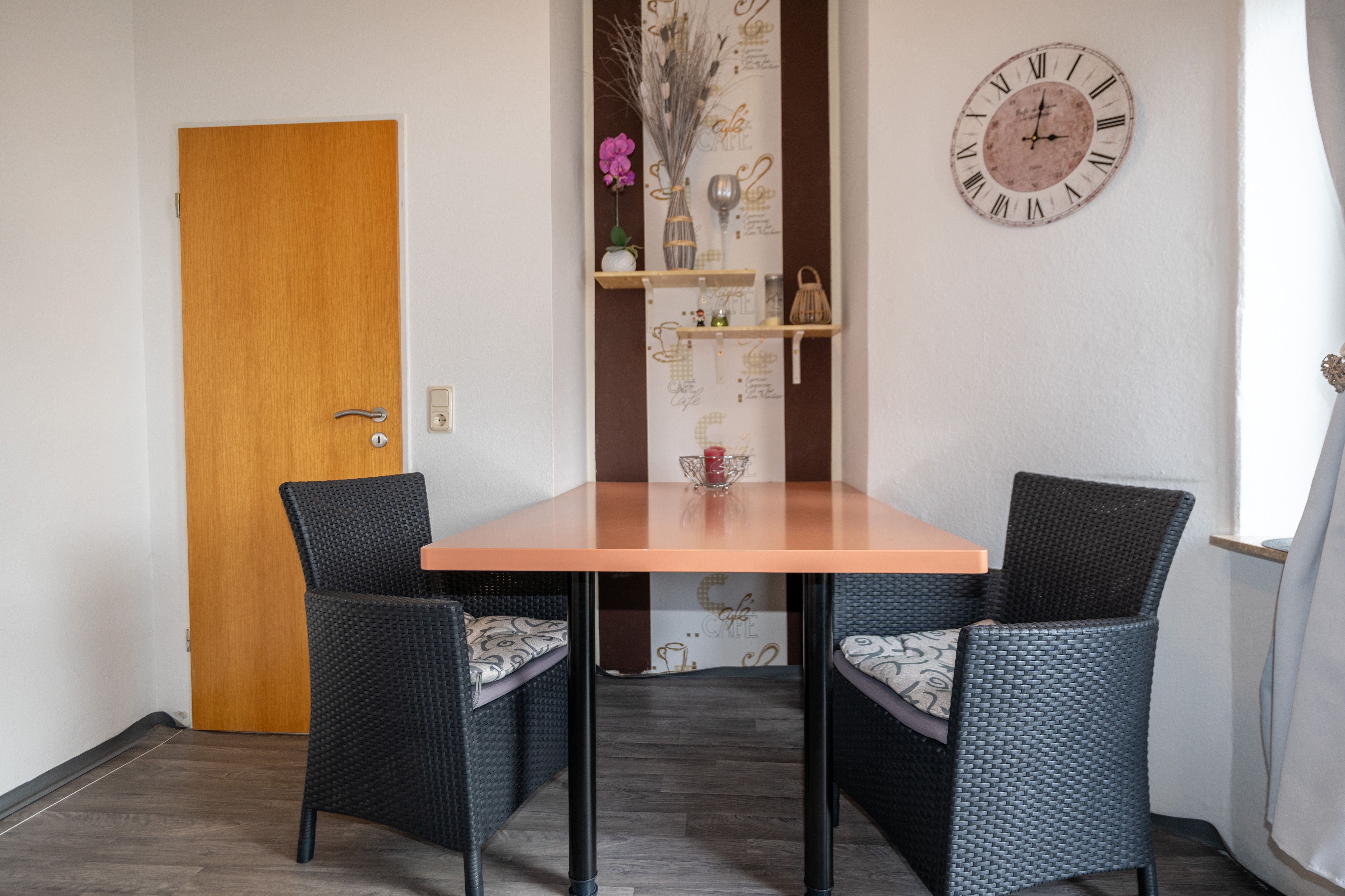 Die gemütliche Wohnküche ist gut ausgestattet mit einem Ceranfeldherd, Backofen, Kühlschrank mit Gefrierschrank,Toaster, Mikrowelle, Wasserkocher, Kaffeemaschine sowie einer Tassimo- Kaffemaschine sowie jeder Menge Geschirr und Kochutensilien. Ein Klappmöbel lässt sich bei Bedarf zu einem zusätzliches Einzelbett umfunktionieren. Ein gemütlicher Esstisch mit 3 Stühlen läd zum Speisen ein. Von der Küche aus gelangen Sie auf den überdachten Balkon. Auf dem Balkon ist das Rauchen gestattet.