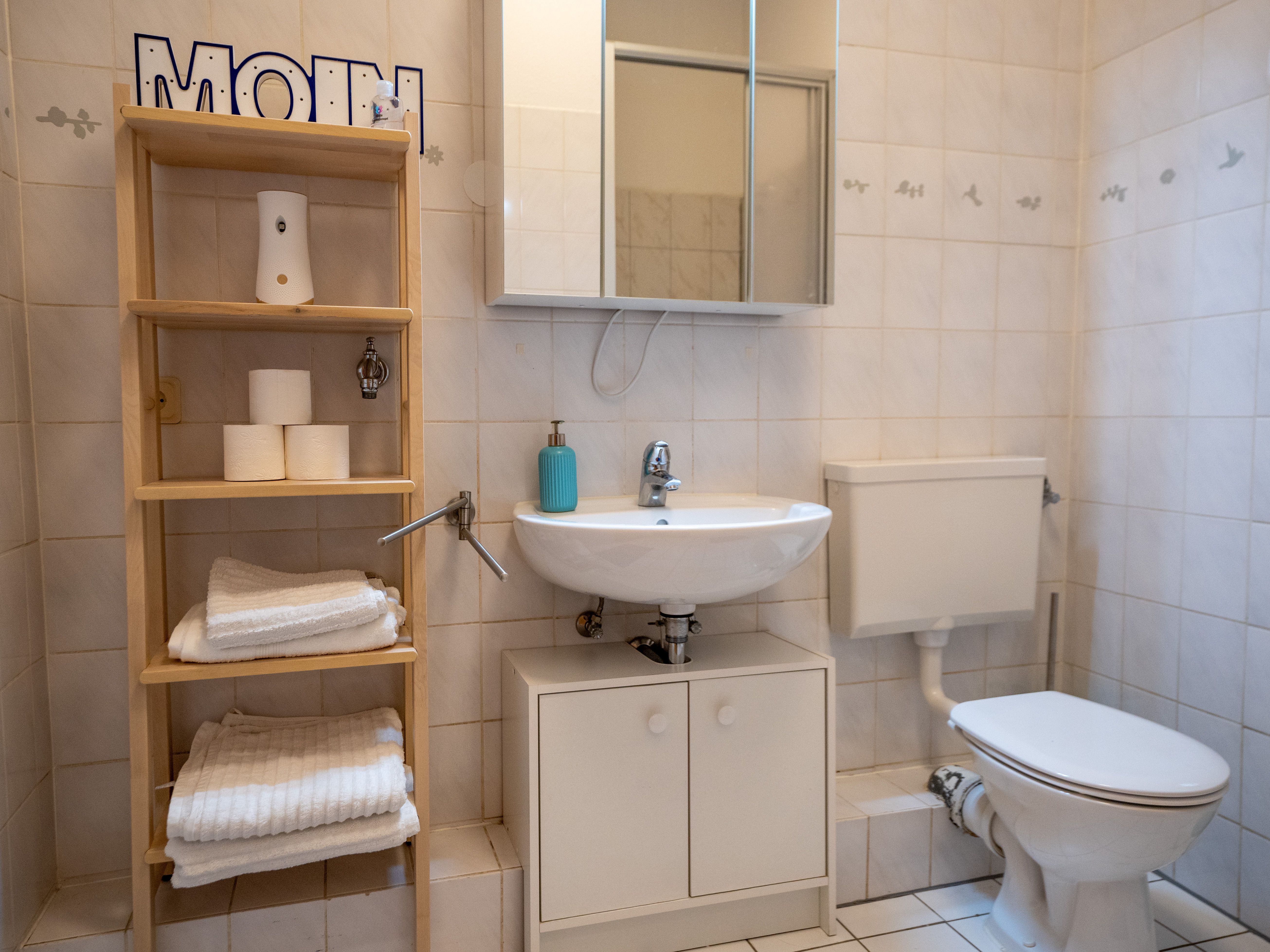 Das Bad ist mit einem Waschbecken, einem WC und einer Dusche ausgestattet. Ein Fön liegt für Sie bereit.