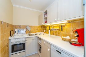 Die Küche ist mit einem Geschirrspüler, einem Herd mit Backofen und 4 Kochfeldern, Mikrowelle und einem Kühlschrank (ohne Gefrierfach) ausgestattet. Kaffeemaschine, Wasserkocher und Toaster gehören zur Grundausstattung.
