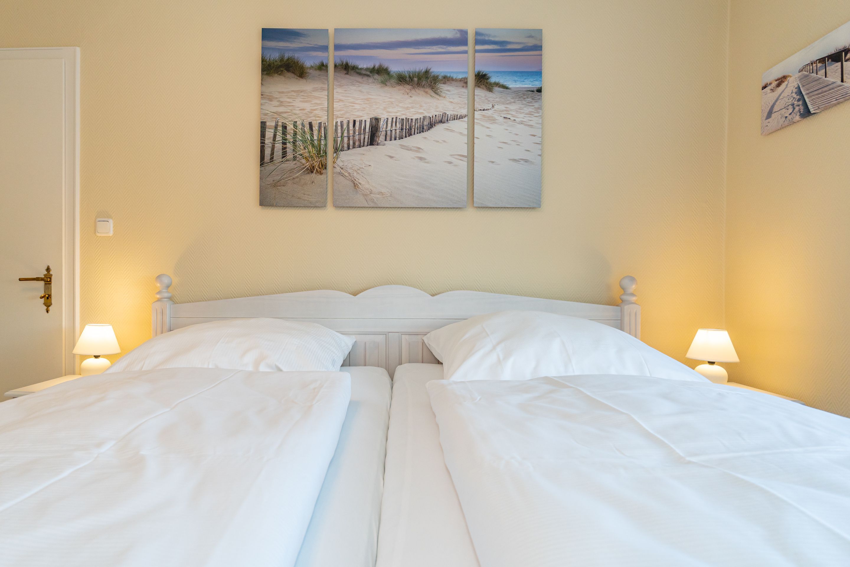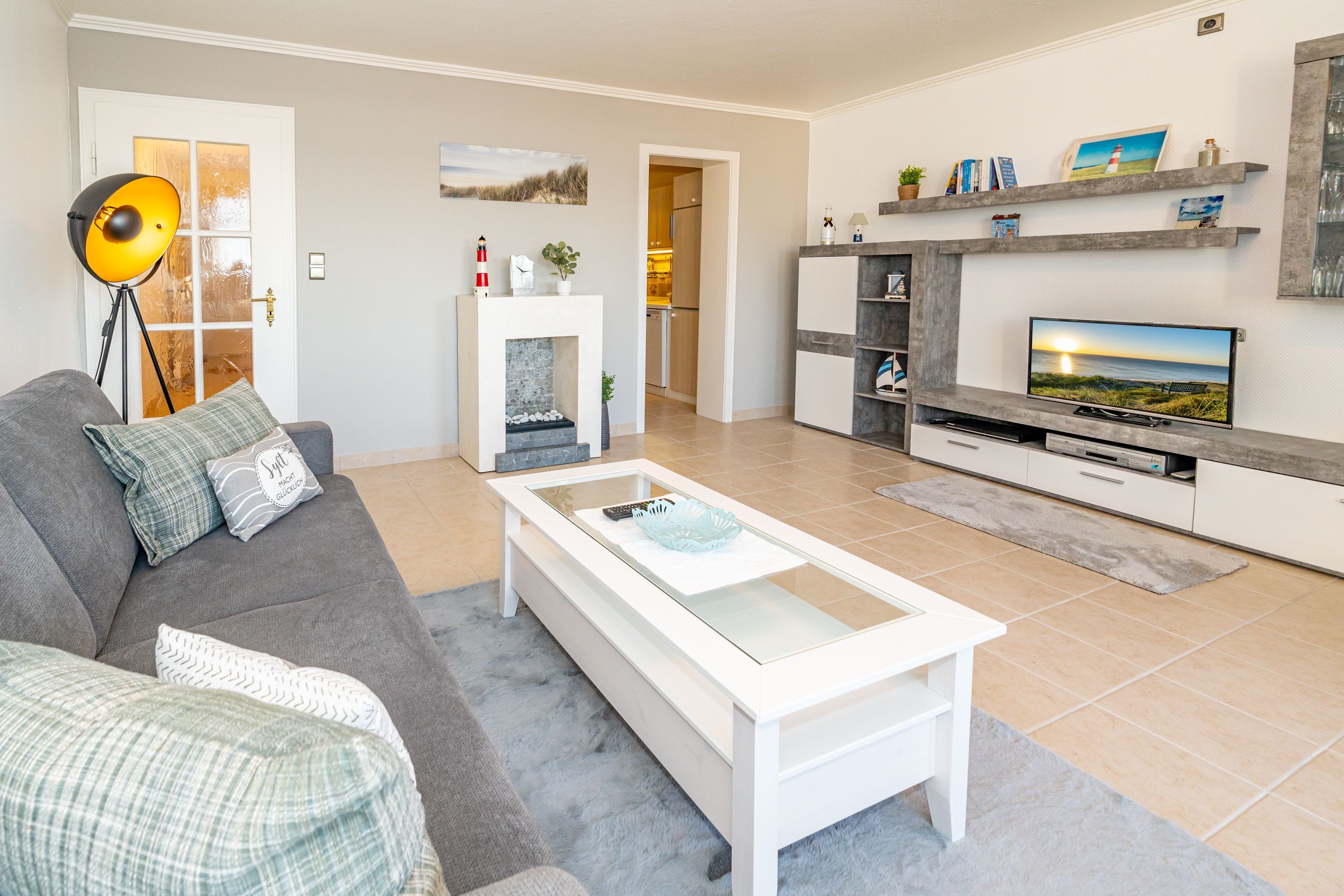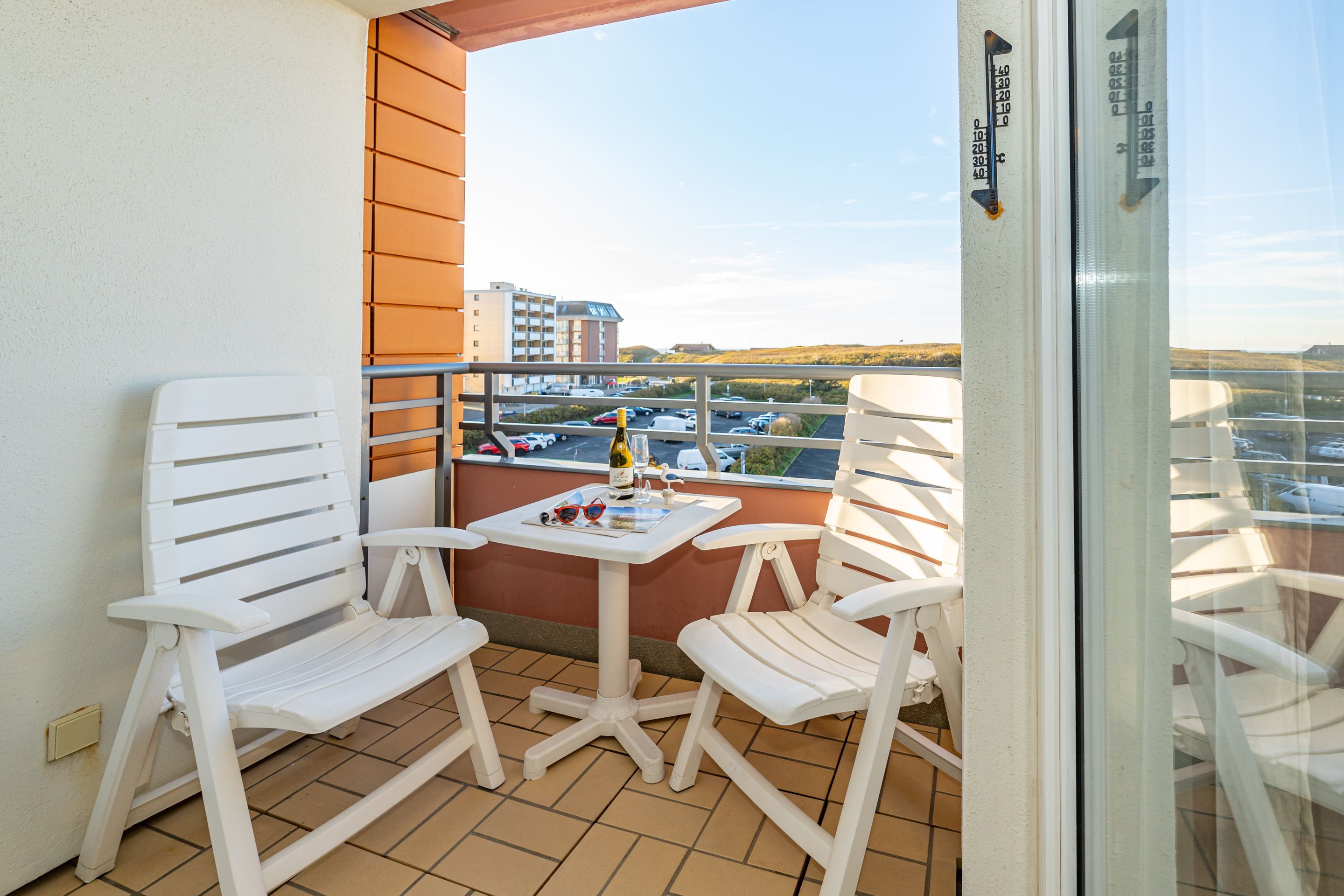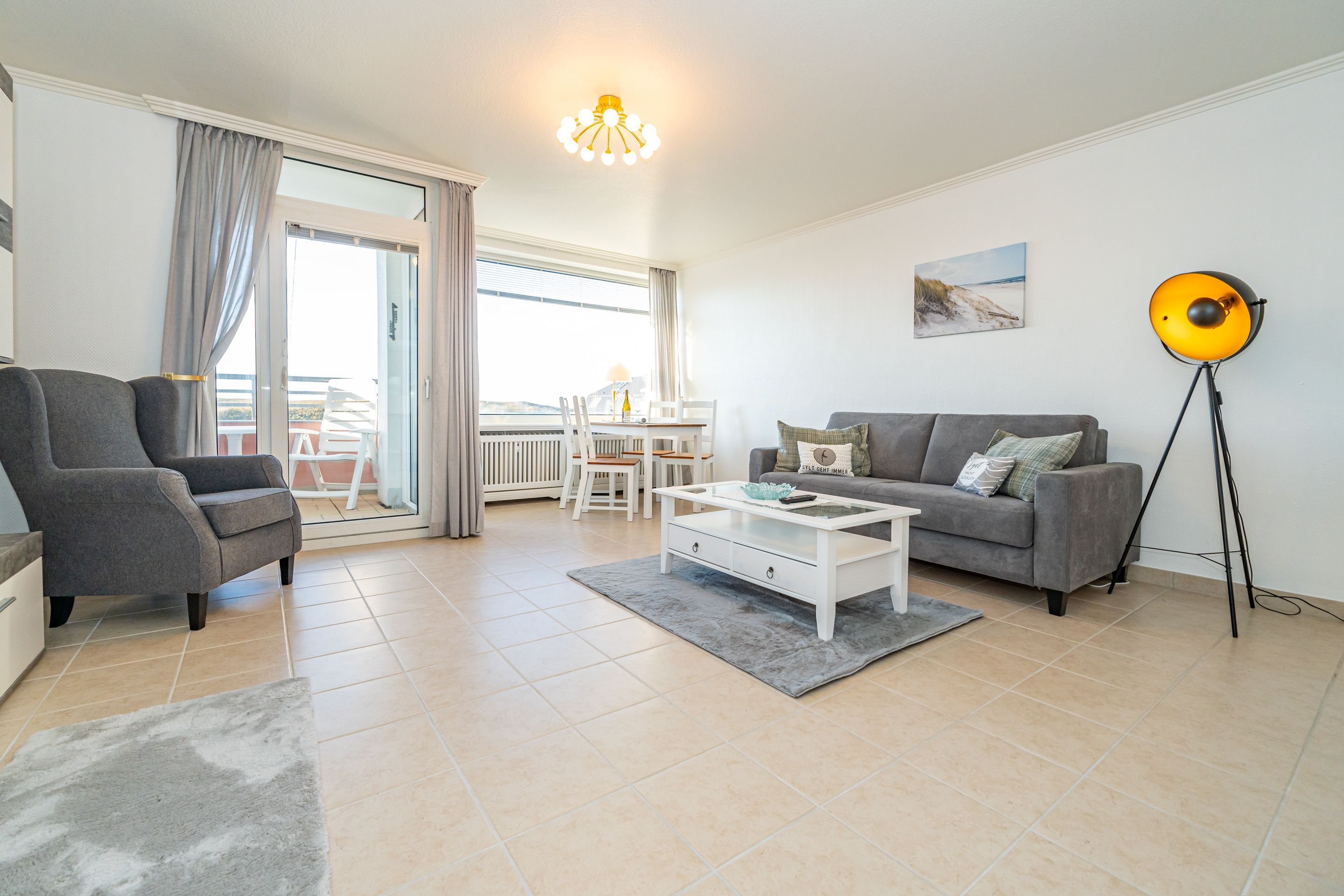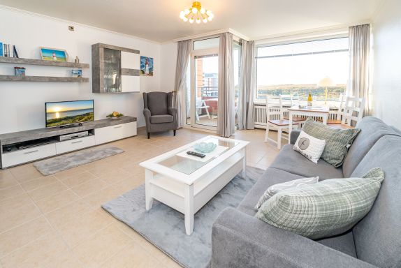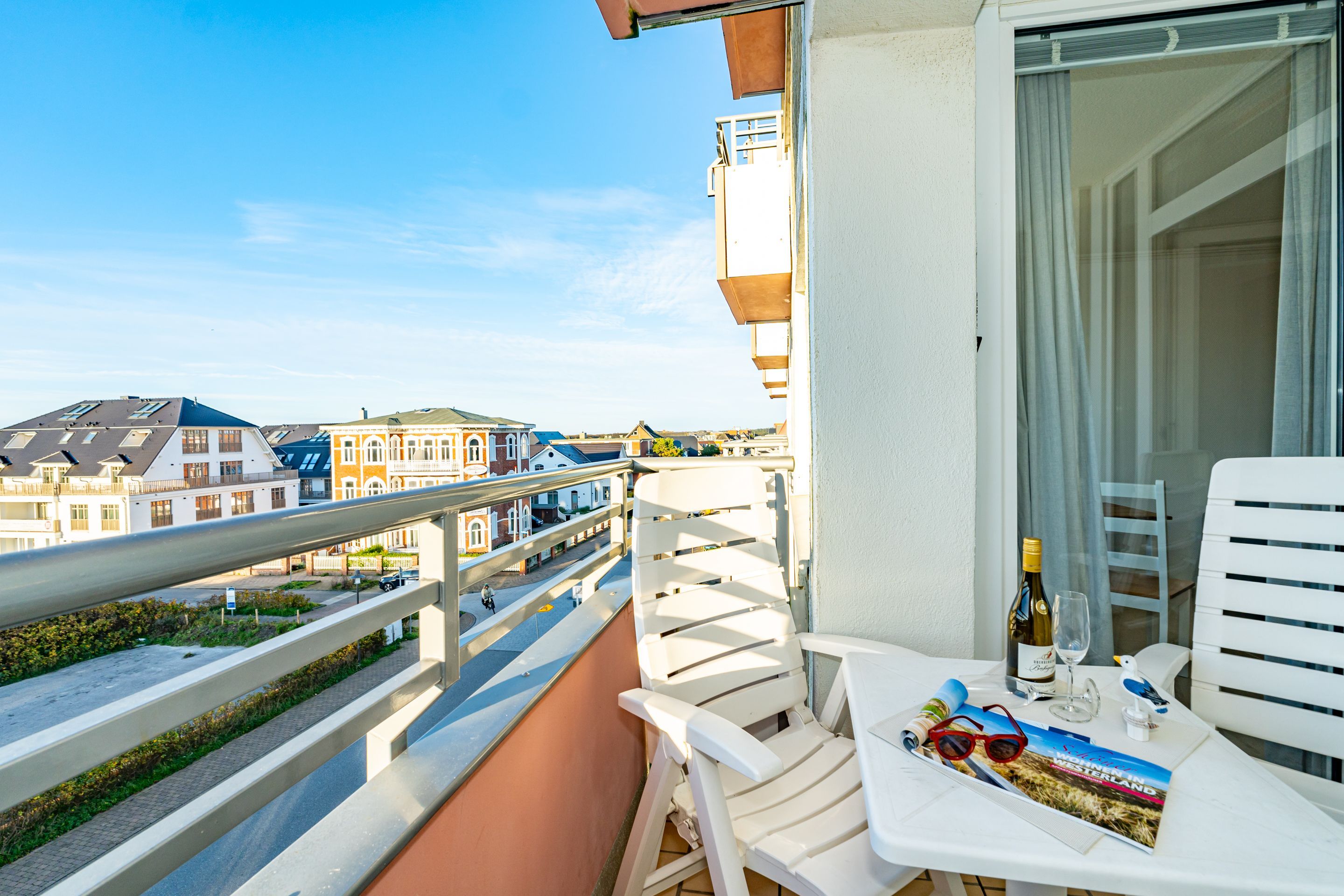 Geschmackvoll eingerichtete 2-Zimmer-Nichtraucher-Ferienwohnung, ca. 54,5 qm, in der 3. Etage zur Westseite für max. 4 Personen mit Westbalkon und Meerblick (Nachmittagssonne, mit Balkonmöbeln und Auflagen).