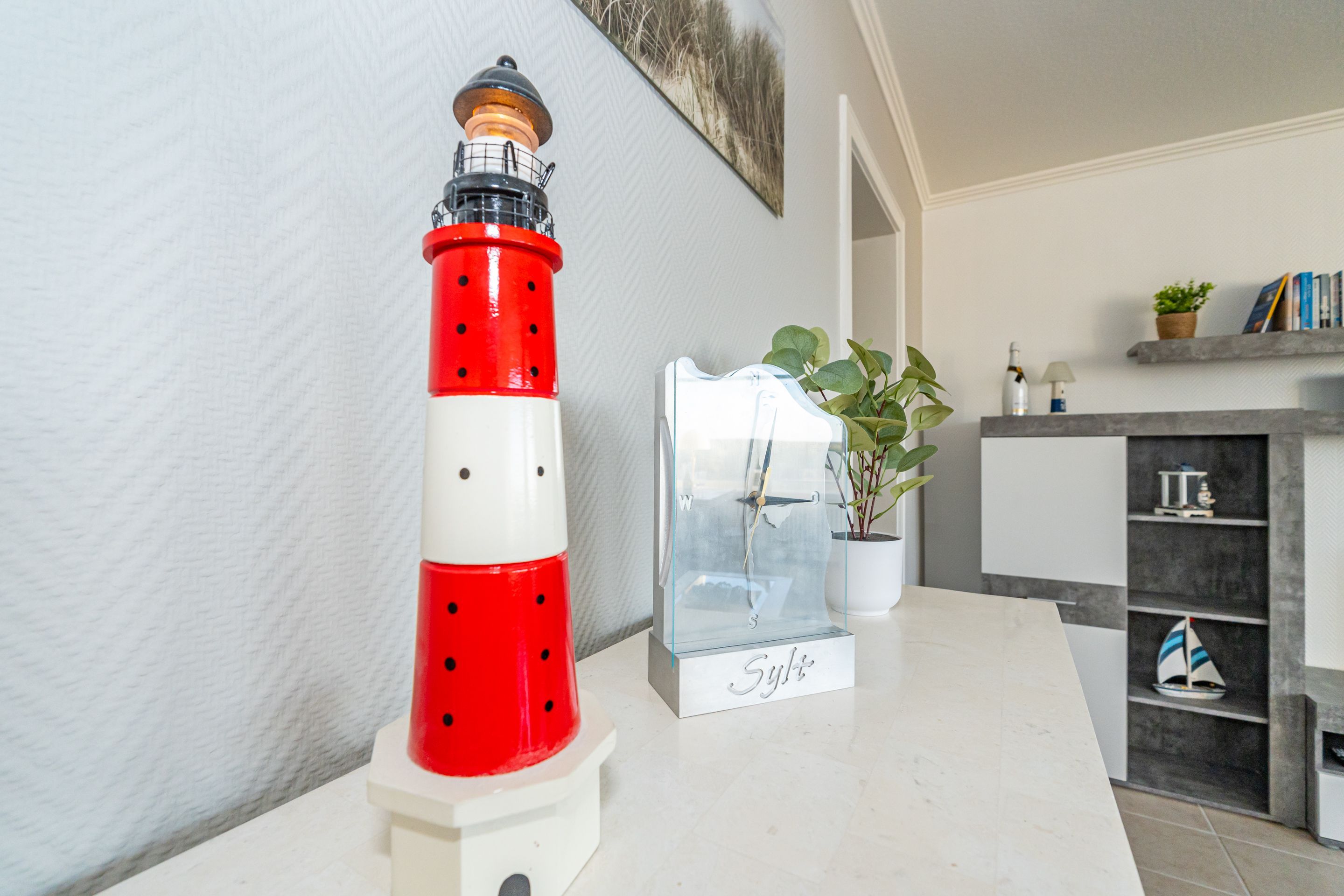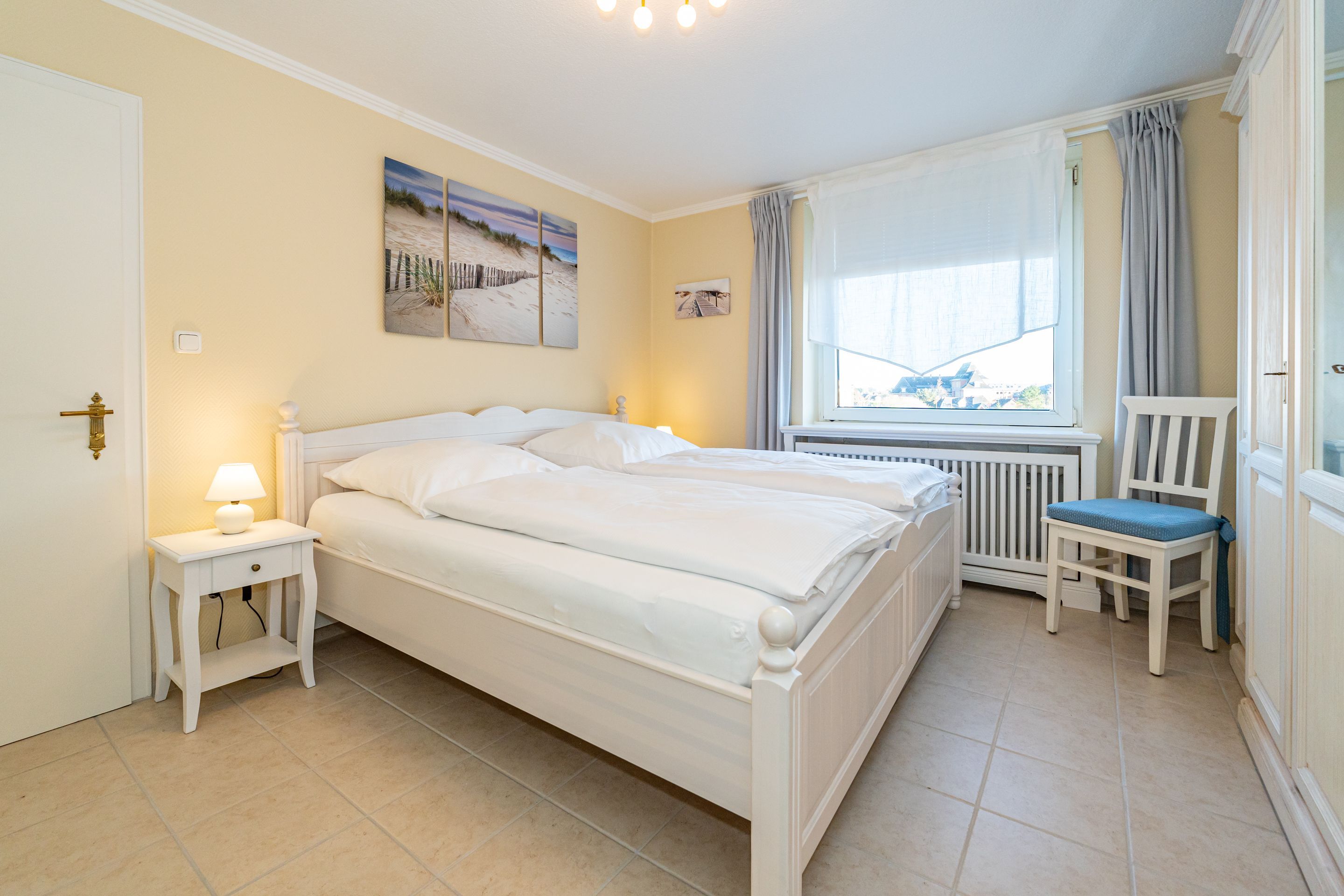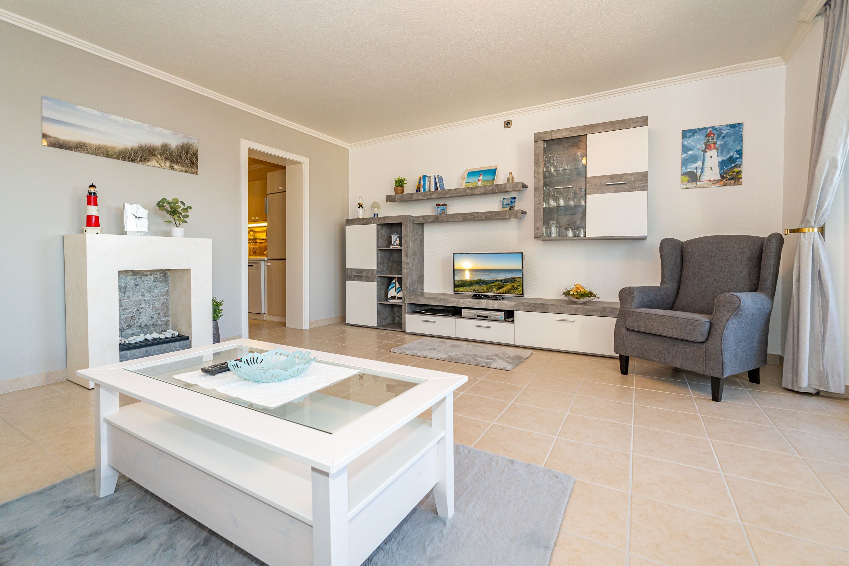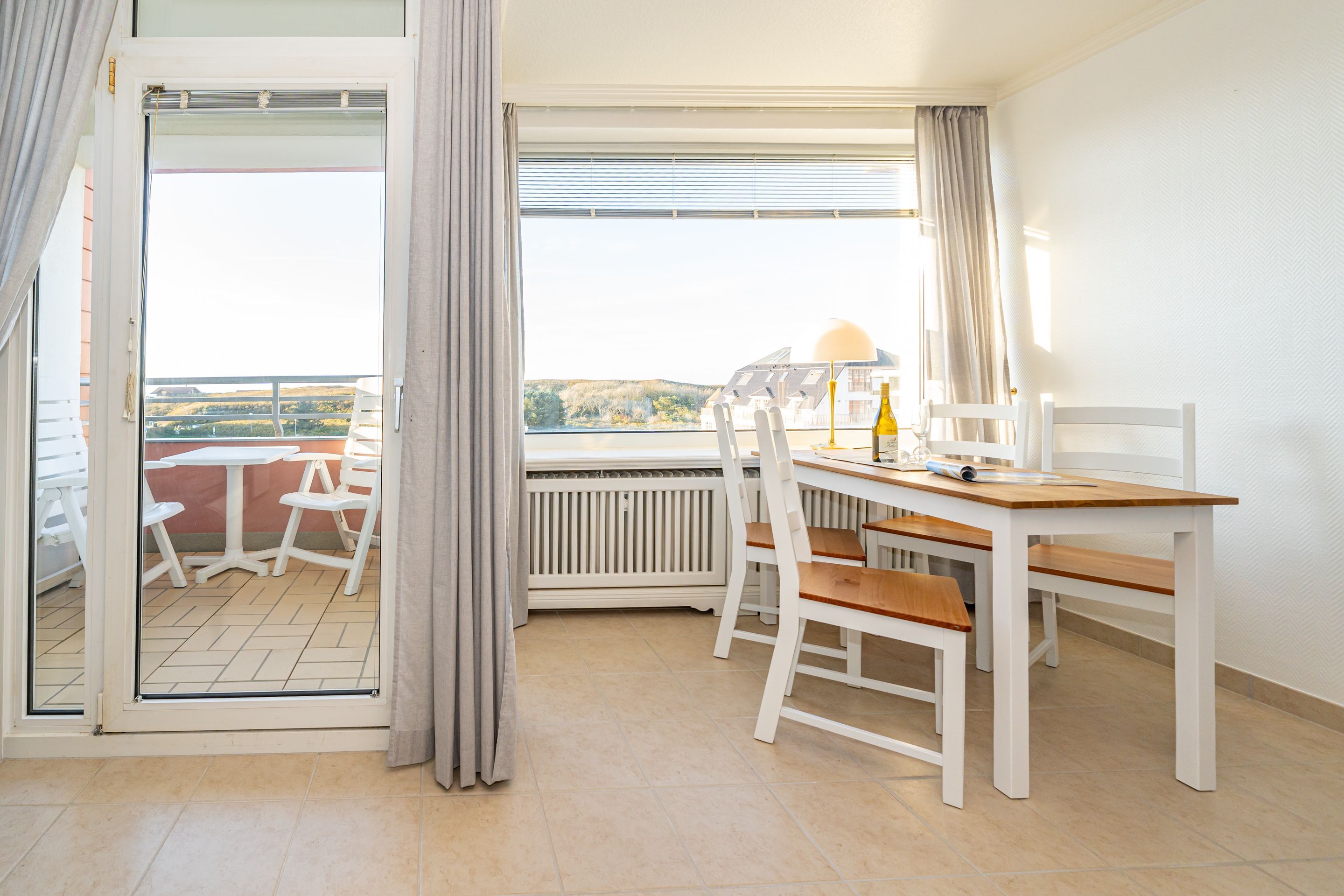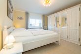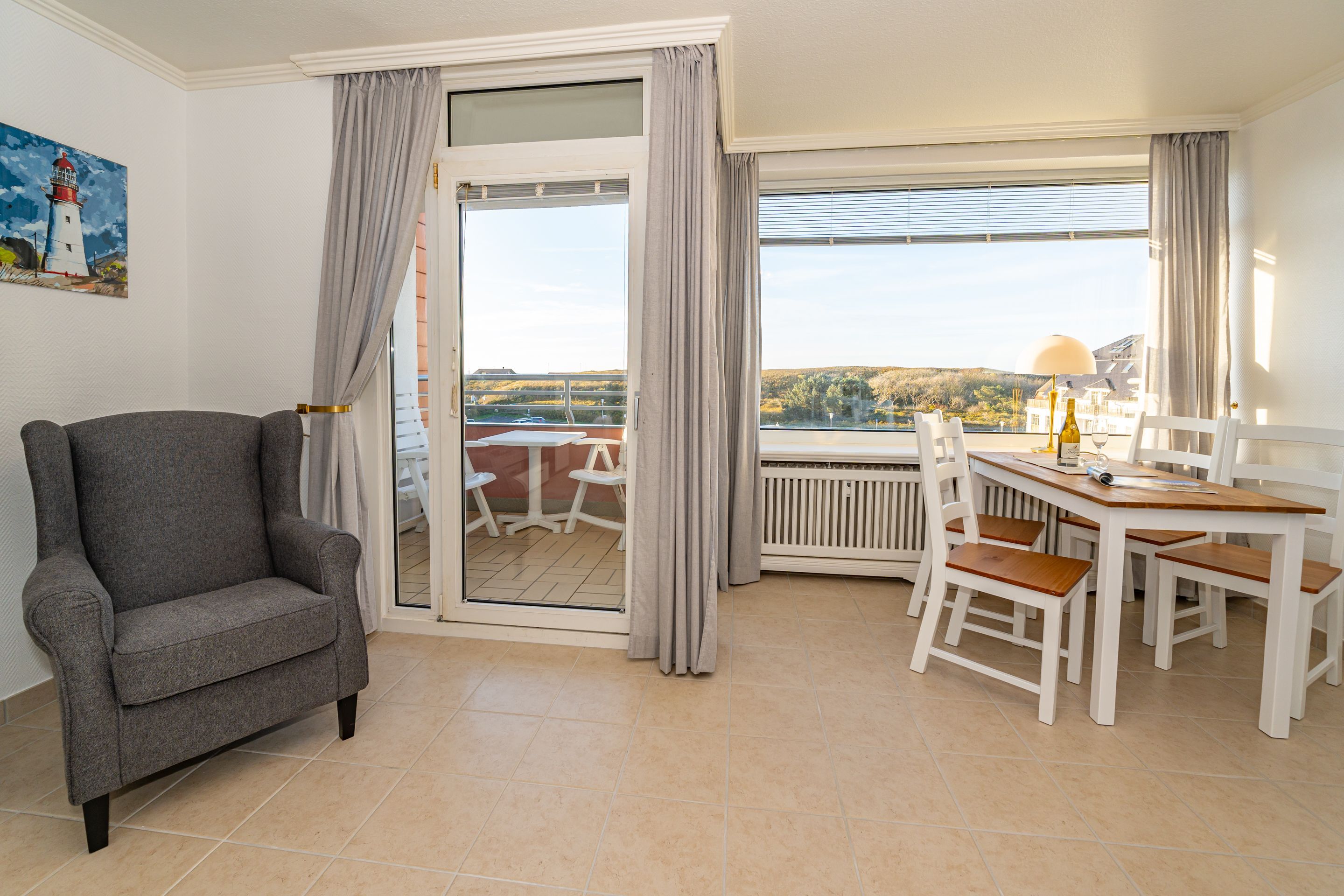 Geschmackvoll eingerichtete 2-Zimmer-Nichtraucher-Ferienwohnung, ca. 54,5 qm, in der 3. Etage zur Westseite für max. 4 Personen mit Westbalkon und Meerblick (Nachmittagssonne, mit Balkonmöbeln und Auflagen).