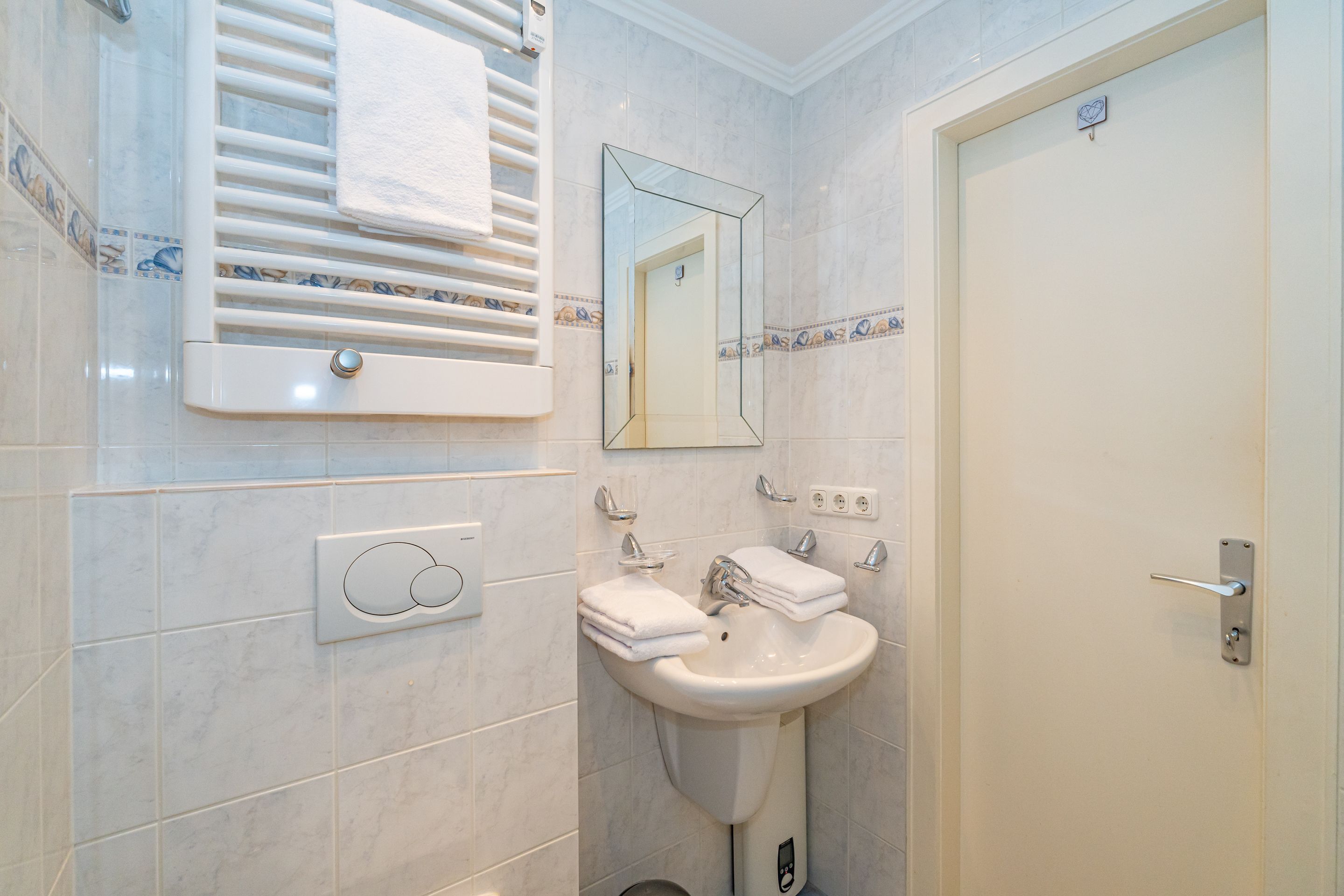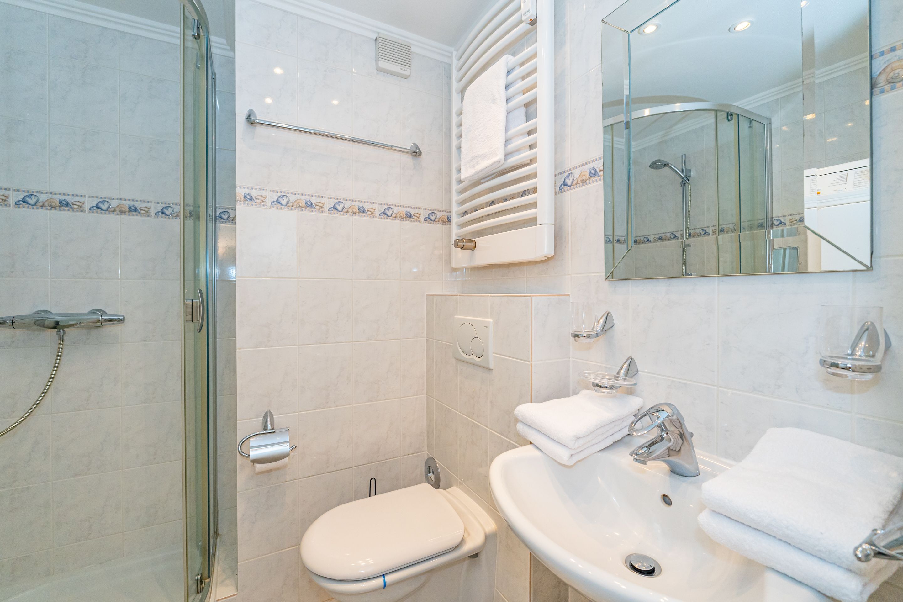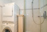 Im Bad befinden sich eine Dusche, ein WC, ein Waschtisch, ein Handtuchtrockner sowie Waschmaschine und Trockner.