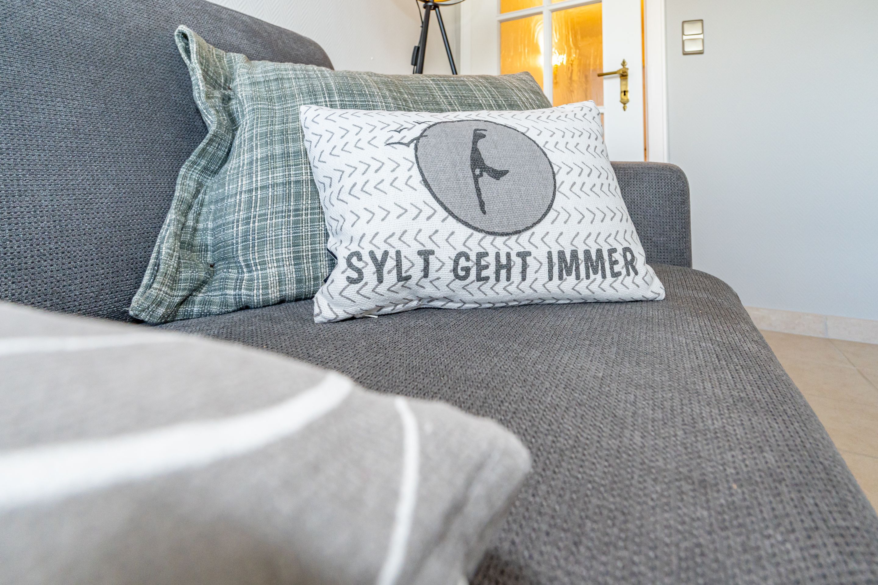 Der Wohnraum besteht aus einem Schlafsofa (Liegefläche 1,40 x 2,00 m) und einem Sessel, sowie einem separaten Essplatz am Fenster und Kabel-Flachbild-TV.