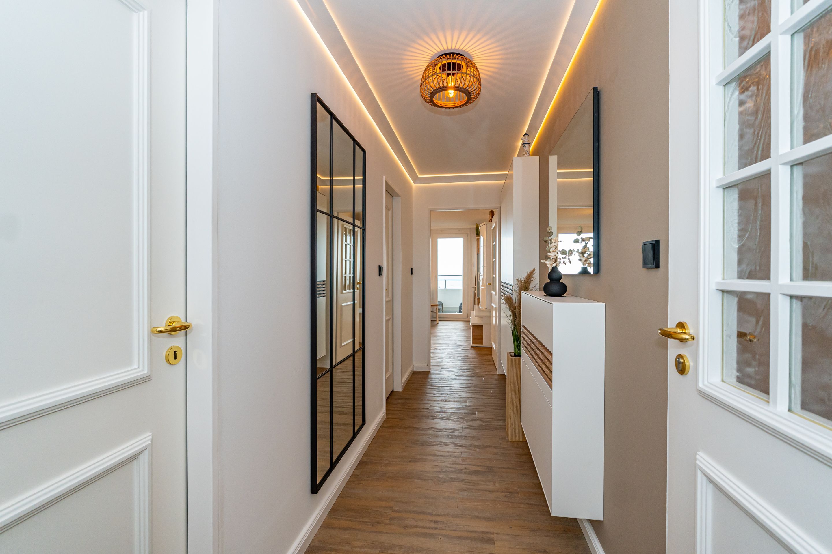 Das lichtdurchflutete Ferienapartment „SYLTERBRISE“, mit zwei zum Meer ausgerichteten Balkonen, befindet sich direkt an der Nordsee und ist Richtung Osten und Westen ausgerichtet. Der phänomenale Meerblick lässt sogar die Erdkrümmung erkennen. Diese traumhafte Konstellation gewährleistet unzählige Sonnenstunden aus der 5. Etage mit einem bezaubernden Blick auf die Nordsee, inkl. phänomenaler Sonnenuntergänge, die zum festen Bestandteil am Abend werden. Sie wohnen in einem großzügigen geschnittenen 3-Zimmer-Apartment (ca. 80 qm) für bis zu 4 Personen, dass modern ausgestattet ist. Zwei Schlafzimmer mit einem hochwertigen Doppelbett (Einzelmatratzen, Liegefläche 1,80 x 2,00 m) und einem Boxspringbett (Einzelmatratzen, Liegefläche 1,80 x 2,00 m) und jeweils 65 Zoll Smart TV, ein Wohnraum mit 65 Zoll Smart TV, Essplatz, voll ausgestattetem Küchenbereich (Kochen mit Meerblick), ein Badezimmer mit Regendusche und WC, ein weiteres Badezimmer mit Wanne und WC. Ein Schlafzimmer bietet einen Businessarbeitsplatz mit LAN und WLAN für Homeoffice, ein weiterer Businessarbeitsplatz befindet sich im großzügigen Flur. Sie können hier sogar während Ihrer Arbeitszeit Urlaub machen. Der direkt an das Wohnzimmer angrenzende Essbereich bietet eine offene Einbauküche im gehobenen Standard und Zugang auf den angrenzenden Balkon. In der „SYLTERBRISE“ wird ein unvergesslicher und erholsamer Urlaub garantiert. Vom Wohnzimmer aus gelangt man über den Flur in die einladenden Schlafzimmer, eines davon mit einem herrlichen Meerblick. Besonders an Sommertagen ist das Lichtspiel des Himmels zum Abend hin wunderschön und der Sonnenuntergang lässt sich auf den gemütlichen Balkonmöbeln genießen. Durch die großen Fensterflächen gelangt sehr viel Licht in jedes einzelne Zimmer, sodass diese zu jeder Tageszeit hell und einladend wirken und dem Bewohner sofort ein Gefühl von Urlaub vermitteln. Die „SYLTERBRISE“ liegt sehr zentral zum Strand und Zentrum. Ein gemeinschaftlicher Waschraum mit Waschmaschine und Trockner (über einen Münzautomaten) steht unseren Gästen ebenfalls zur Verfügung. Bei Anreise mit dem Auto gibt es die Möglichkeit, einen Parkplatz vor dem Haus zu nutzen (Parkplatz der Gemeinde, Münzeinwurf).