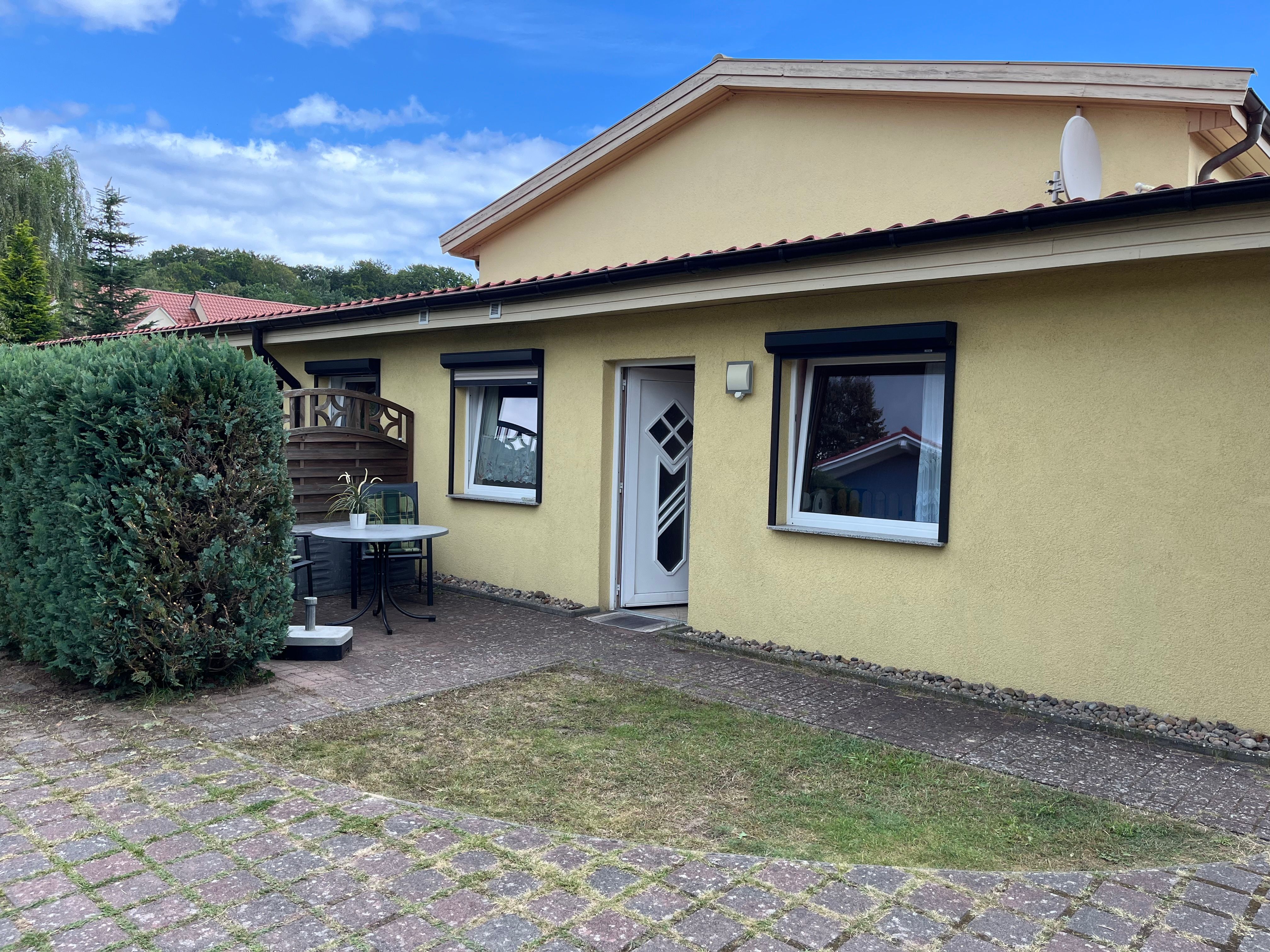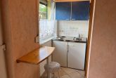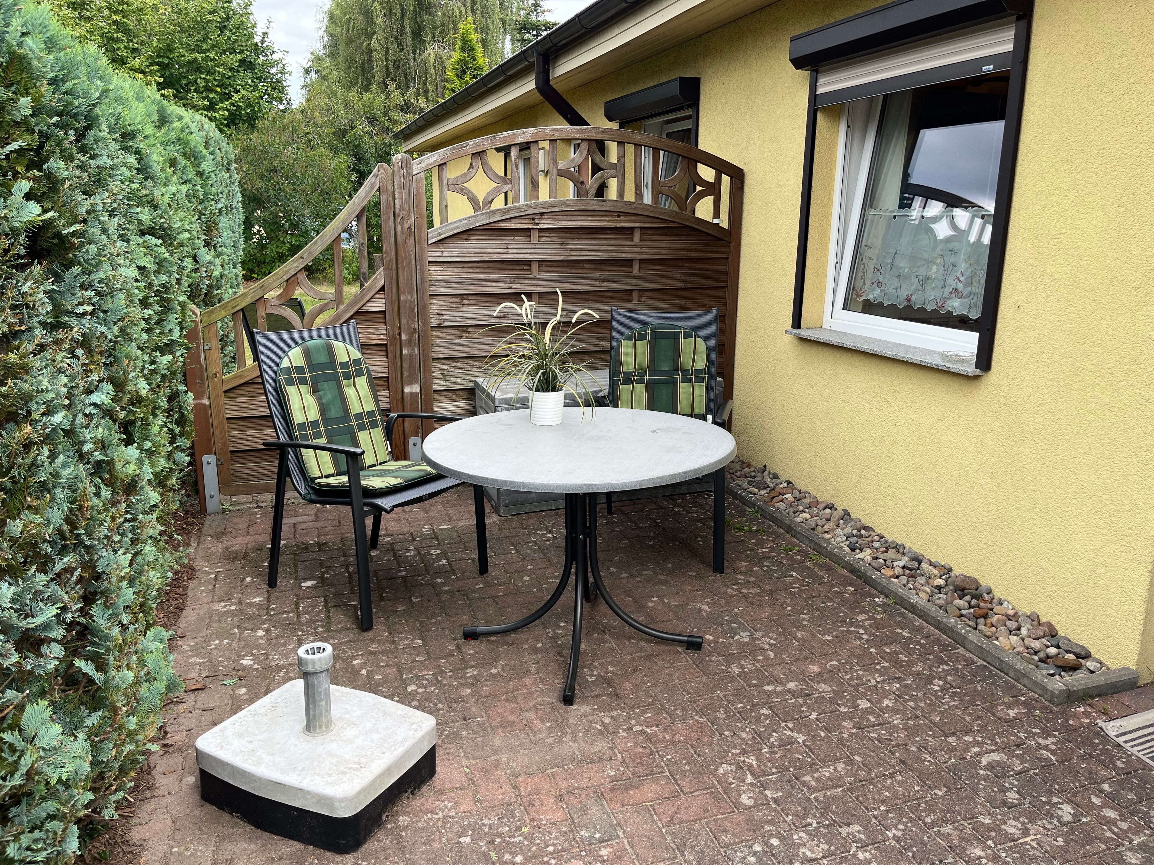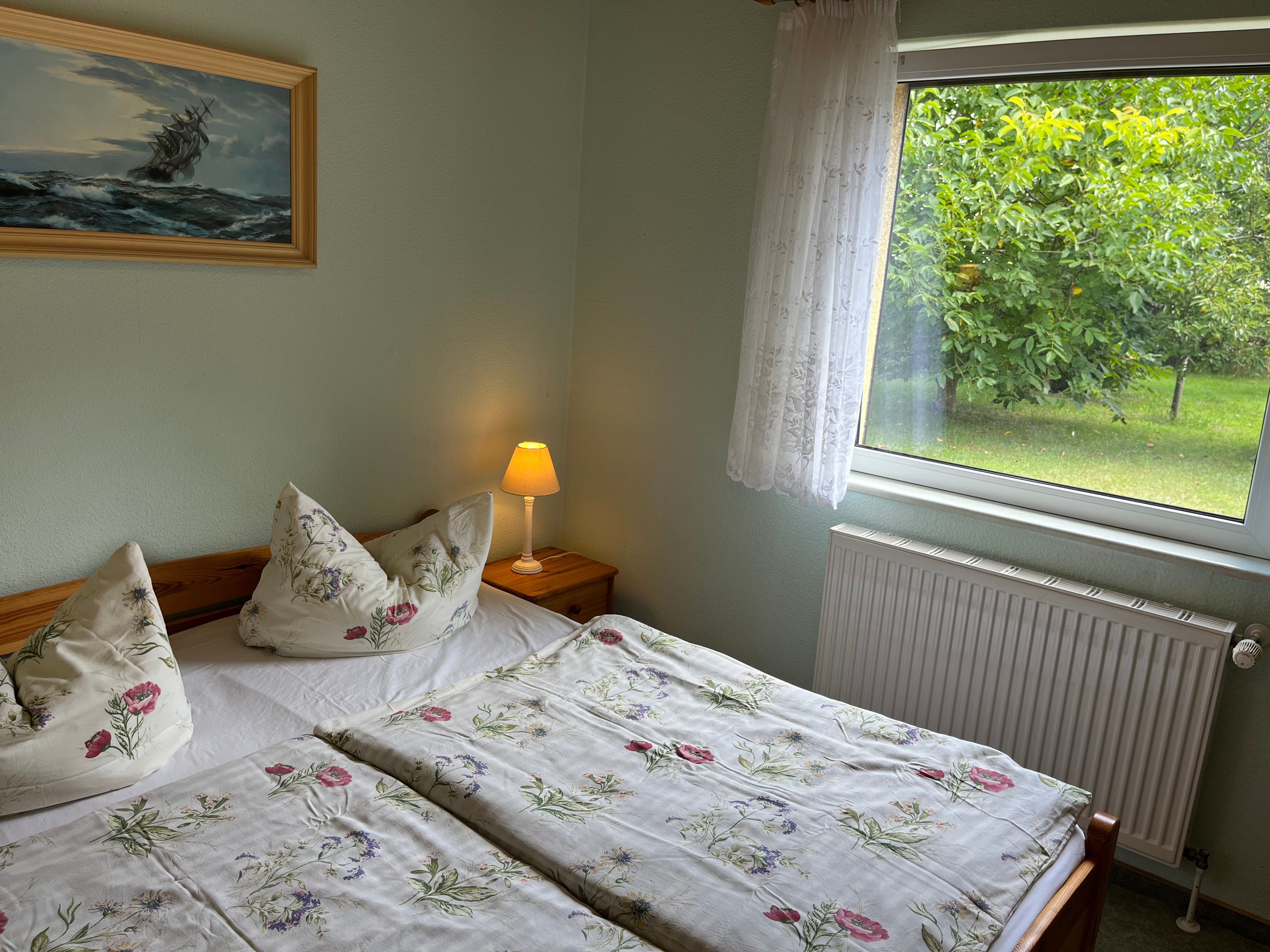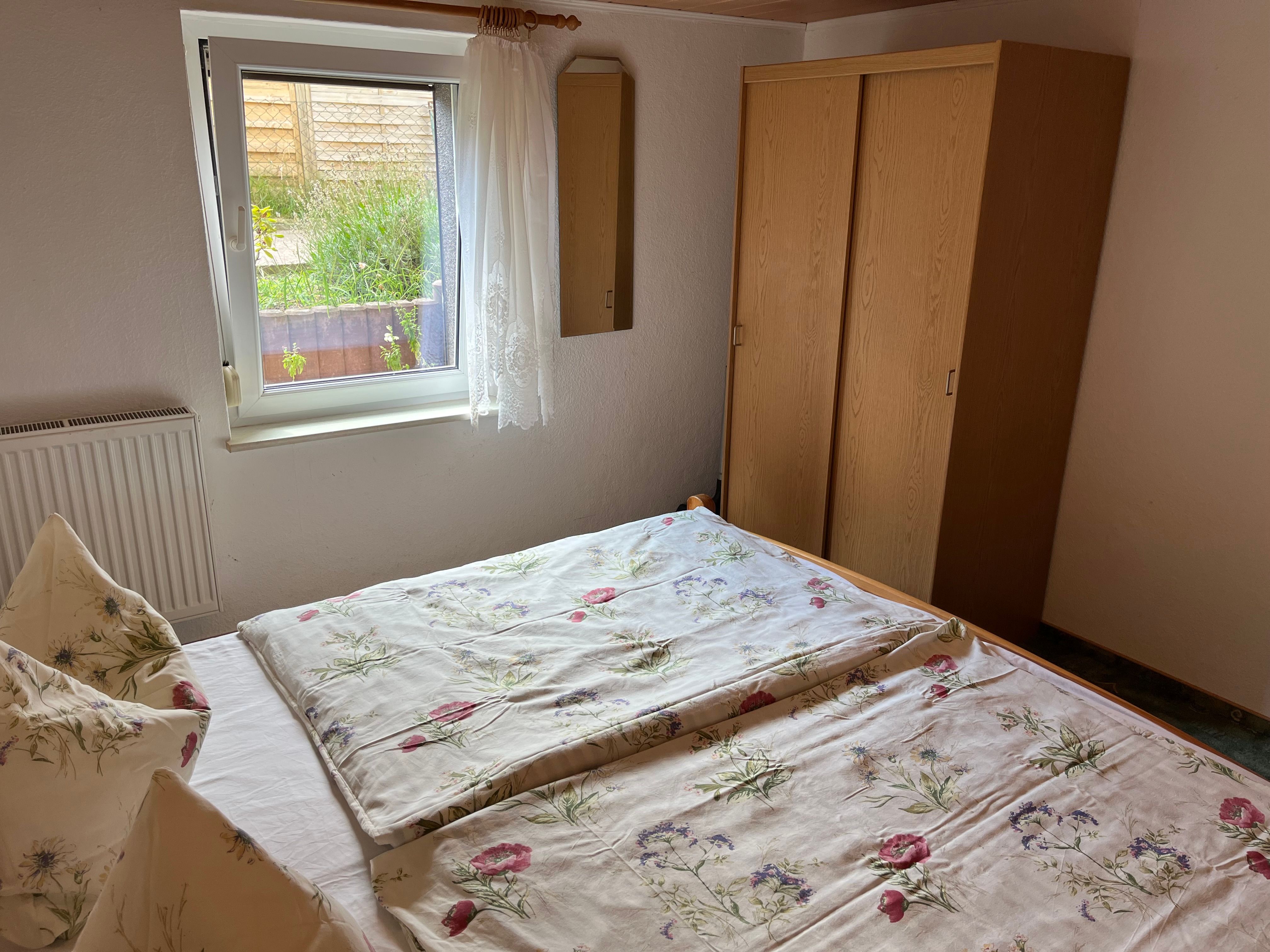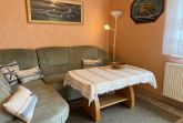 2-Raum-Ferienwohnung im Erdgeschoß, einfach und zweckmäig eingerichtet. Wohnzimmer mit kleine Kochnische mit 2-Plattenherd, Kühlschrank, Mikrowelle, Toaster, Wasserkocher und Kaffeemaschine. 1 Schlafzimmer im Souterrain mit Doppelbett. Bad mit Dusche und WC. Terrasse direkt an der Wohnung mit Gartenmöbel.