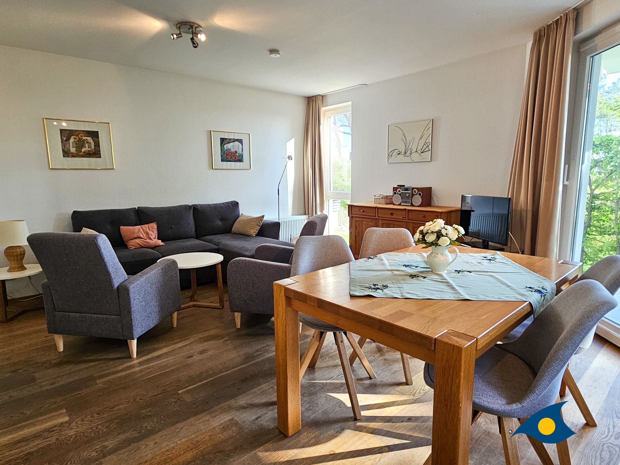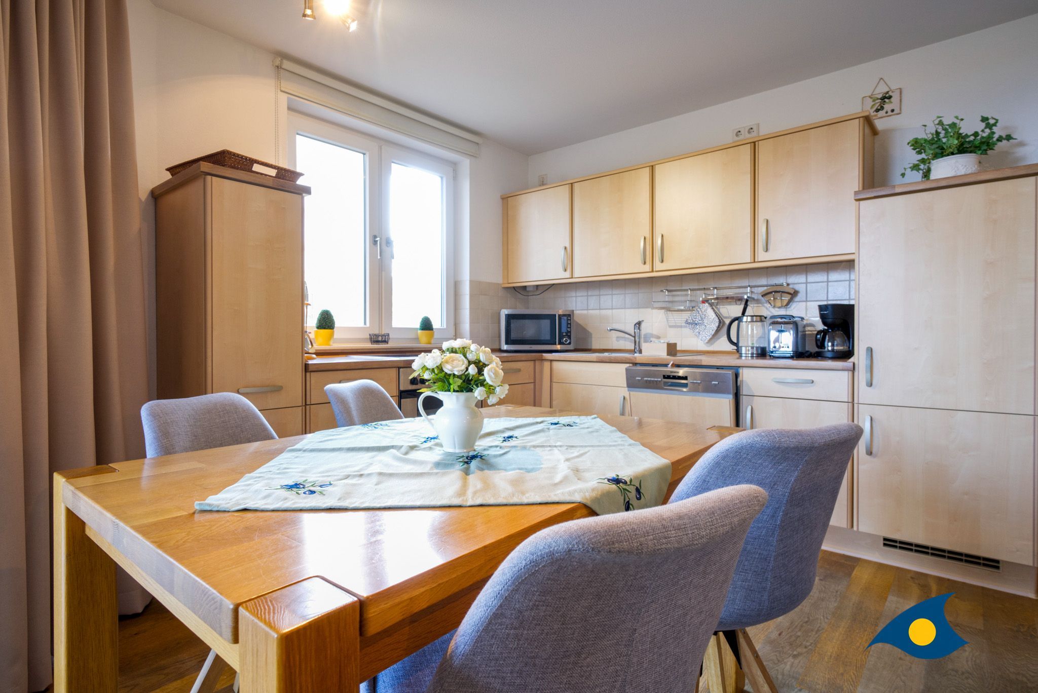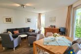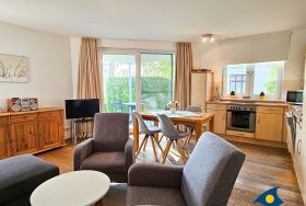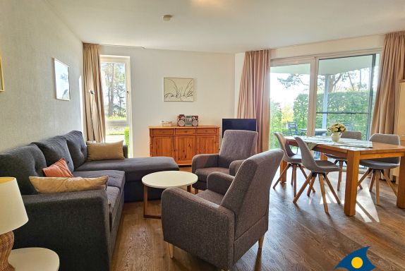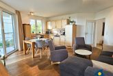 Der großzügige Wohnbereich besticht durch seine geschmackvolle Einrichtung und eine offene, voll ausgestattete Küche, perfekt für kulinarische Erlebnisse. Von hier aus haben Sie direkten Zugang zur überdachten Terrasse, die mit einem herrlichen Blick auf die Ostseedünen und das Meer begeistert. Eine gemütliche große Eckcouch mit Schlaffunktion für die 3. und 4. Person, zwei komfortable Sessel und ein Flachbild-TV laden zu entspannten Abenden ein. Die Essecke bietet ausreichend Platz für gemeinsame Mahlzeiten.