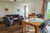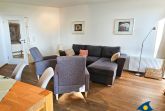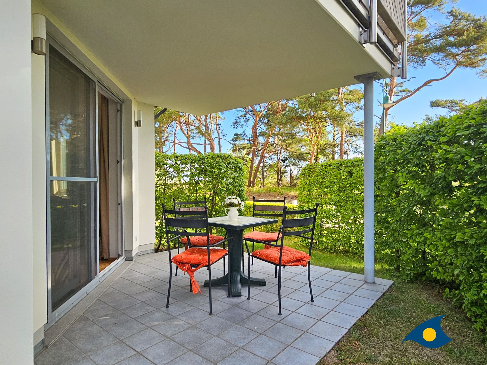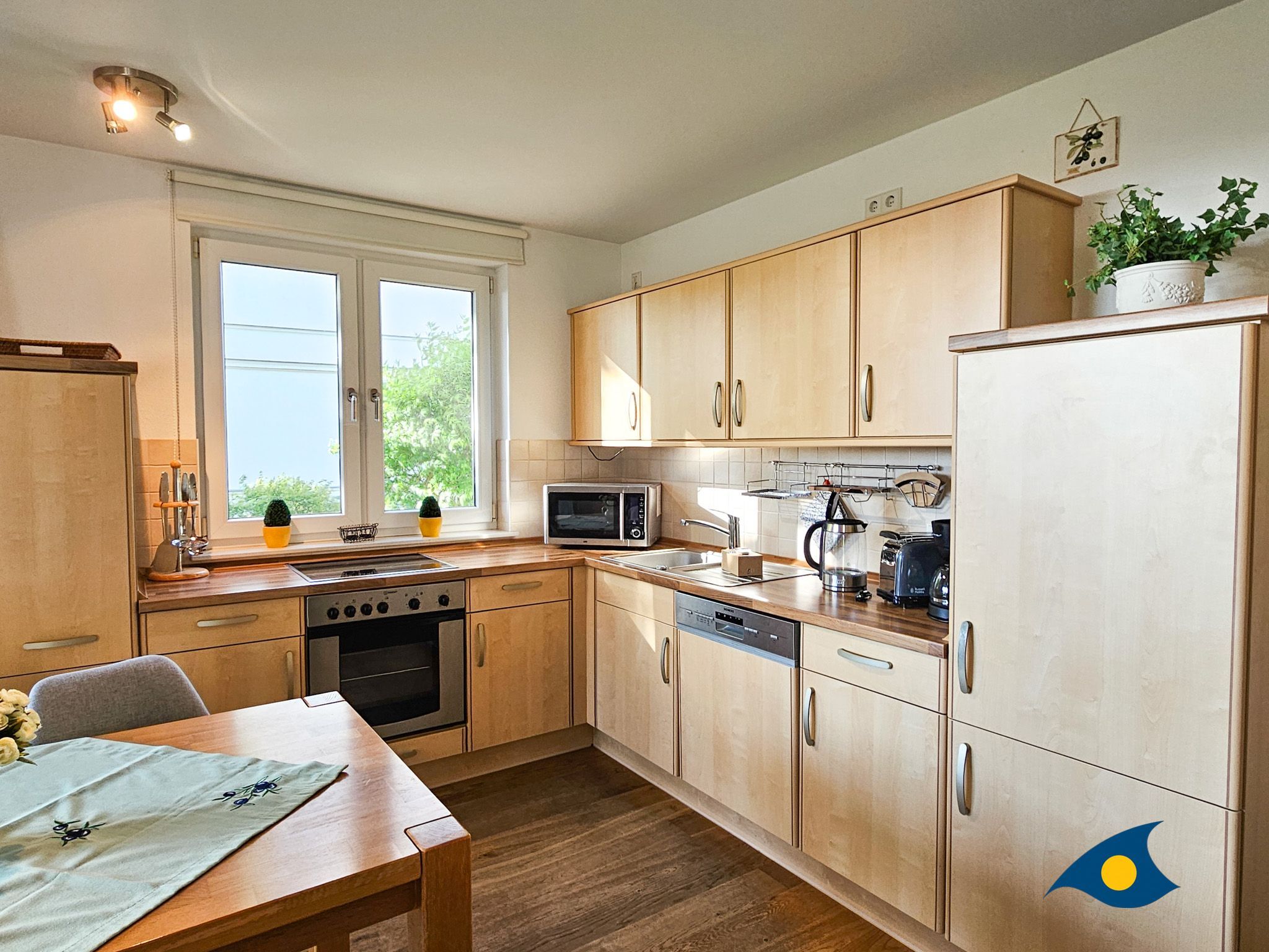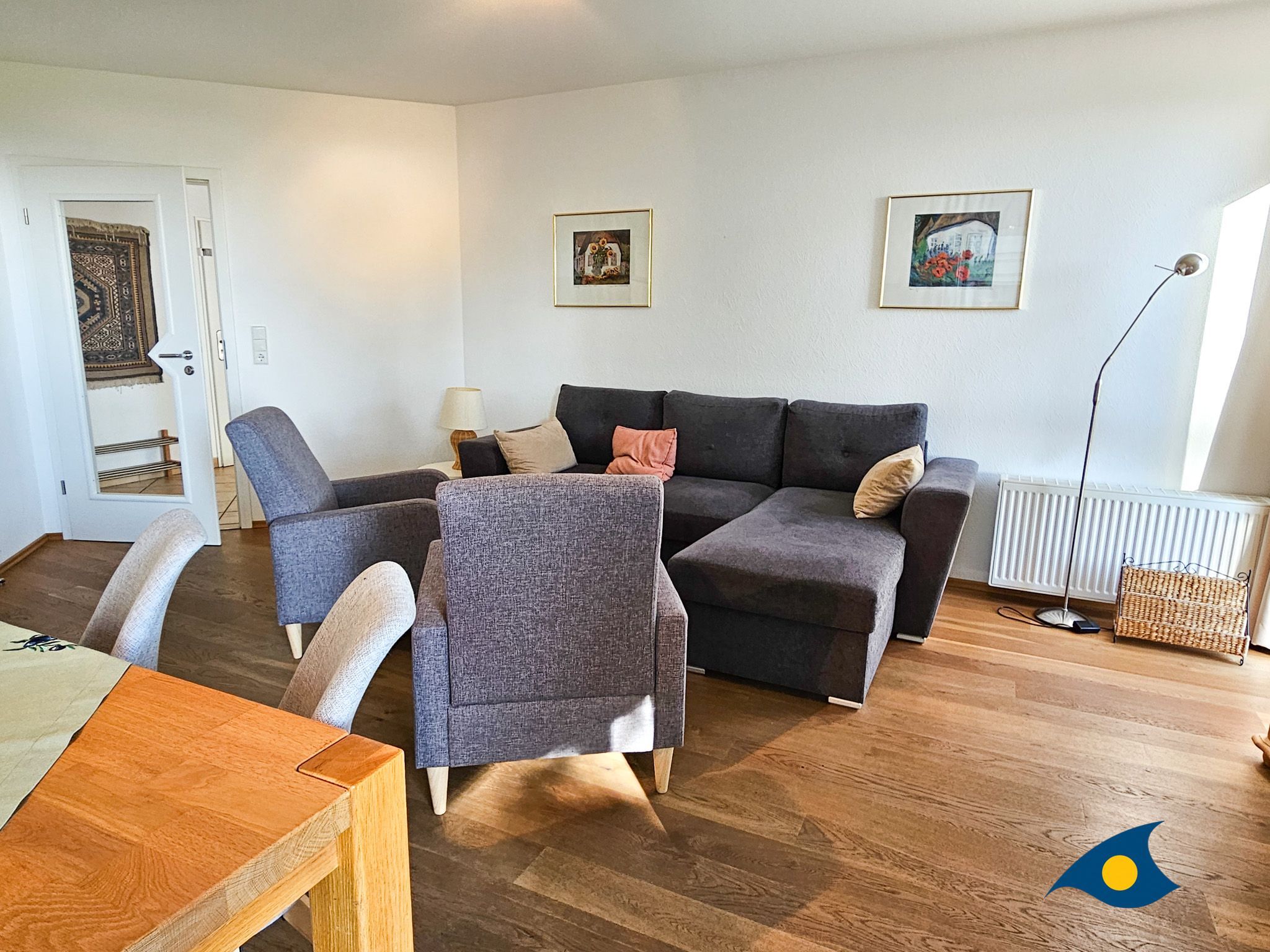 Der großzügige Wohnbereich besticht durch seine geschmackvolle Einrichtung und eine offene, voll ausgestattete Küche, perfekt für kulinarische Erlebnisse. Von hier aus haben Sie direkten Zugang zur überdachten Terrasse, die mit einem herrlichen Blick auf die Ostseedünen und das Meer begeistert. Eine gemütliche große Eckcouch mit Schlaffunktion für die 3. und 4. Person, zwei komfortable Sessel und ein Flachbild-TV laden zu entspannten Abenden ein. Die Essecke bietet ausreichend Platz für gemeinsame Mahlzeiten.