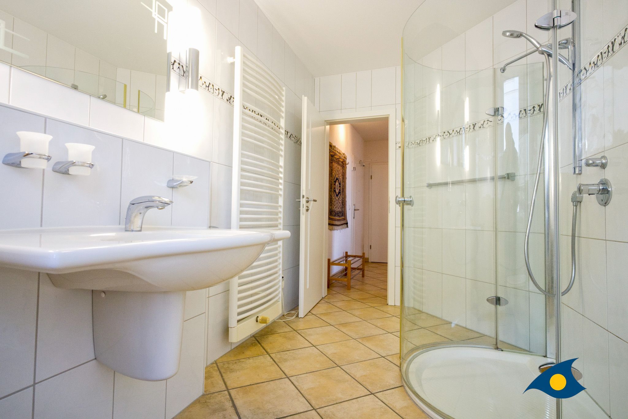 Das großzügige Tageslichtbad ist modern gestaltet und mit einer ebenerdigen Dusche ausgestattet, die höchsten Komfort bietet.