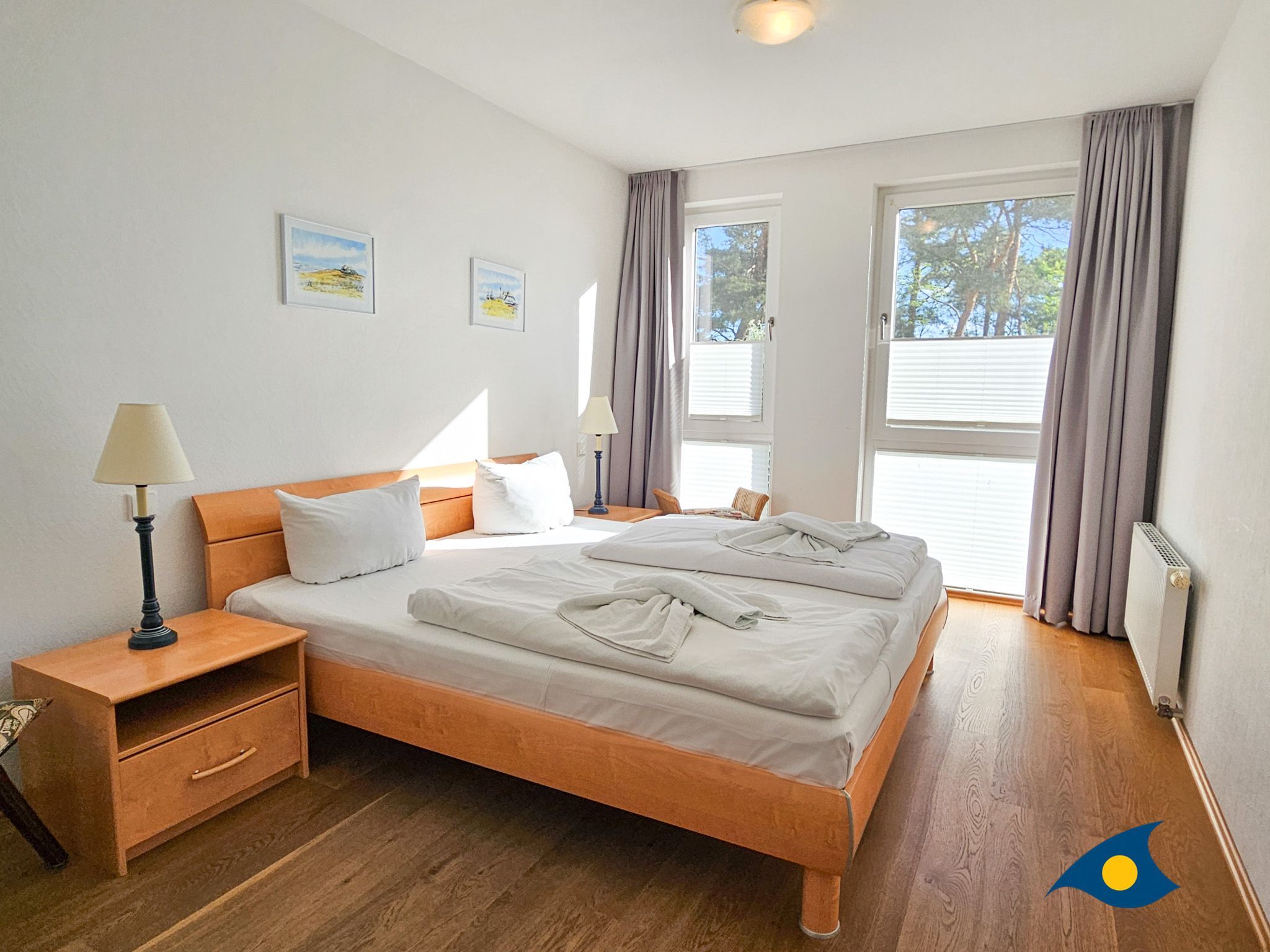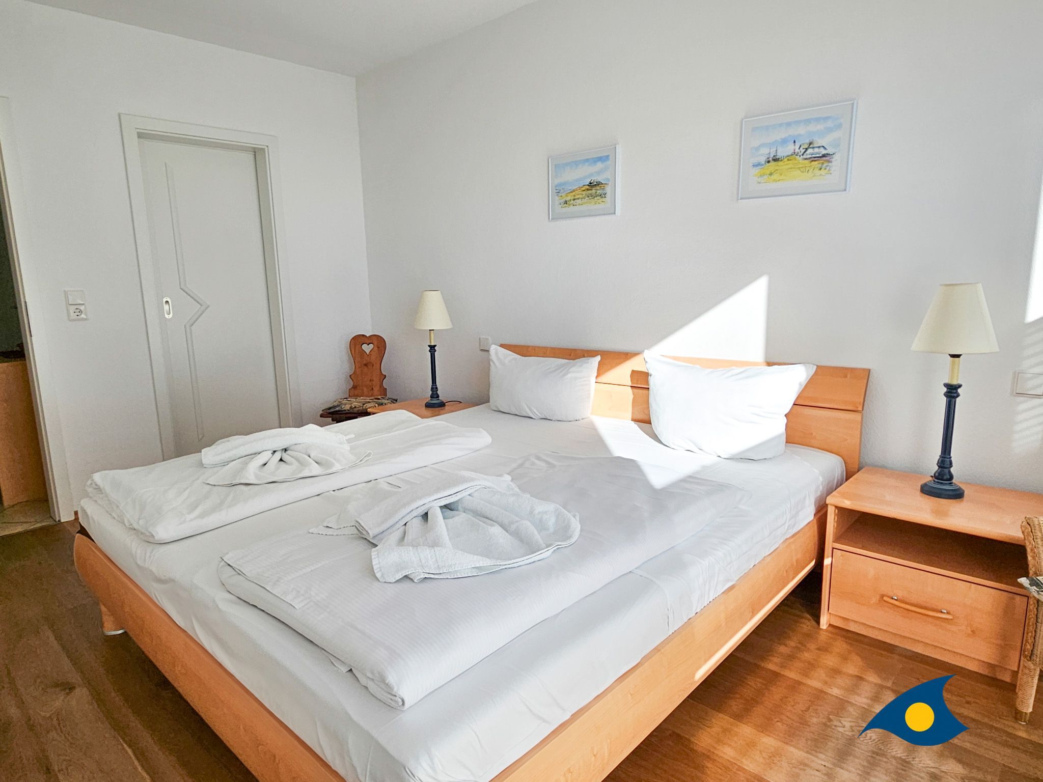 Das gemütliche Schlafzimmer mit dem bequemen Doppelbett ist ebenfalls meerseitig gelegen und sorgt für erholsame Nächte. Der große begehbare Kleiderschrank bietet genügend Ablagemöglichkeiten für Ihre Urlaubsgarderobe.