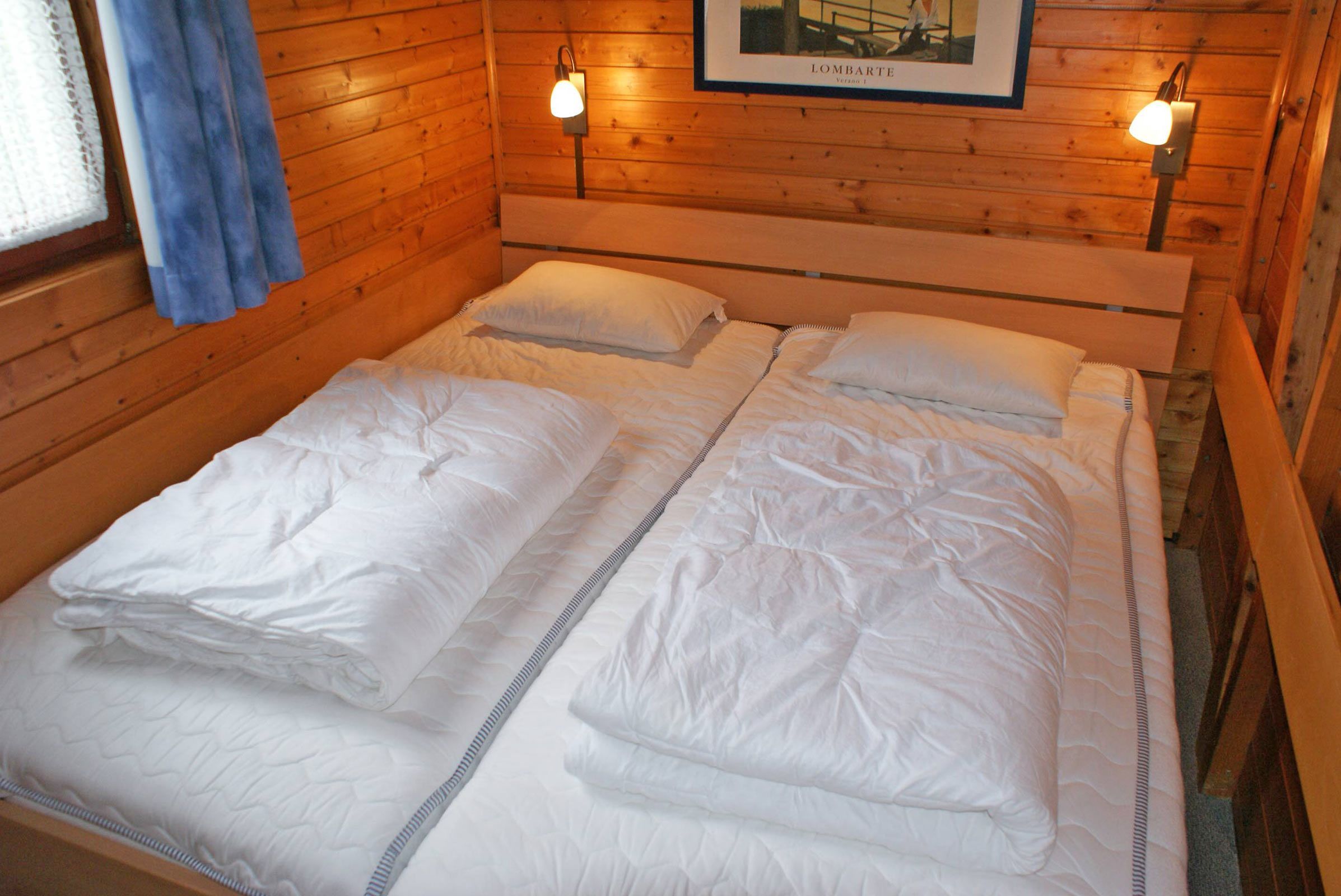 Blockhaus mit grosser Rasenfläche und eigenem Pkw-Stellplatz, ideal für Urlauber mit bis zu 4 Personen.