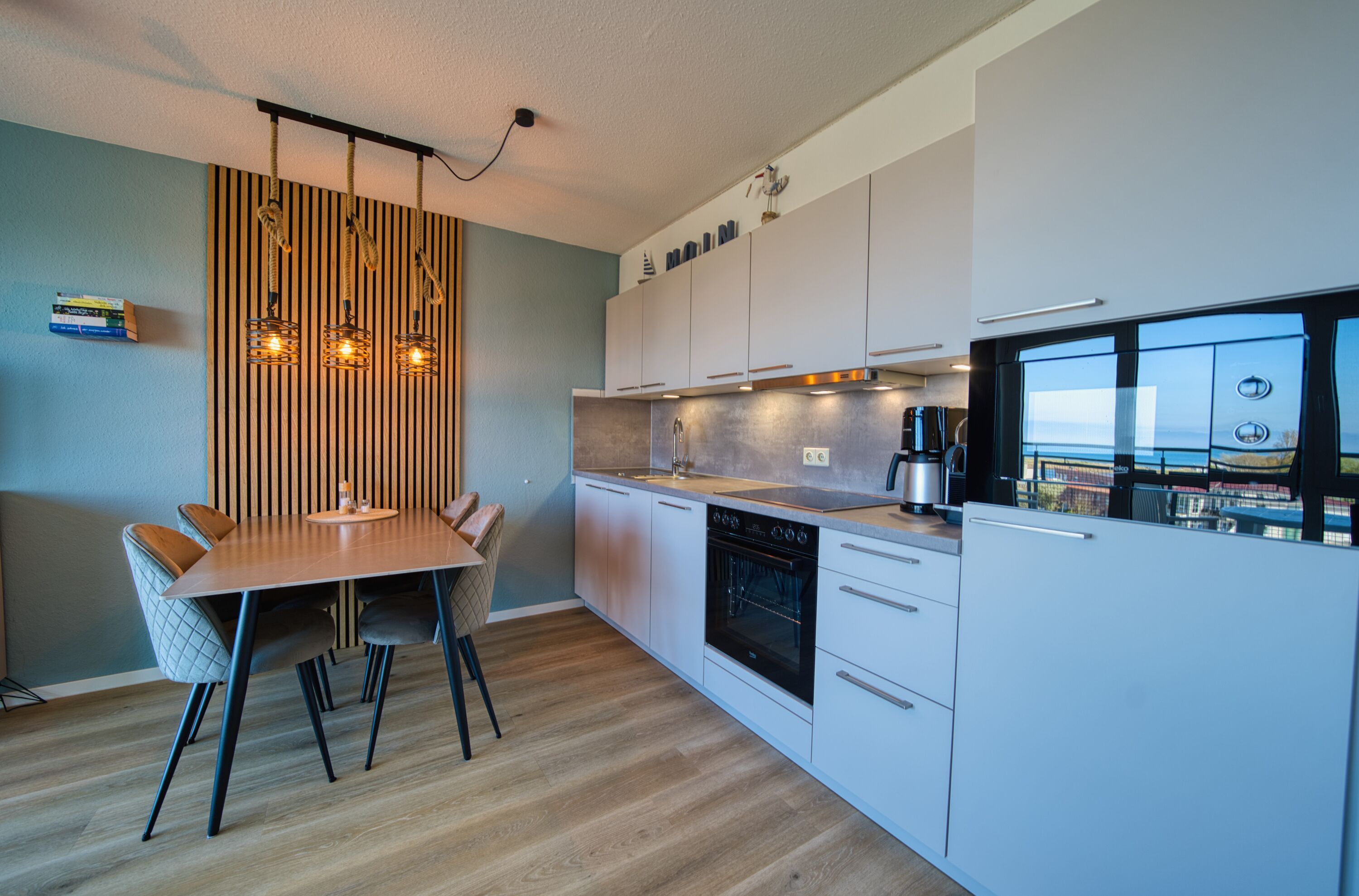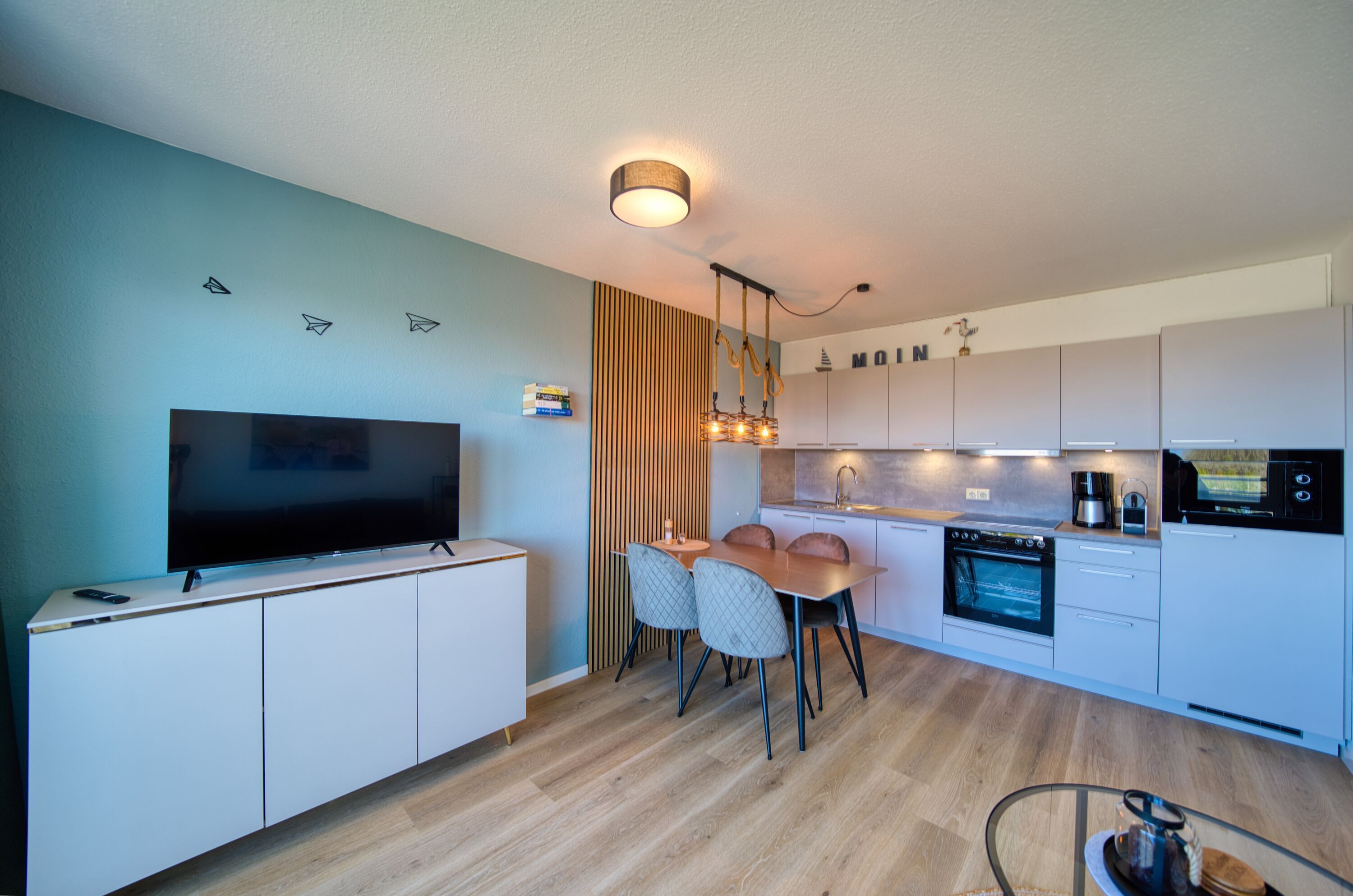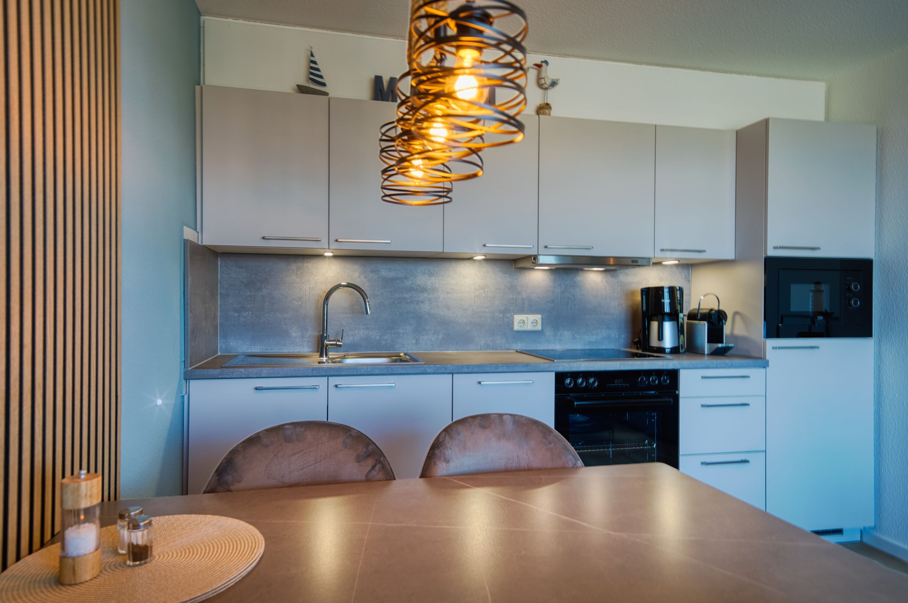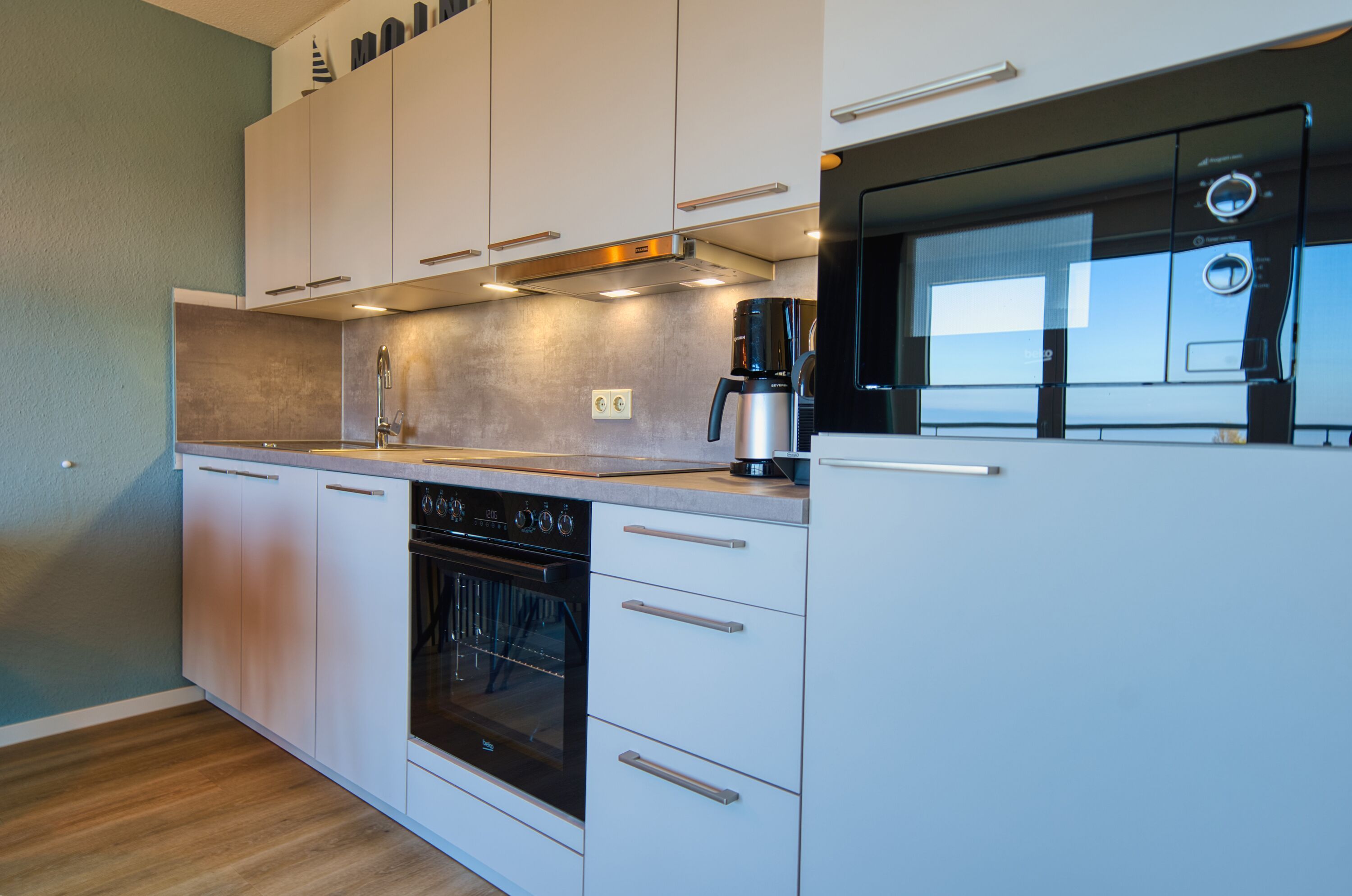 Offene, moderne Einbauküche mit Cerankochfeld, Backofen, Mikrowelle, Filterkaffeemaschine, Wasserkocher und Geschirrspüler