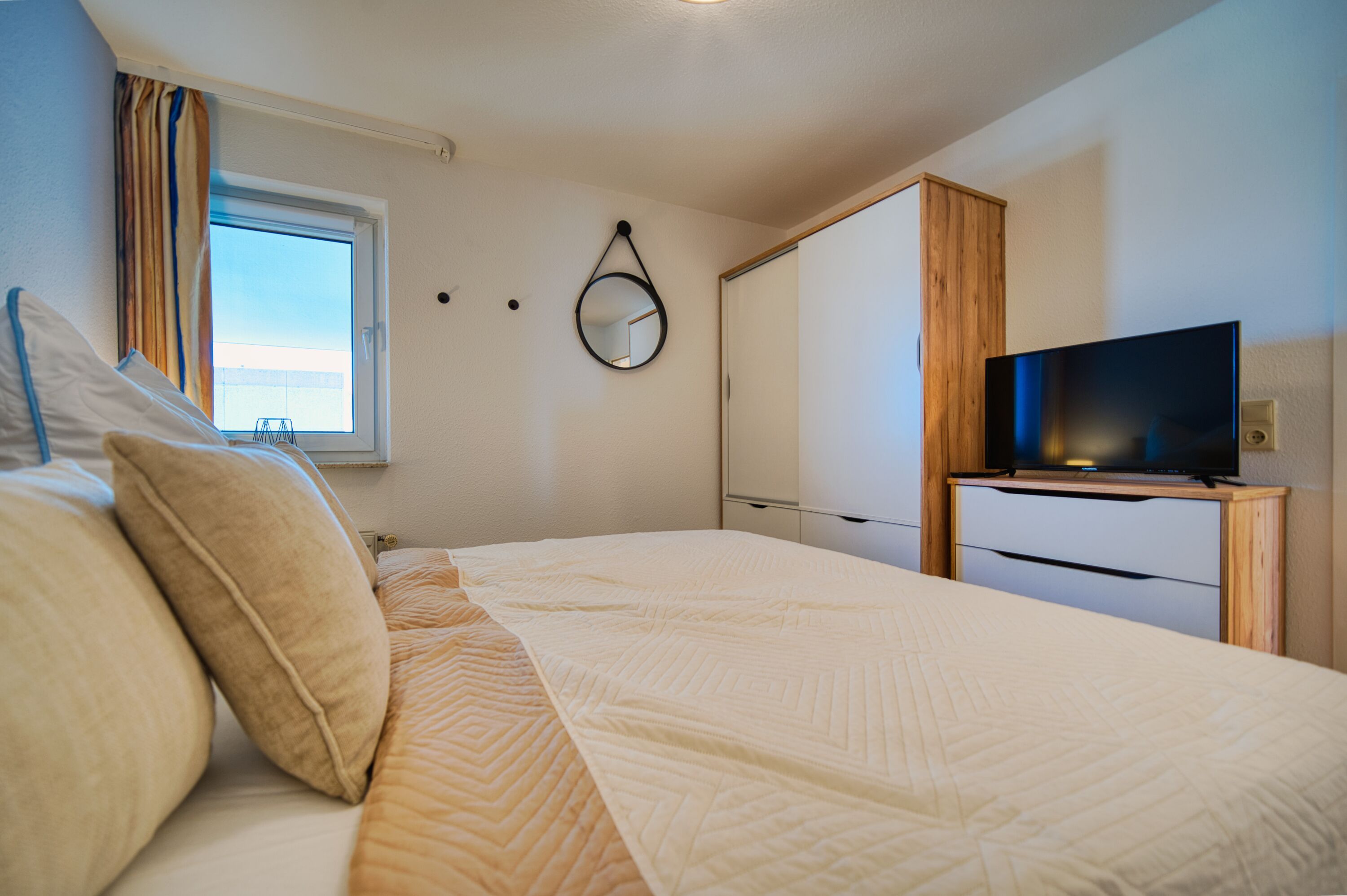 Separates Schlafzimmer mit Doppelbett (180x200 cm), weiterem TV, Kleiderschrank und Kommode