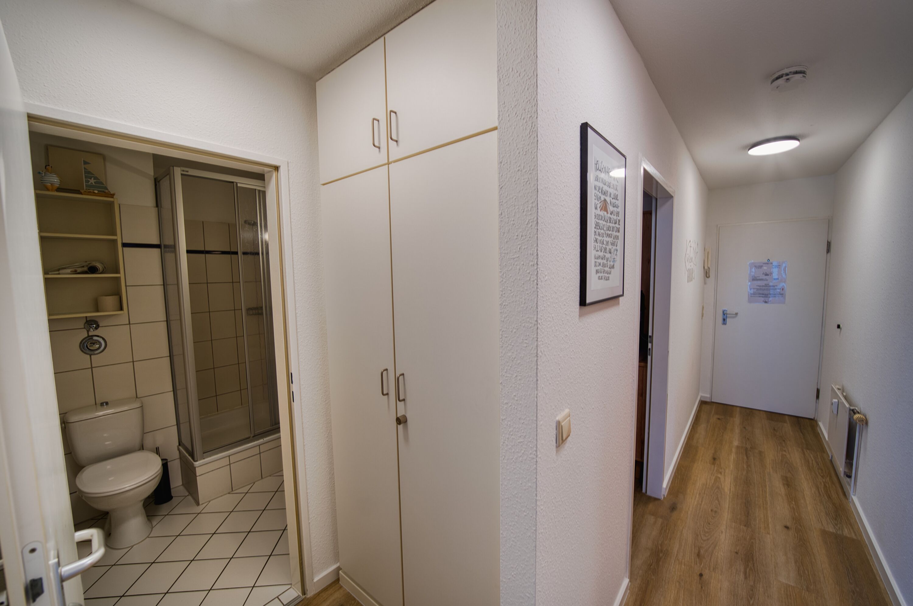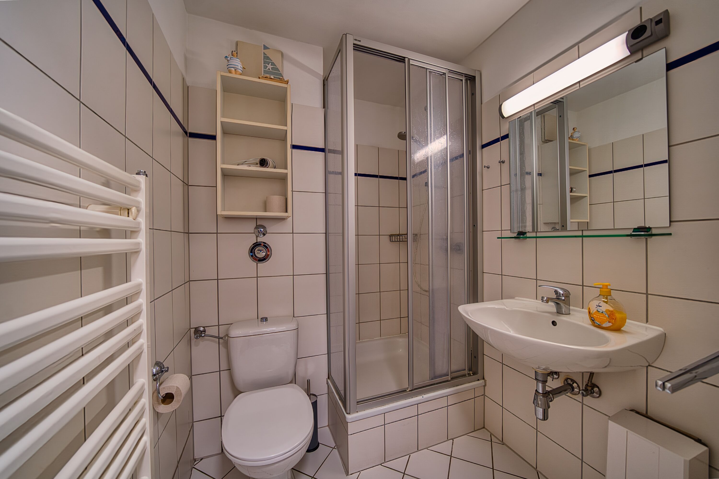 Badezimmer mit Dusche (Kabine), WC, Handtuchtrockner