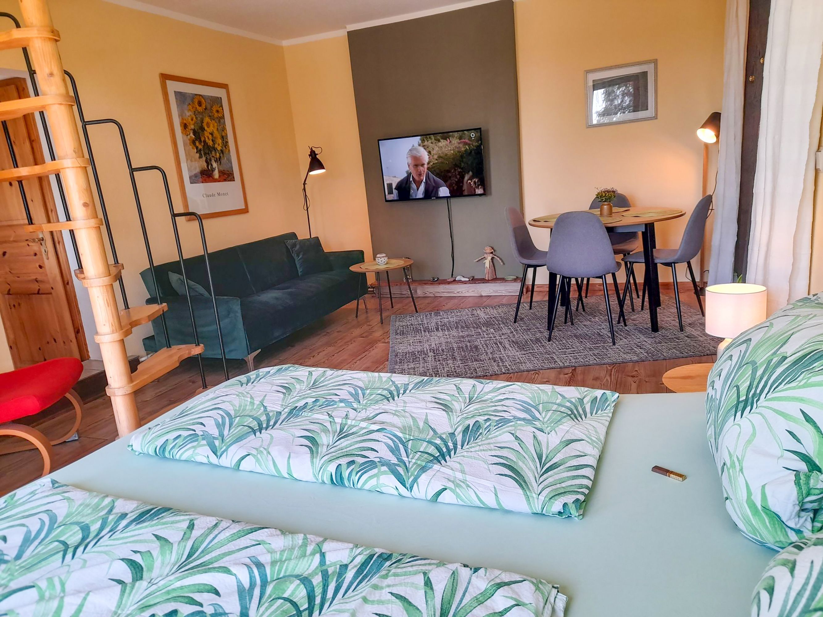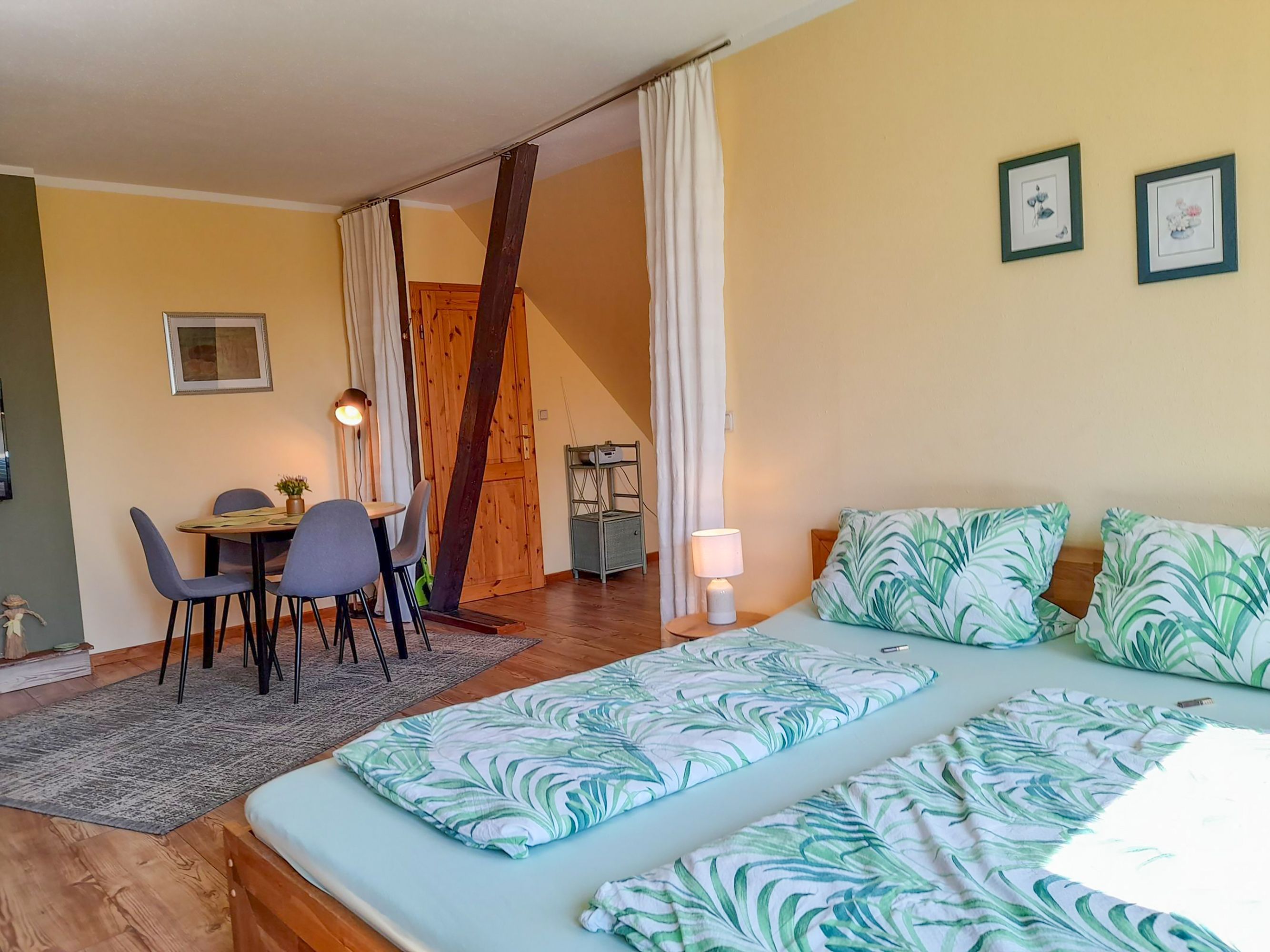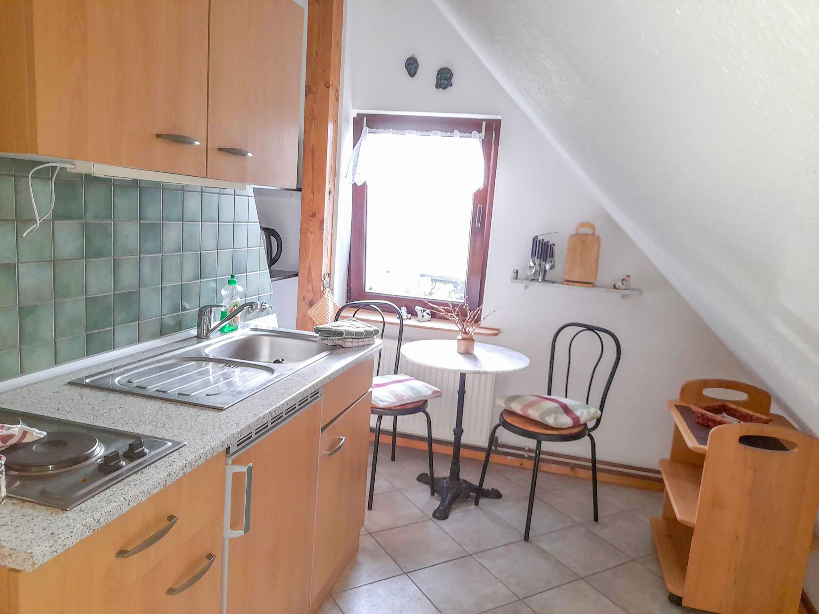 Die Ferienwohnung 2 bietet dir und deiner Familie auf 50 m² ein gemütliches Zuhause für bis zu 4 Personen und ein Kleinkind bis 2 Jahre. Sie erstreckt sich über das Ober- und Dachgeschoss des Hauses, das du über den Hausflur im Erdgeschoss erreichst. Der offene und großzügige Wohnbereich vereint alles, was du für einen entspannten Aufenthalt brauchst: ein bequemes Sofa und einen TV zum Relaxen, einen Essbereich für gemeinsame Mahlzeiten sowie ein komfortables Doppelbett (180x200). Zwei Einzelbetten (90x200) sind harmonisch in den Raum integriert und können bei Bedarf durch einen Vorhang vom restlichen Raum abgetrennt werden – ideal für ein wenig mehr Privatsphäre. Die Küche ist kompakt, aber funktional ausgestattet: Mit einer Küchenzeile, einem Kühlschrank, einer Mikrowelle, einem Wasserkocher, einer Kaffeemaschine und einem Toaster hast du alles zur Hand, um dich und deine Lieben zu verwöhnen. Das Bad mit Dusche und WC ist hell und modern – ideal, um den Tag frisch zu beginnen oder nach einem erlebnisreichen Ausflug zu entspannen. Ein Highlight für die Kinder: Über eine steile Wendeltreppe im Wohnzimmer gelangst du in den Dachboden. Dort erwarten dich zwei weitere Einzelbetten (90x200), die eine charmante Rückzugsmöglichkeit bieten. Die Ferienwohnung 2 ist der perfekte Ort für eine kleine Auszeit, bei der du die Alleinlage am Waldrand genießen und dich ganz auf die Ruhe der Natur einlassen kannst.