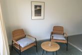 Der Wohnbereich des Apartments ist mit maßangefertigten Einbauschränken und einem Queensize Doppelbett (Breite 1,60 m) vom Tischler ausgestattet. Das Queensize Bett hat zwei Lattenroste mit jeweils verstellbaren Kopf.-und Fußteil, sowie zwei hochwertigen Matratzen von Schlaraffia. Zum Wohnbereich gehören außerdem zwei bequeme Couchsessel, nebst Couchtisch, sowie eine Kommode, die weiteren Stauraum bietet.