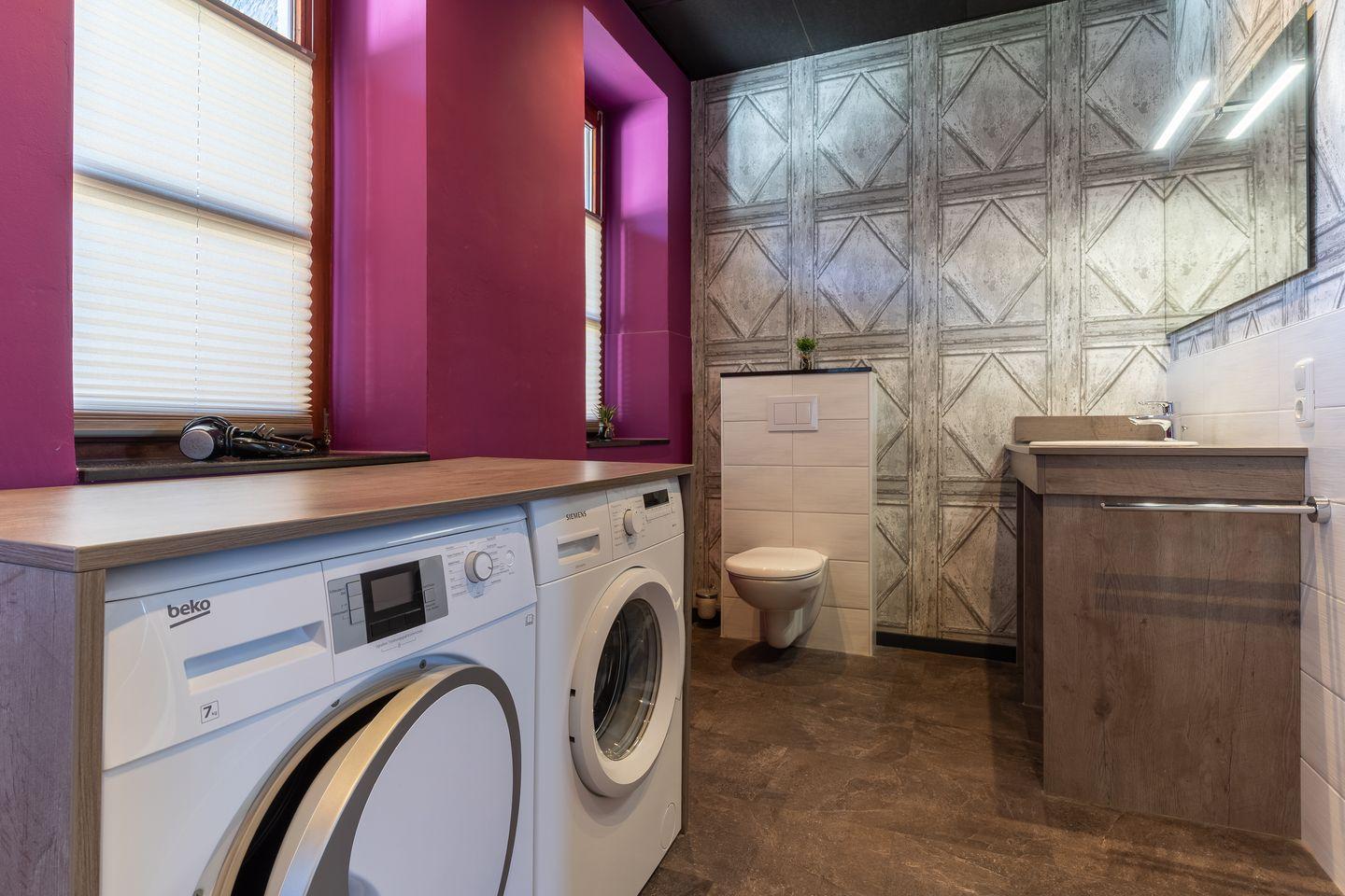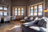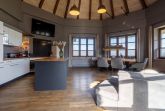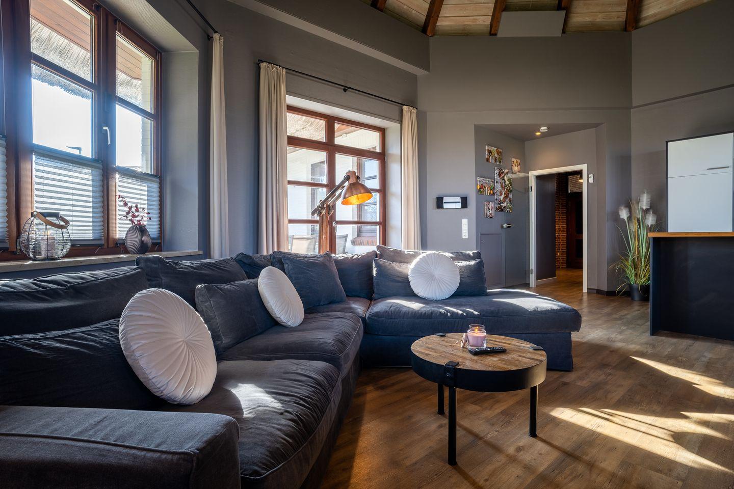 Der lichtdurchflutete und sehr großzügige Wohnraum mit TV und einem stilvollen Essbereich, sowie einer modernen Wohnküche befindet sich im Turmzimmer. Die hohe offene Kegeldecke ist einzigartig. An den Wohnbereich schließen sich ein Flur mit Garderobe und zwei Duschbäder.