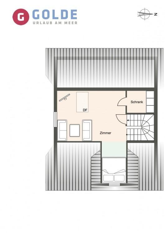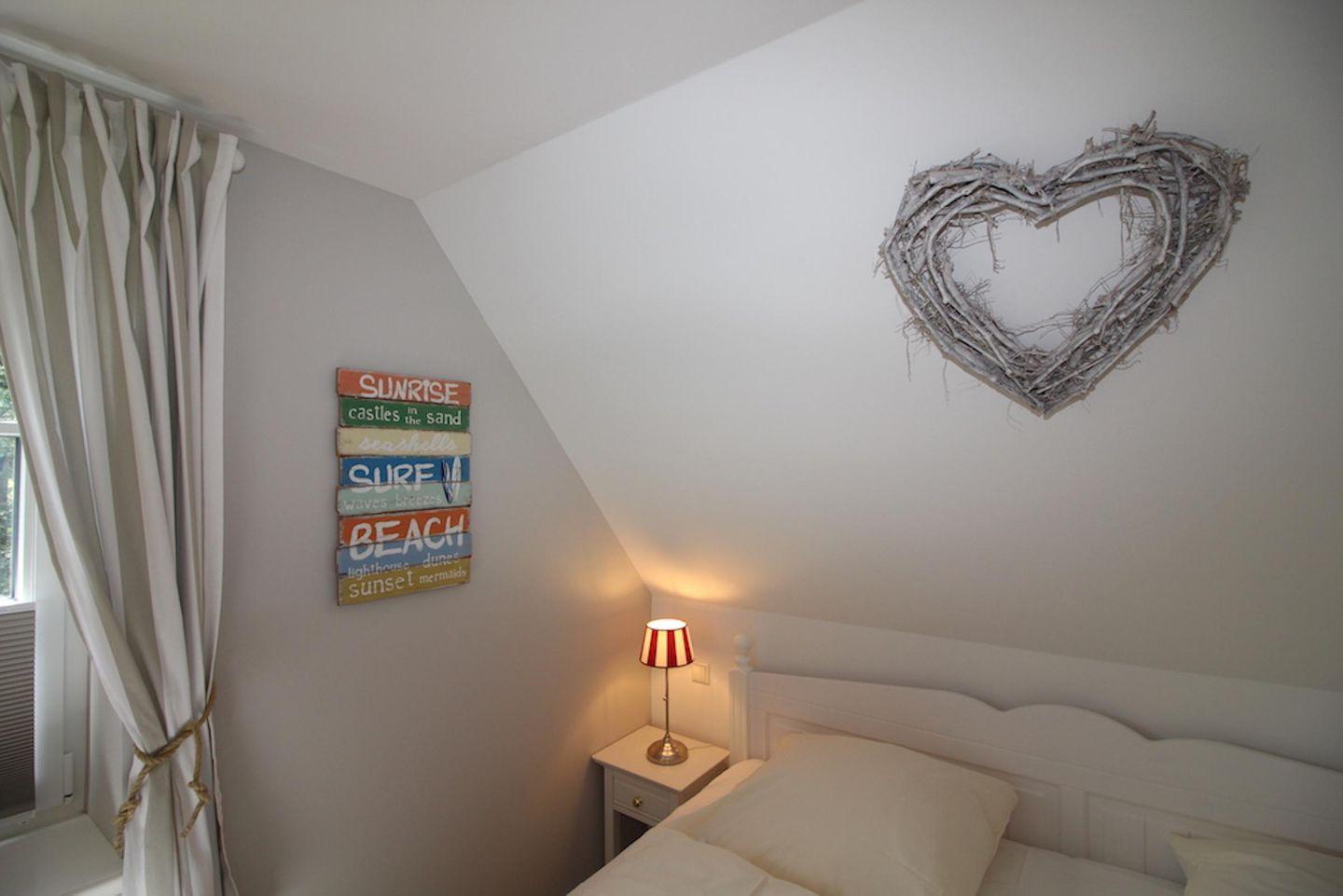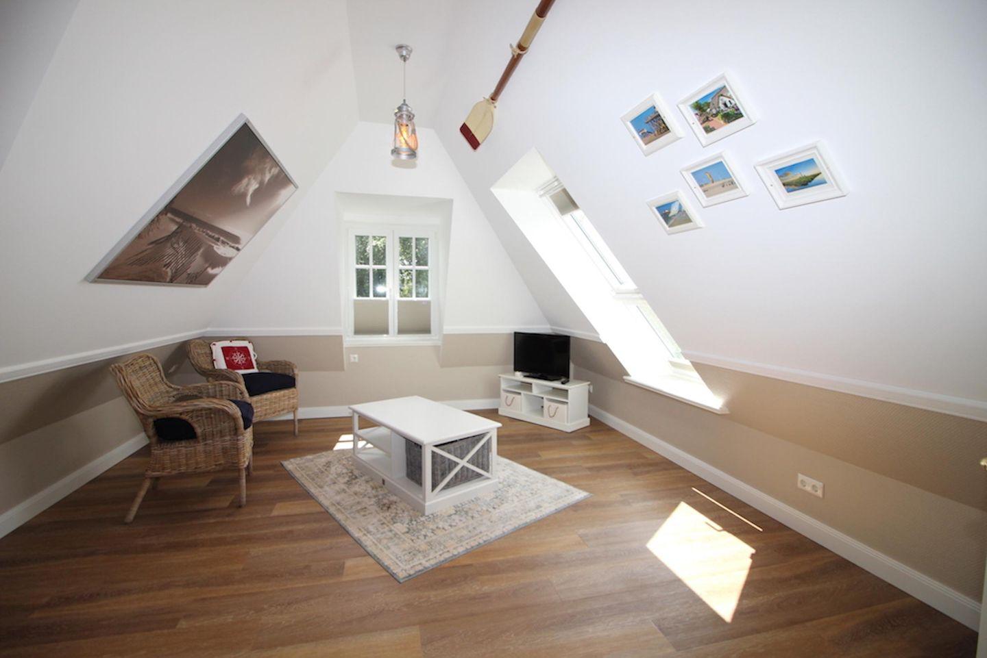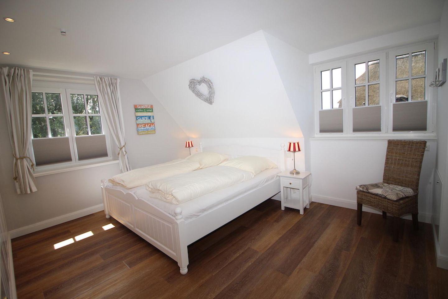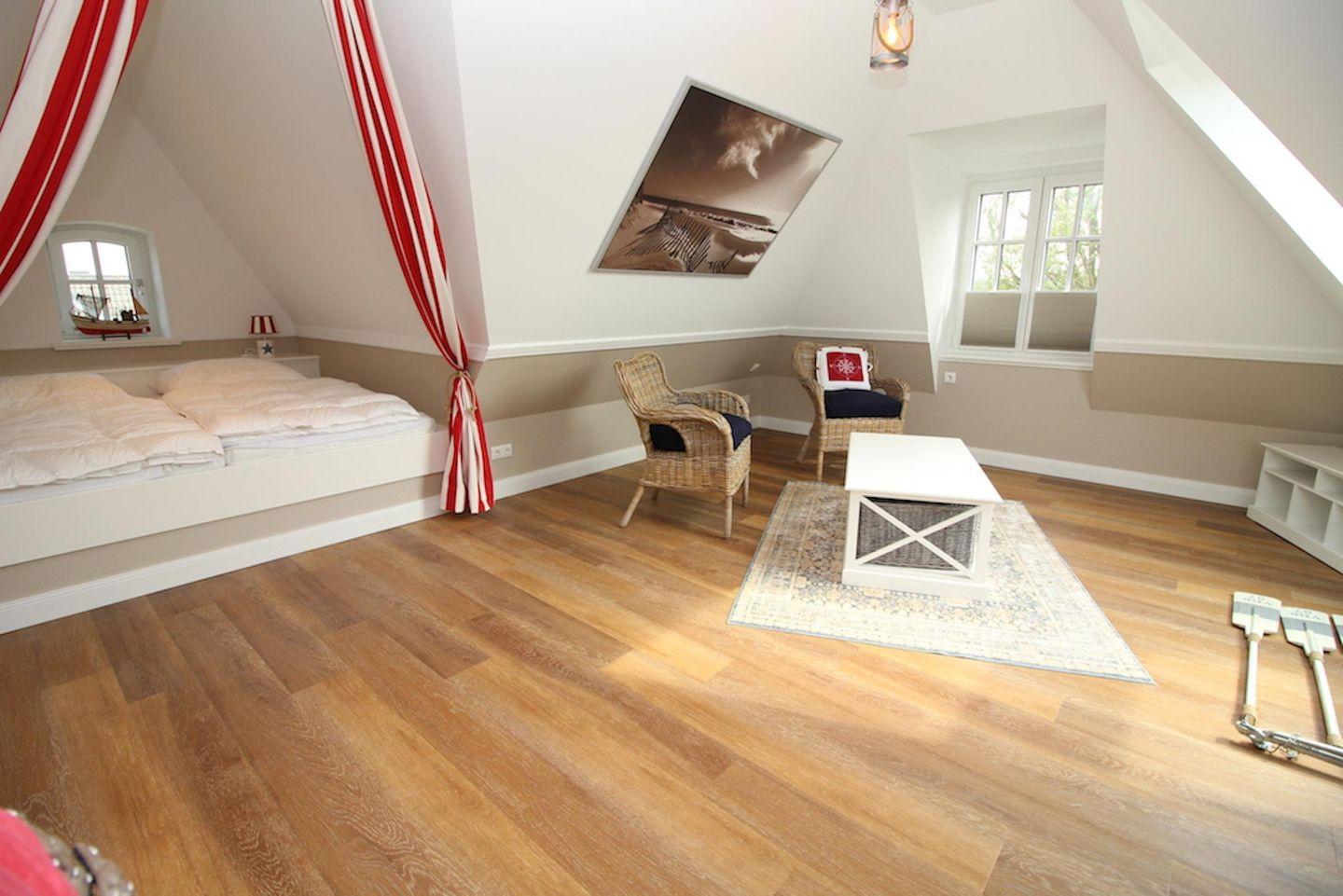 Vom Obergeschoss führt die Holztreppe hinauf in das Dachgeschoss. Ein drittes Schlafzimmer mit Doppelbett, Sofalonge und großen Fenstern mit Blick bis zum Wasser erfüllt jeden Urlaubstraum.