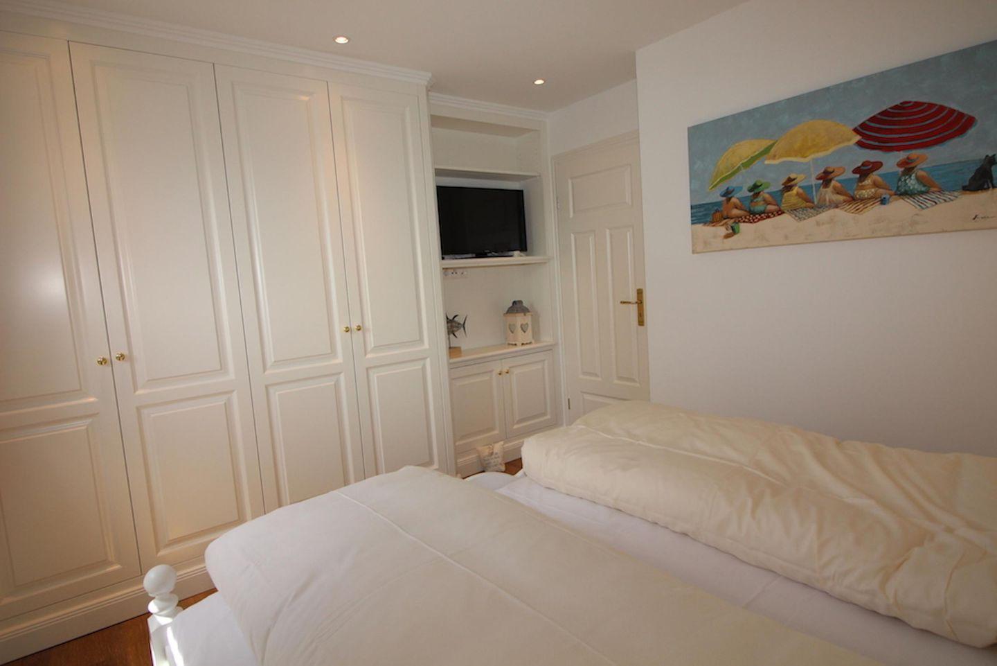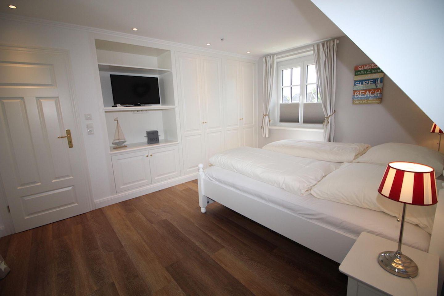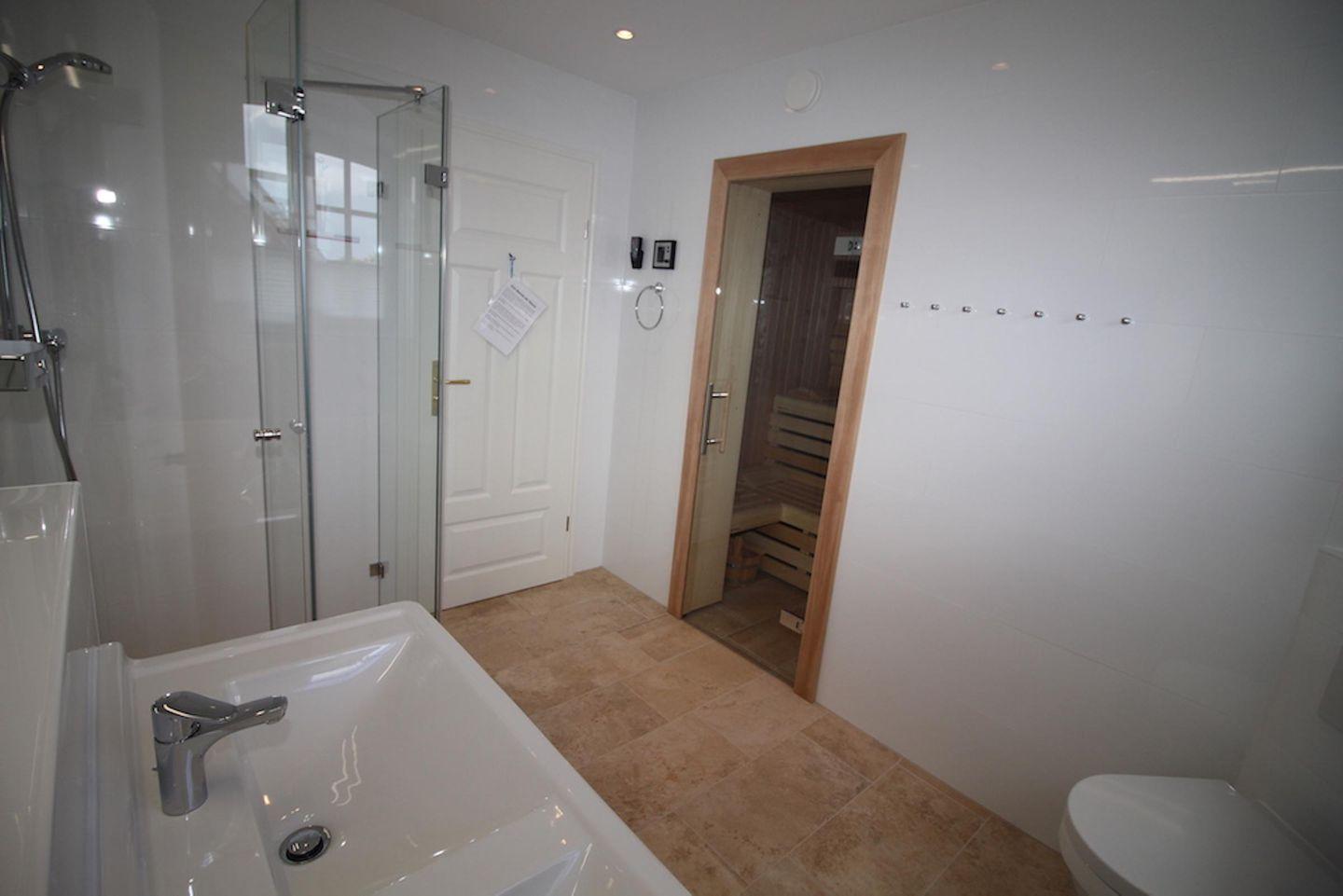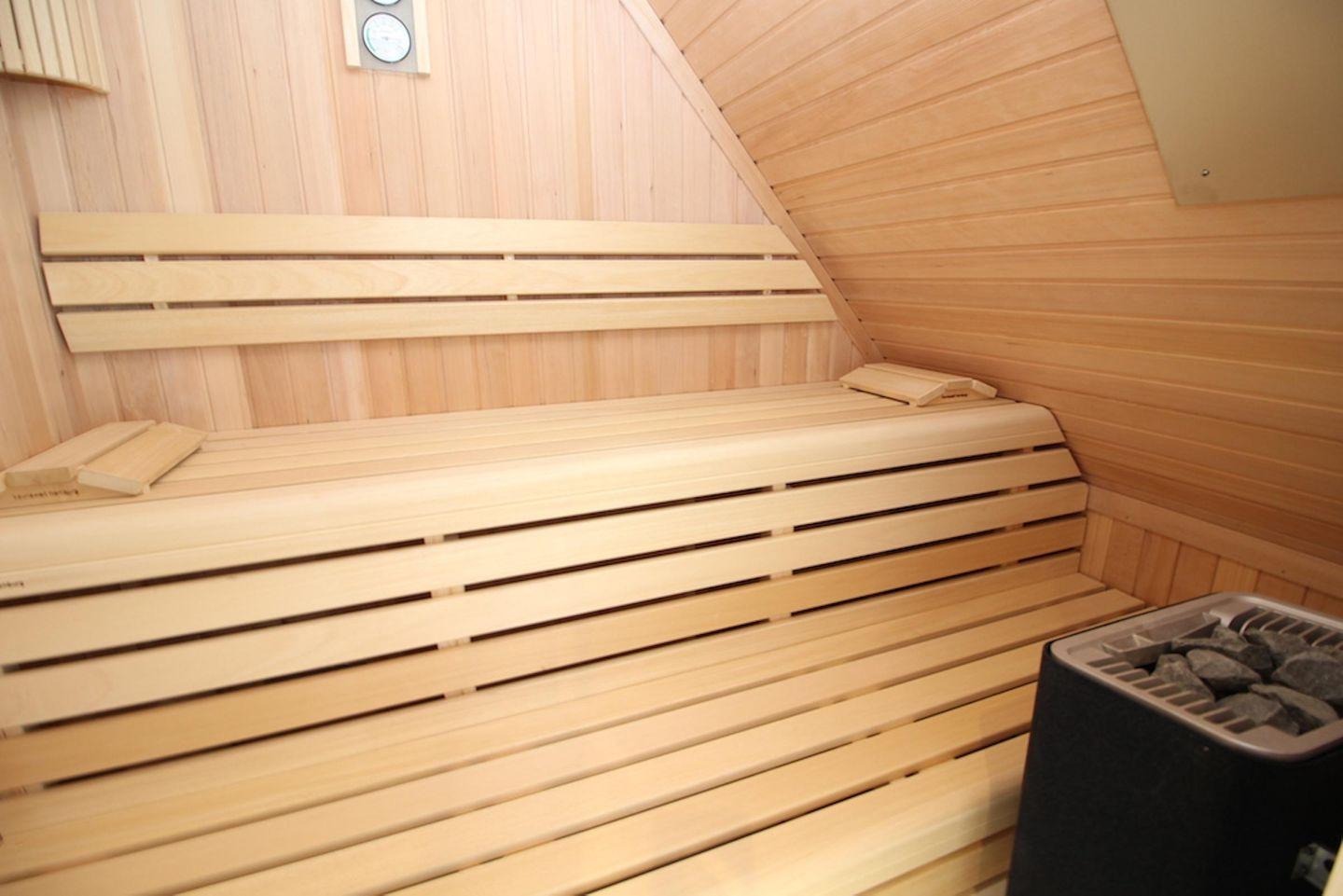Über eine Holztreppe gelangt man in das mit Parkett ausgelegte Obergeschoss. Dieses verfügt ebenfalls über eine Fußbodenheizung. Die beiden Schlafzimmer, jeweils mit einem Doppelbett, sind ebenfalls mit TV ausgestattet. Einbauschränke gewähren Ihnen hinreichend Ablageflächen. Darüber hinaus befinden sich im Obergeschoss zwei weitere, geräumige Bäder mit Dusche. Für zusätzliche Entspannung sorgt eine Sauna mit Sternenhimmel.