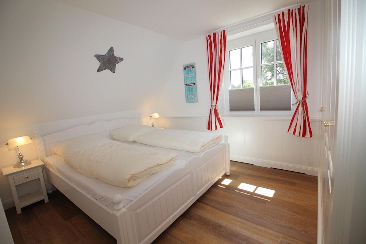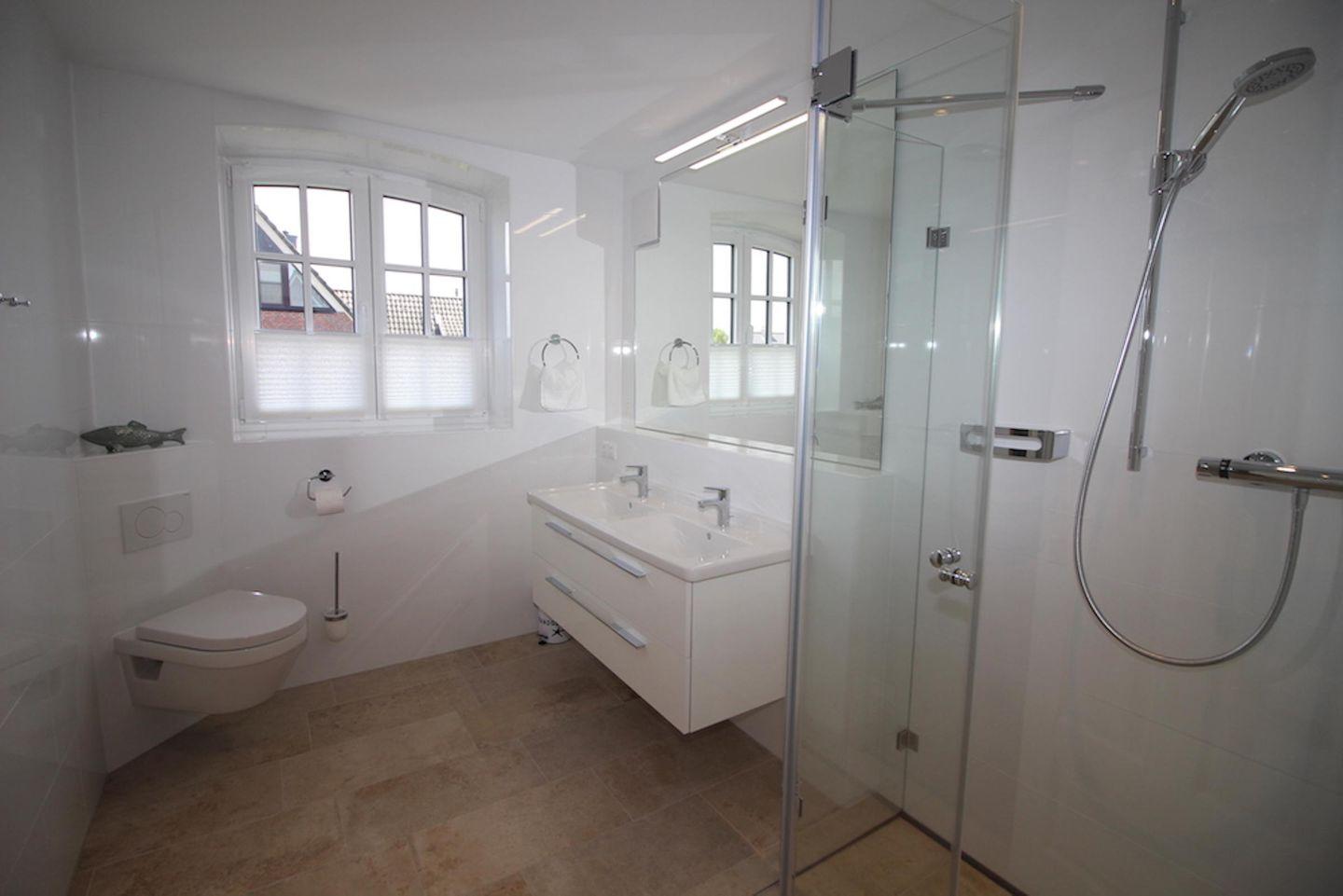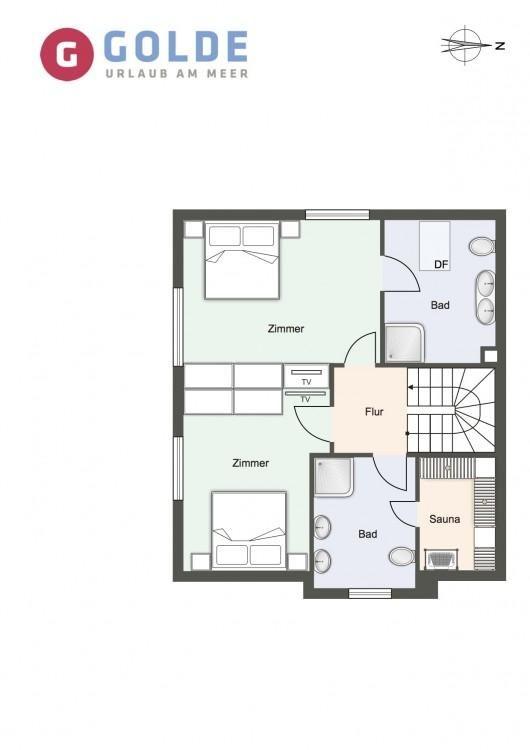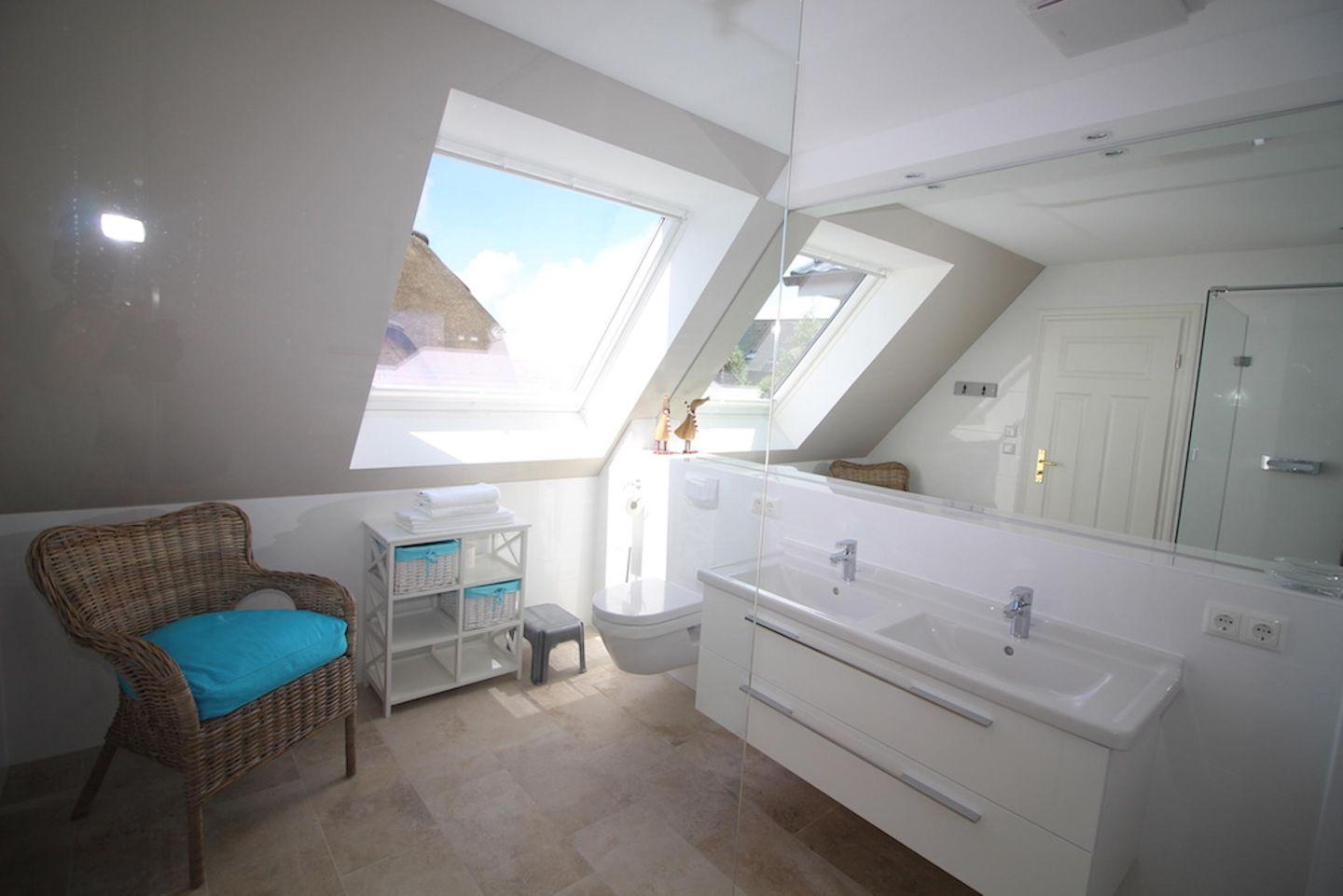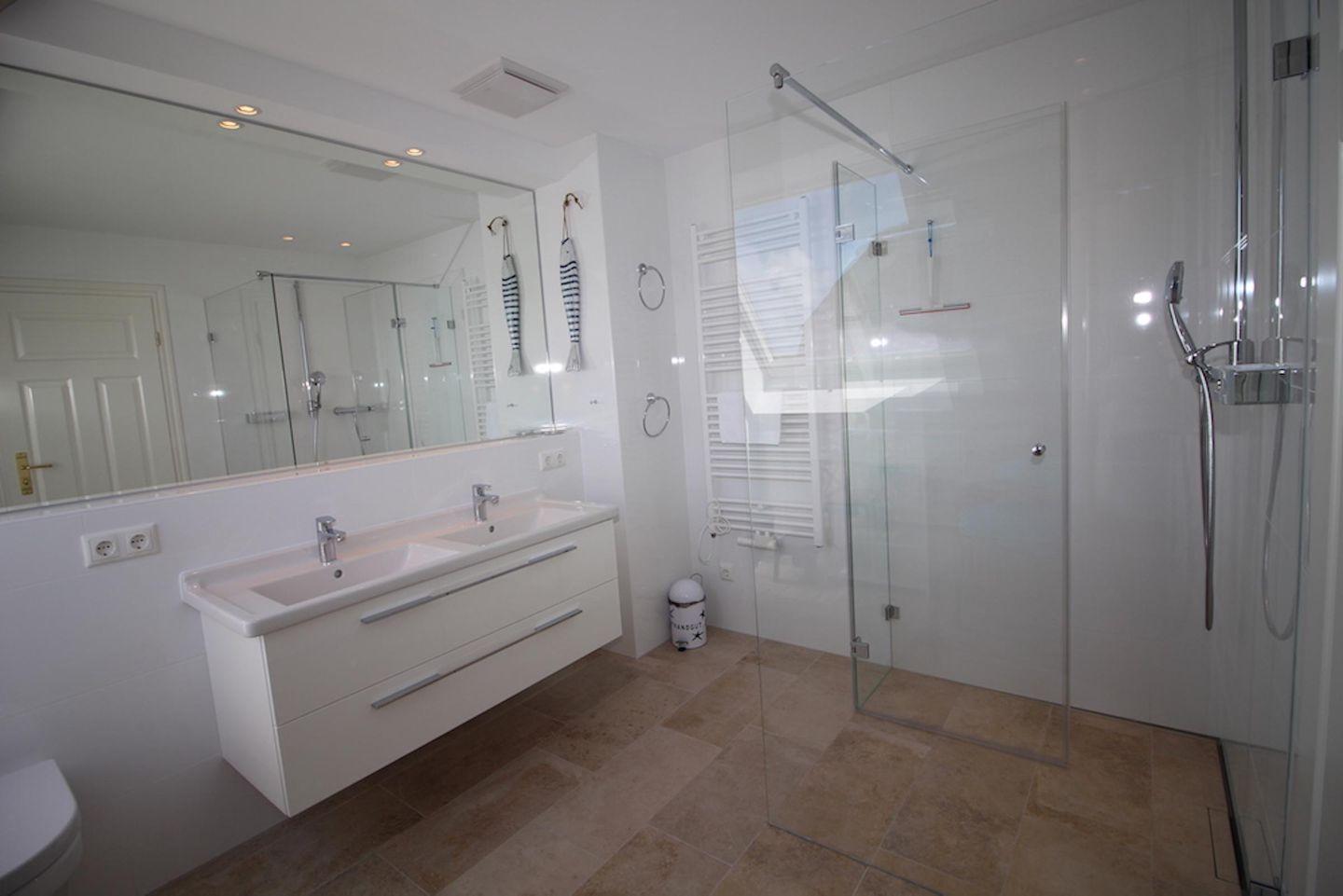 Über eine Holztreppe gelangt man in das mit Parkett ausgelegte Obergeschoss. Dieses verfügt ebenfalls über eine Fußbodenheizung. Die beiden Schlafzimmer, jeweils mit einem Doppelbett, sind ebenfalls mit TV ausgestattet. Einbauschränke gewähren Ihnen hinreichend Ablageflächen. Darüber hinaus befinden sich im Obergeschoss zwei weitere, geräumige Bäder mit Dusche. Für zusätzliche Entspannung sorgt eine Sauna mit Sternenhimmel.