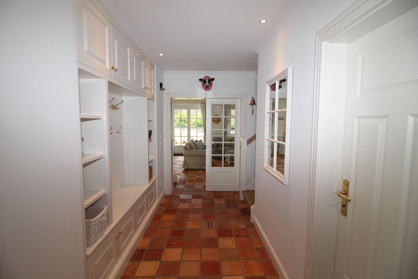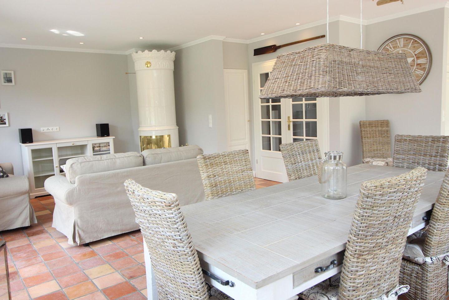 Im Erdgeschoss befindet sich der lichtdurchflutete Wohnraum mit TV, Kamin, einer offenen Küche sowie einem stilvollen Essbereich. Die Wohnräume sind mit exklusiven Möbeln ausgestattet. Die Küche verfügt über hochwertige Elektrogeräte. An den Wohnbereich schließen sich ein Flur mit eingebauter Garderobe, ein Hauswirtschaftsraum und ein Gästebad an. Das gesamte Erdgeschoss ist mit geschmackvollen Fußbodenfliesen versehen, die über eine Fußbodenheizung beheizt werden können.