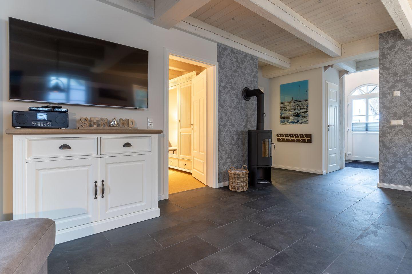 Das luxuriöse Reetdachhaus-Hälfte ist ca. 130 m² groß und bietet Platz für 6 Personen.Im Erdgeschoss befindet sich der lichtdurchflutete Wohnraum mit TV, Kamin, einer offenen Küche sowie einem stilvollen Essbereich.Die Küche ist ausgestattet mit Backofen und Geschirrspüler, sowie einem Esperto-Caffè-Automat, Toaster, Wasserkocher und den üblichen Küchenutensilien.An den Wohnbereich schließen sich ein Flur, ein Duschbad und ein Doppelschlafzimmer an.Das Erdgeschoss ist rollstuhlfreundlich.Über eine Holztreppe gelangt man in das Obergeschoss. Hier befinden sich ein Schlafzimmer mit einem Doppelbett und ein Schlafzimmer mit 2 Einzelbetten.Im ersten Stock befindet sich ausserdem ein weiteres Duschbad sowie eine Sauna.