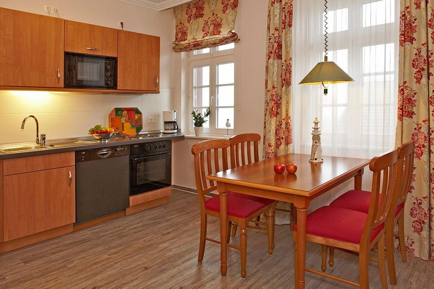 Die Ausstattung besteht weiterhin aus einer voll ausgestatteten offenen Küche mit Wasserkocher, Kaffeemaschine, Toaster, Backofen, Geschirrspüler, Mikrowelle und Tiefkühlfach.