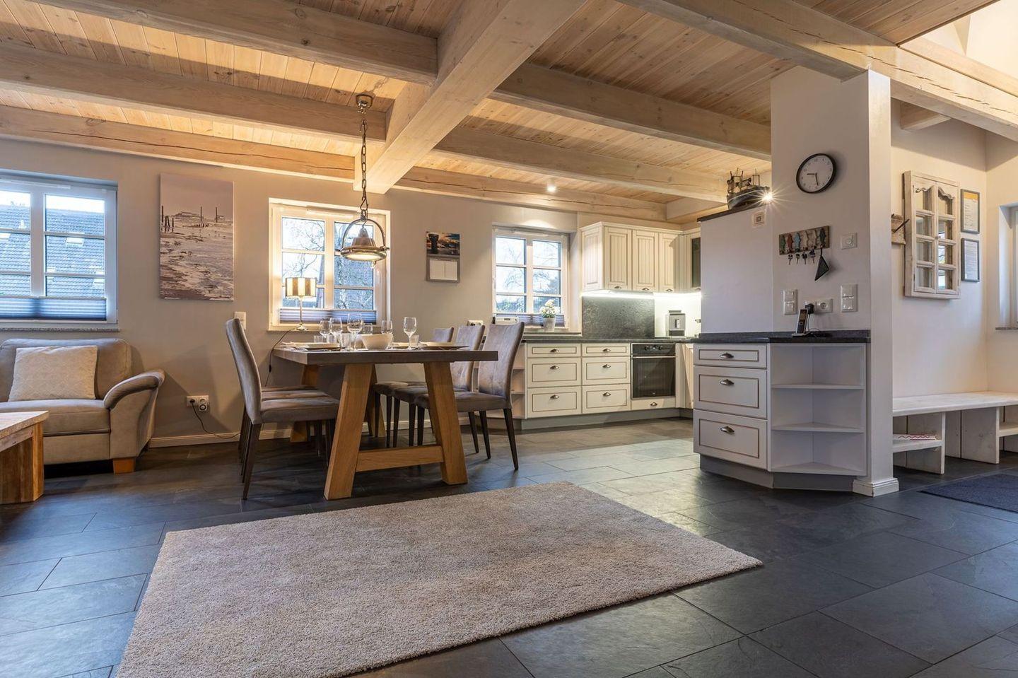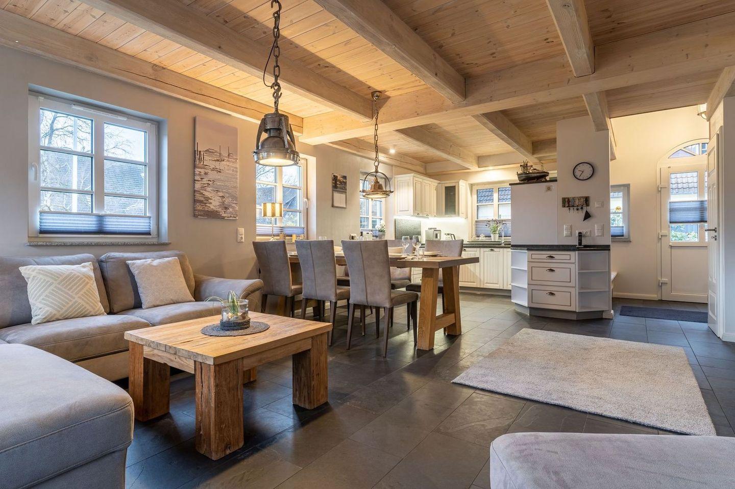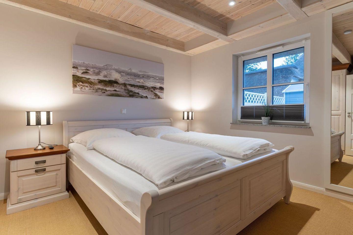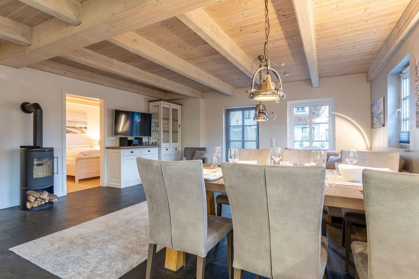 Die wunderschöne Haushälfte unter Reet verfügt über ca. 130 m² und bietet Platz für 1-6 Personen.Im Erdgeschoss befindet sich der lichtdurchflutete Wohnraum mit TV, Kamin, einer offenen Küche sowie einem stilvollen Essbereich.Die Küche ist ausgestattet mit Backofen und Geschirrspüler, sowie einem Esperto-Caffè-Automat, Toaster, Wasserkocher und den üblichen Küchenutensilien.An den Wohnbereich schließen sich ein Flur, ein Duschbad und ein Doppelschlafzimmer an.Das Erdgeschoss ist rollstuhlfreundlich.Über eine Holztreppe gelangt man in das Obergeschoss. Die beiden Schlafzimmer, jeweils mit einem Doppelbett sorgen für ruhevolle Erholung.Im ersten Stock befindet sich ausserdem ein weiteres Duschbad sowie eine Sauna.