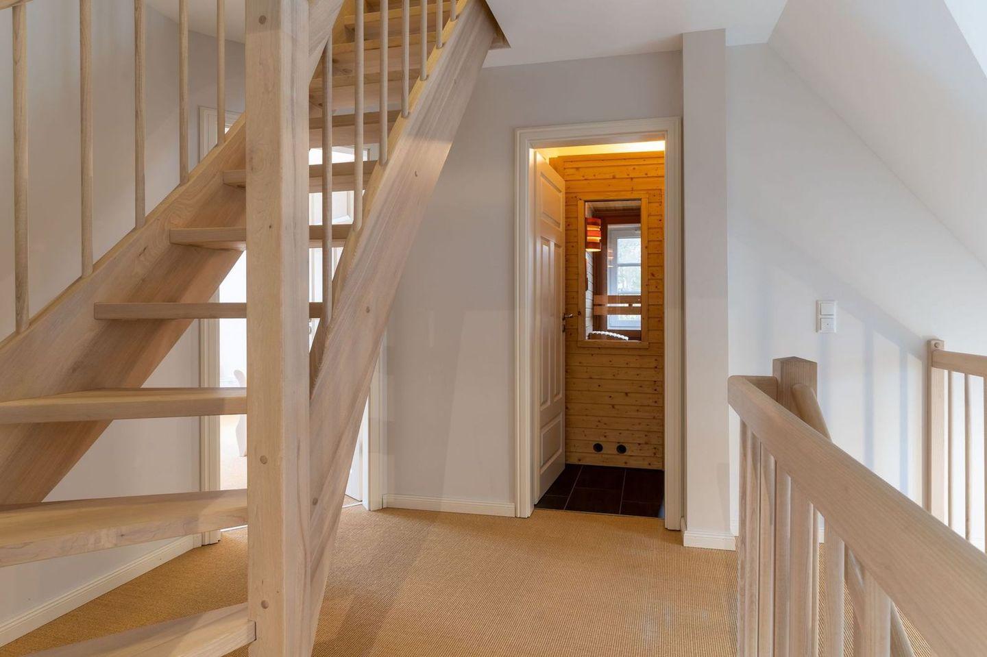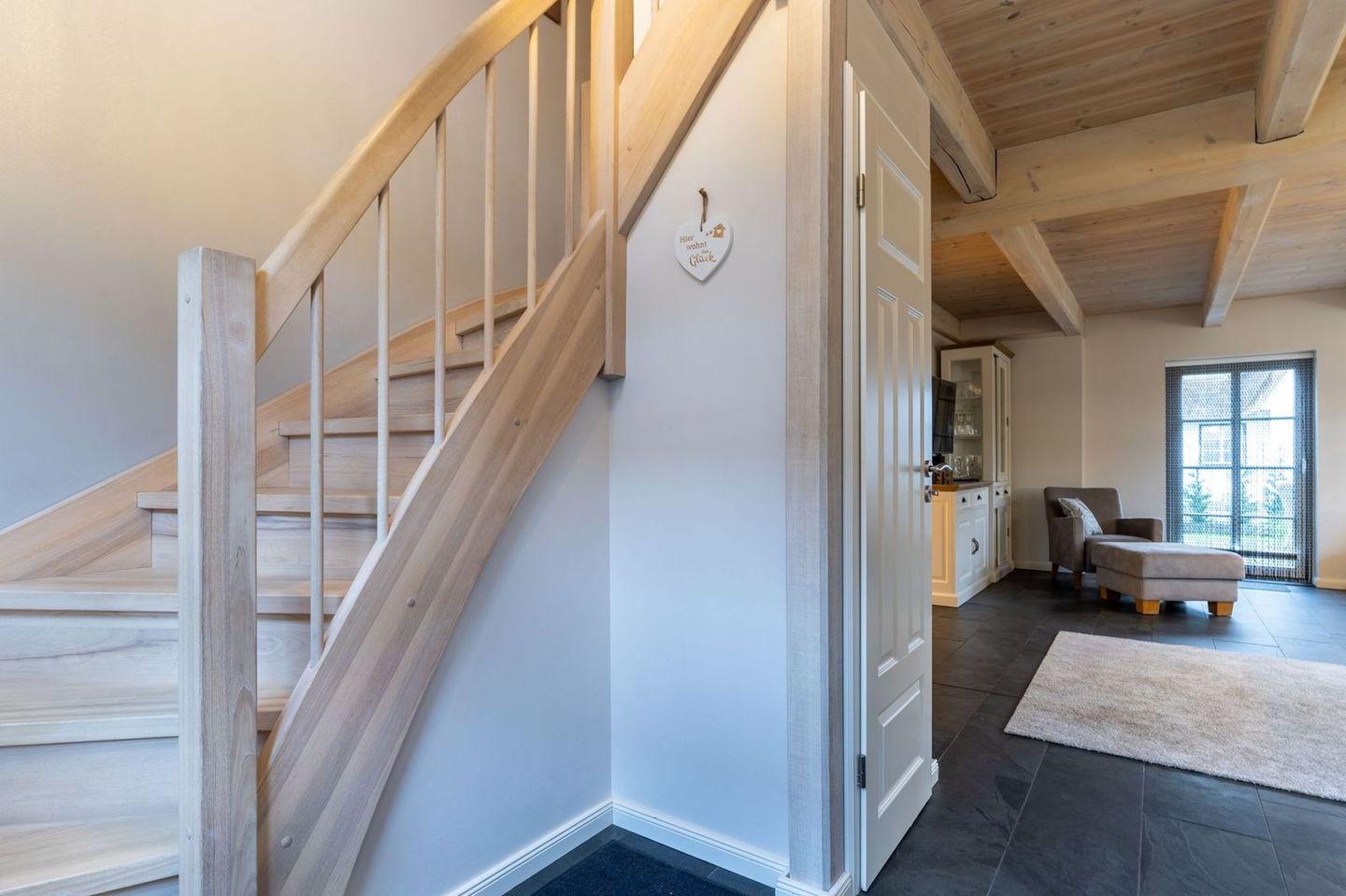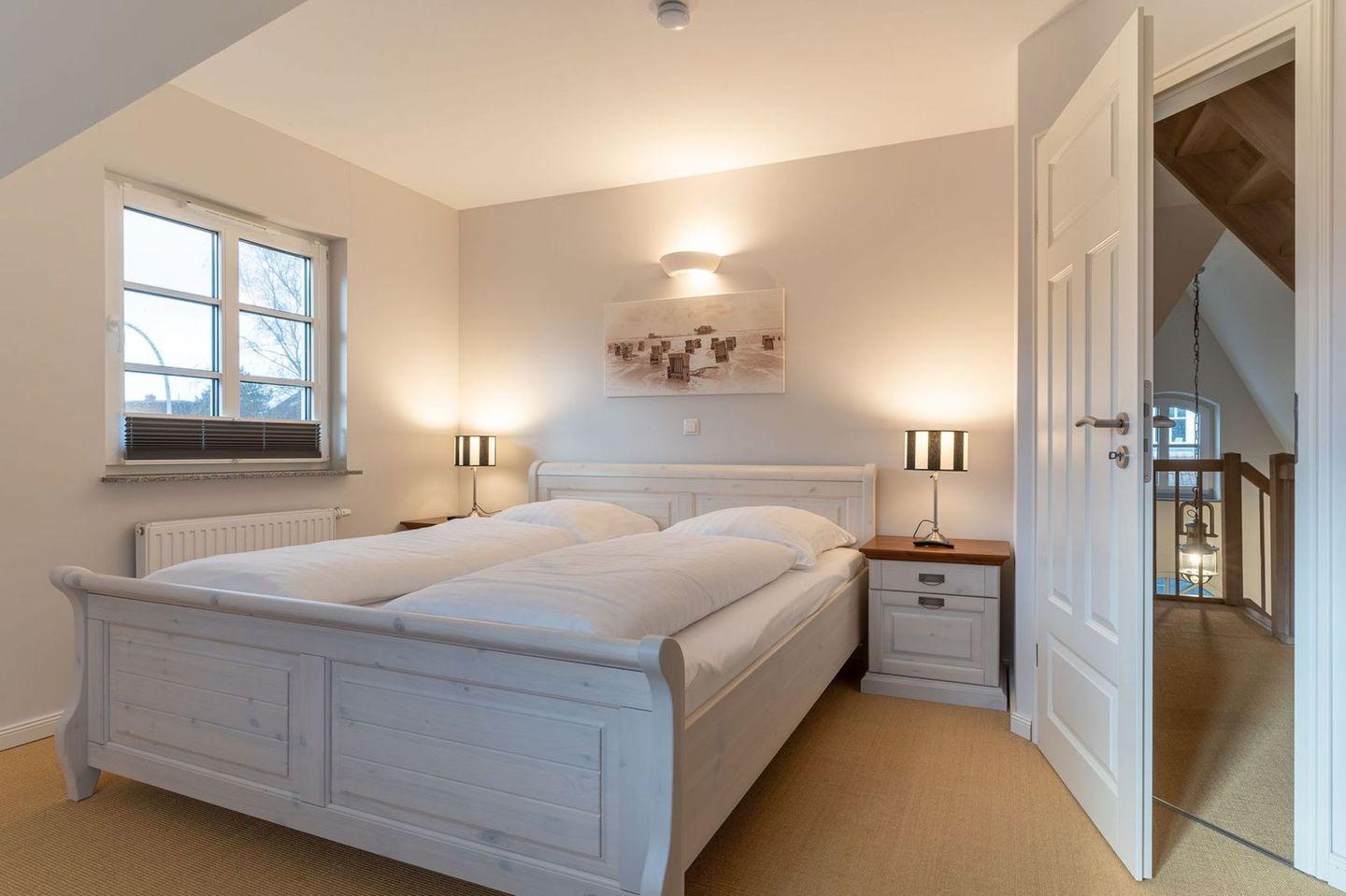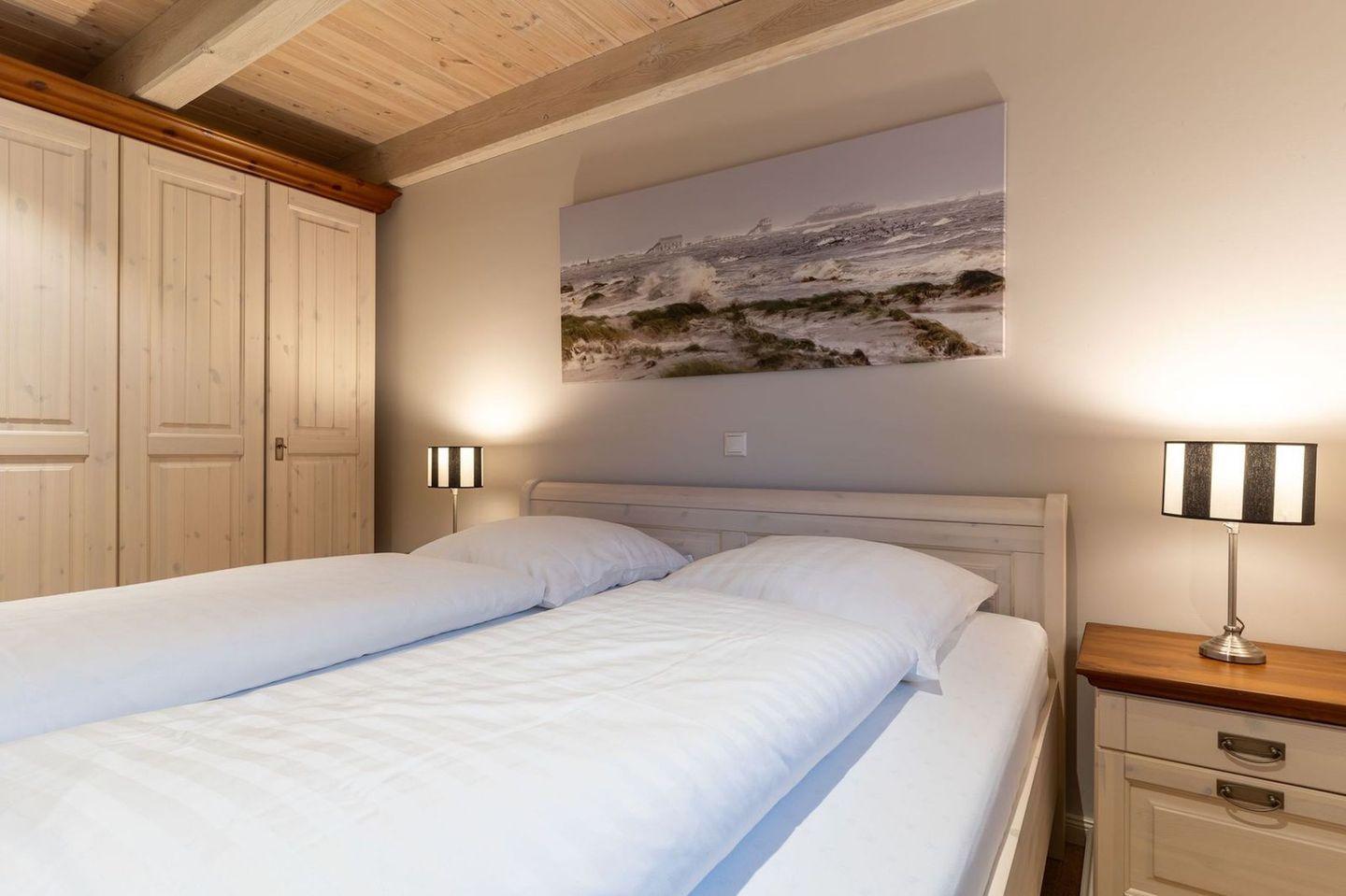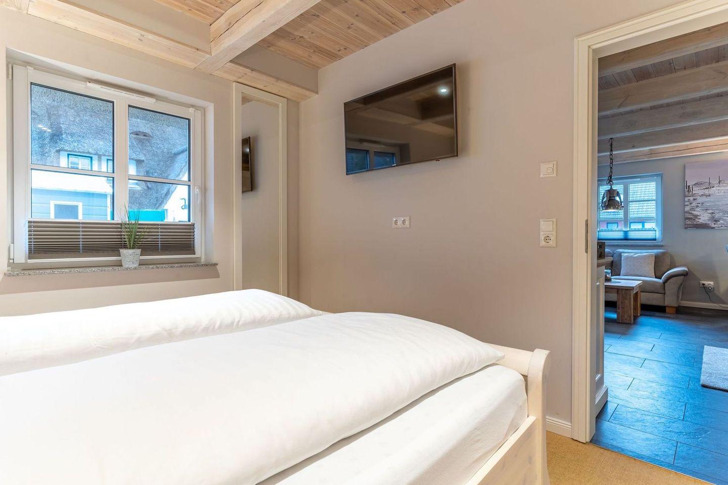Die wunderschöne Haushälfte unter Reet verfügt über ca. 130 m² und bietet Platz für 1-6 Personen.Im Erdgeschoss befindet sich der lichtdurchflutete Wohnraum mit TV, Kamin, einer offenen Küche sowie einem stilvollen Essbereich.Die Küche ist ausgestattet mit Backofen und Geschirrspüler, sowie einem Esperto-Caffè-Automat, Toaster, Wasserkocher und den üblichen Küchenutensilien.An den Wohnbereich schließen sich ein Flur, ein Duschbad und ein Doppelschlafzimmer an.Das Erdgeschoss ist rollstuhlfreundlich.Über eine Holztreppe gelangt man in das Obergeschoss. Die beiden Schlafzimmer, jeweils mit einem Doppelbett sorgen für ruhevolle Erholung.Im ersten Stock befindet sich ausserdem ein weiteres Duschbad sowie eine Sauna.