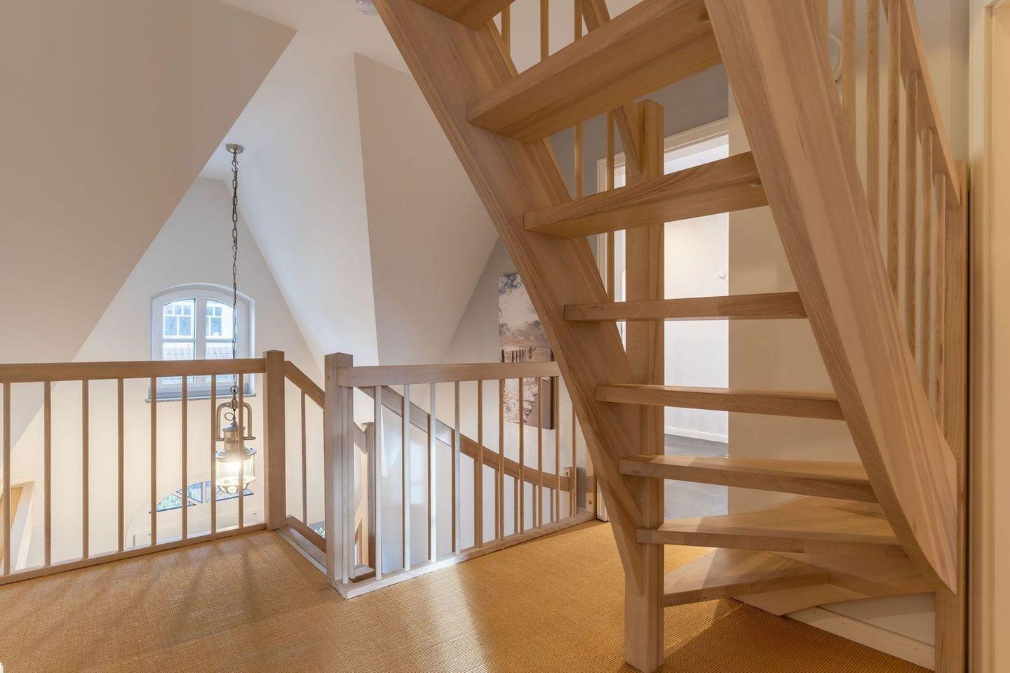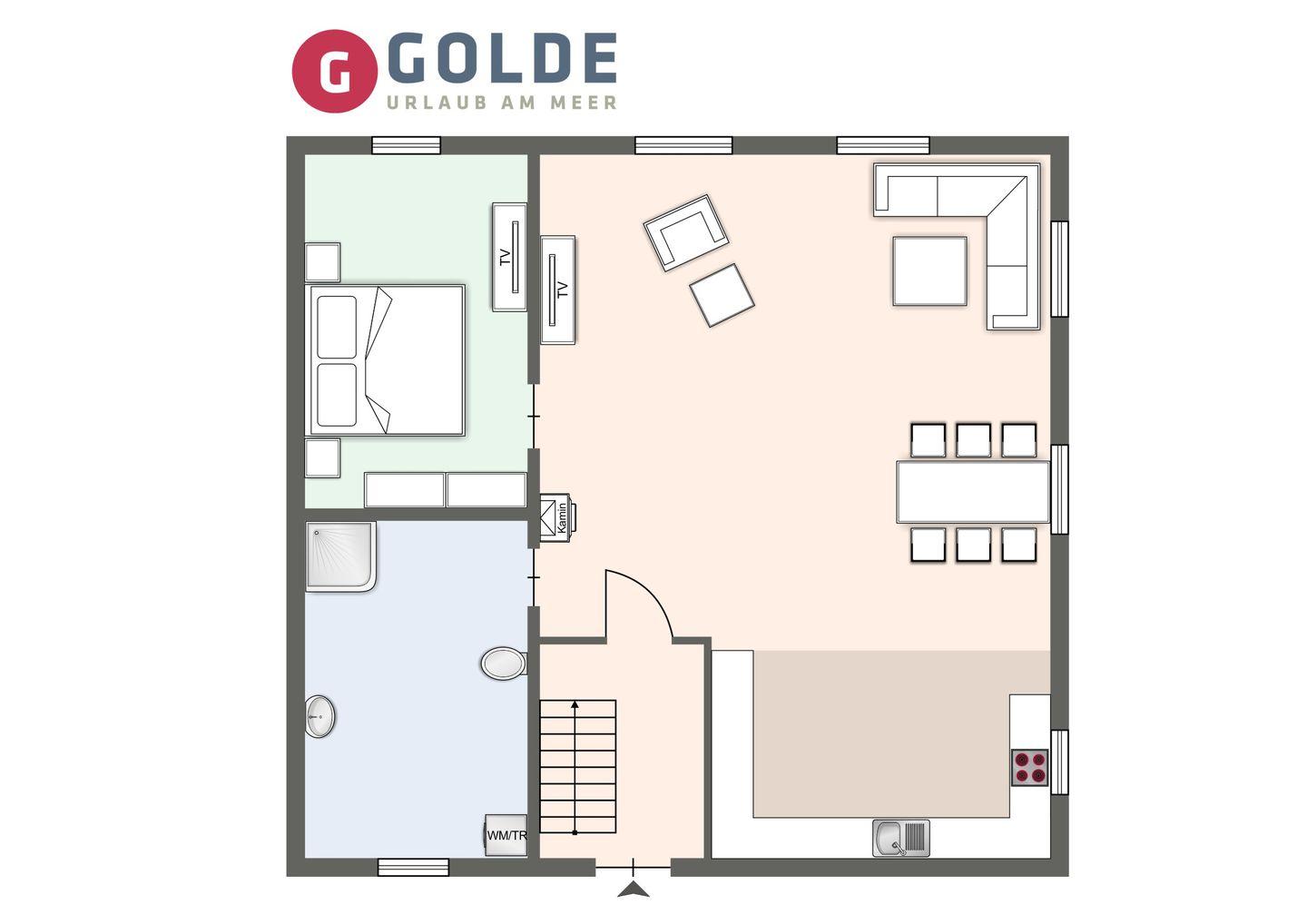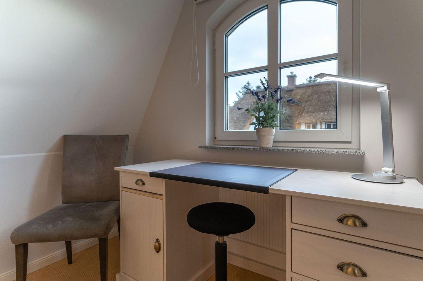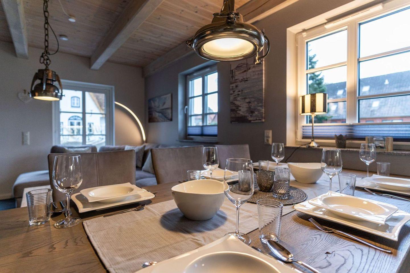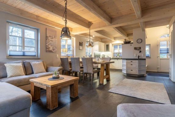 Die wunderschöne Haushälfte unter Reet verfügt über ca. 130 m² und bietet Platz für 1-6 Personen.Im Erdgeschoss befindet sich der lichtdurchflutete Wohnraum mit TV, Kamin, einer offenen Küche sowie einem stilvollen Essbereich.Die Küche ist ausgestattet mit Backofen und Geschirrspüler, sowie einem Esperto-Caffè-Automat, Toaster, Wasserkocher und den üblichen Küchenutensilien.An den Wohnbereich schließen sich ein Flur, ein Duschbad und ein Doppelschlafzimmer an.Das Erdgeschoss ist rollstuhlfreundlich.Über eine Holztreppe gelangt man in das Obergeschoss. Die beiden Schlafzimmer, jeweils mit einem Doppelbett sorgen für ruhevolle Erholung.Im ersten Stock befindet sich ausserdem ein weiteres Duschbad sowie eine Sauna.
