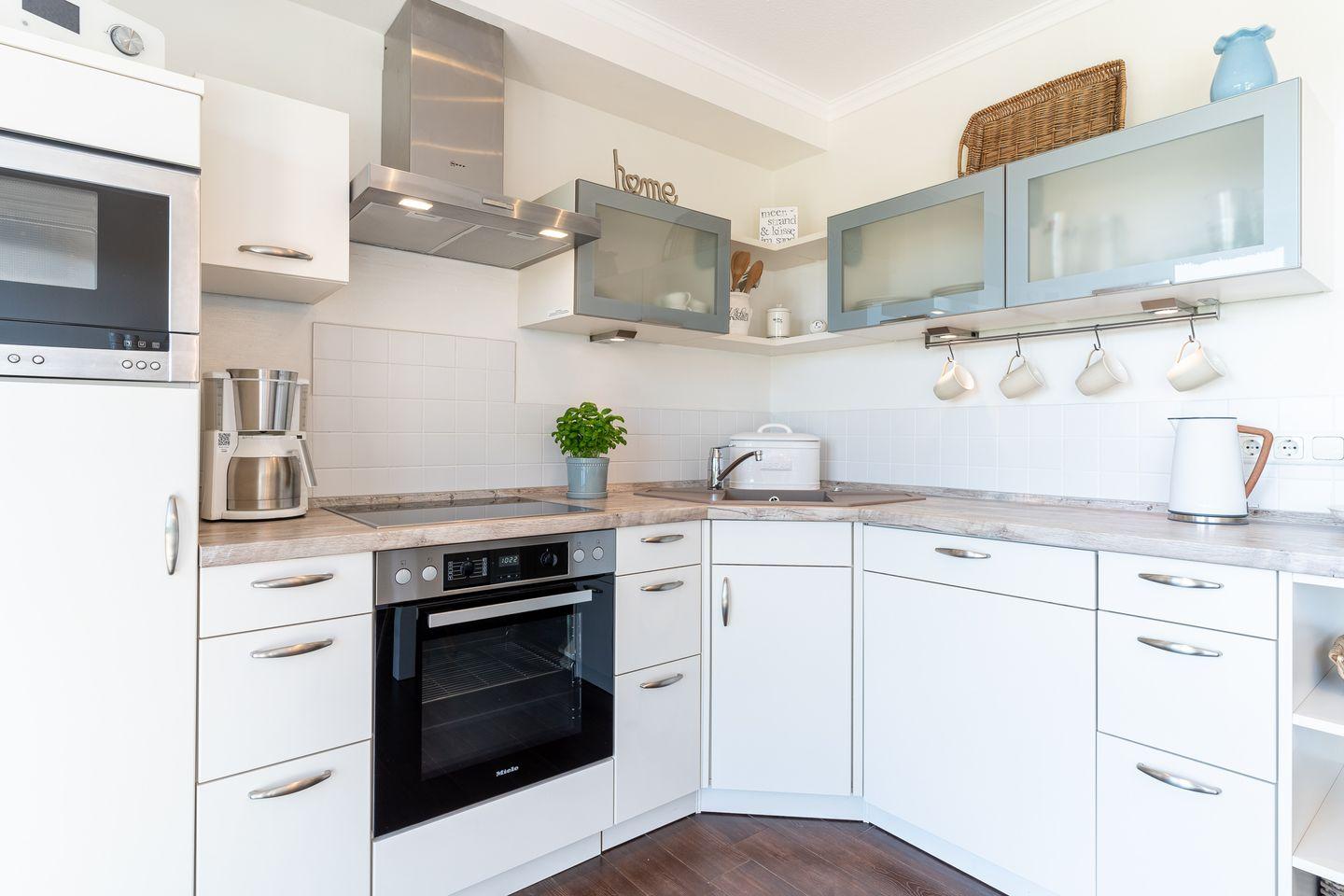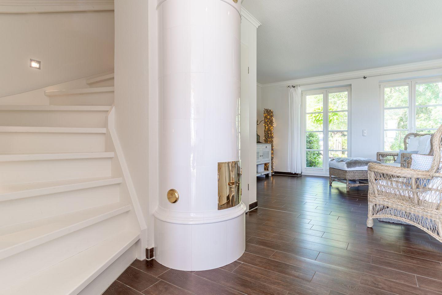 Im Erdgeschoss befindet sich ein lichtdurchflutetes Wohnzimmer mit freiem Blick über die Felder. Die separate Küche mit einem gemütlichen Essbereich, ist vollausgestattet und lädt zum gemeinsamen Kochen ein. Im Erdgeschoss ist ebenso ein Duschbad mit WC.