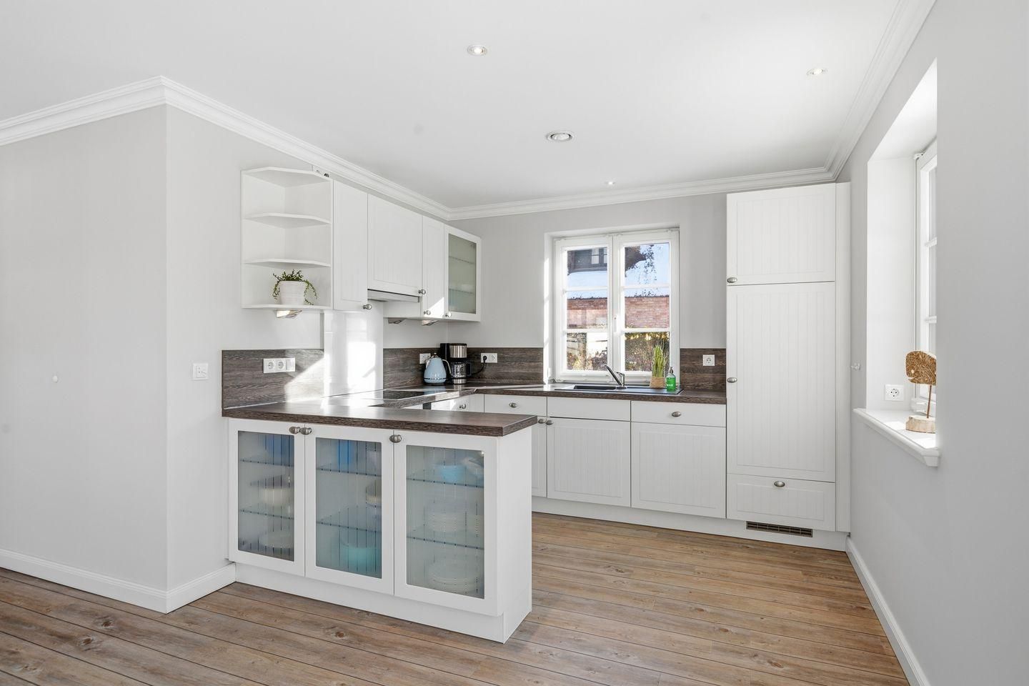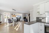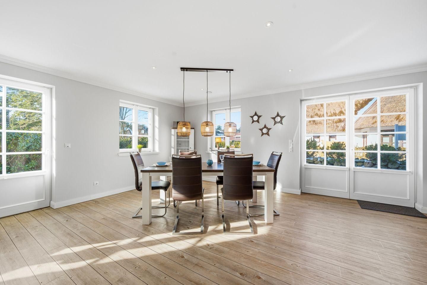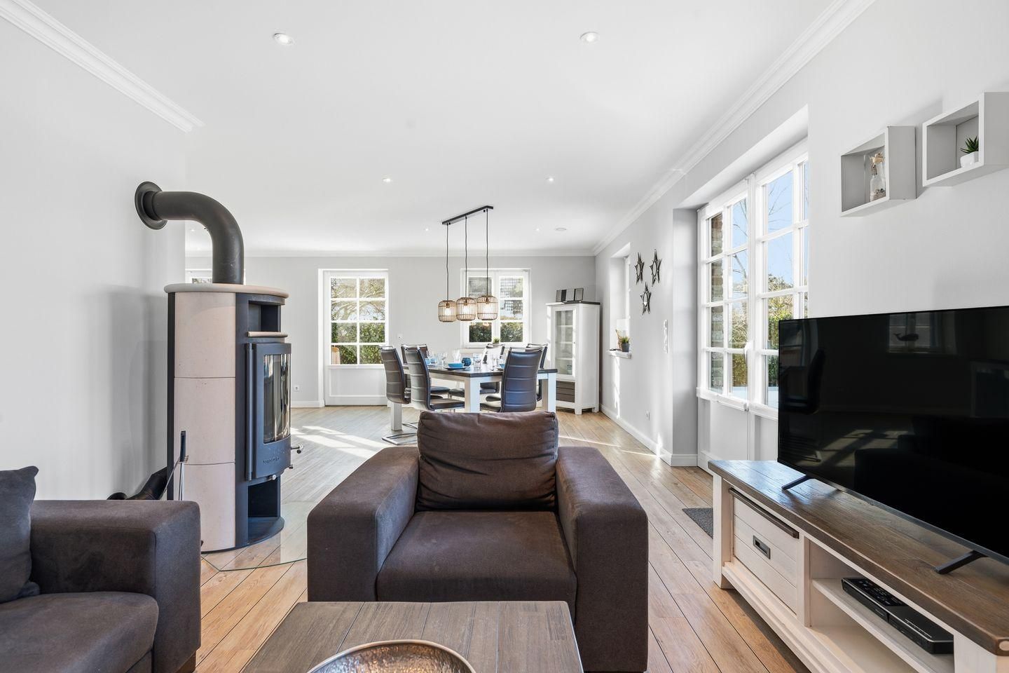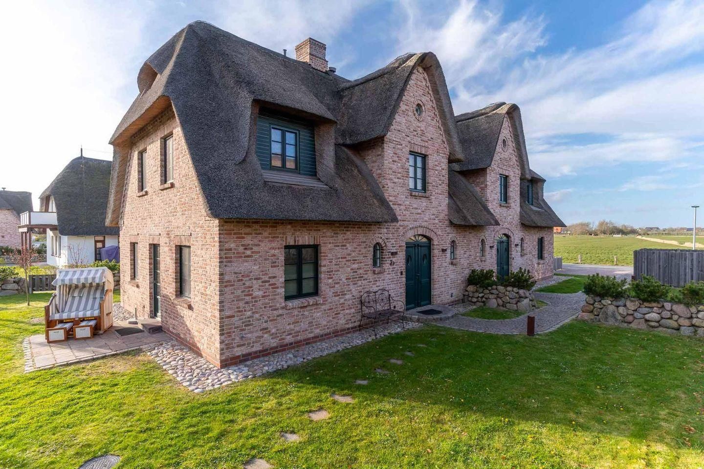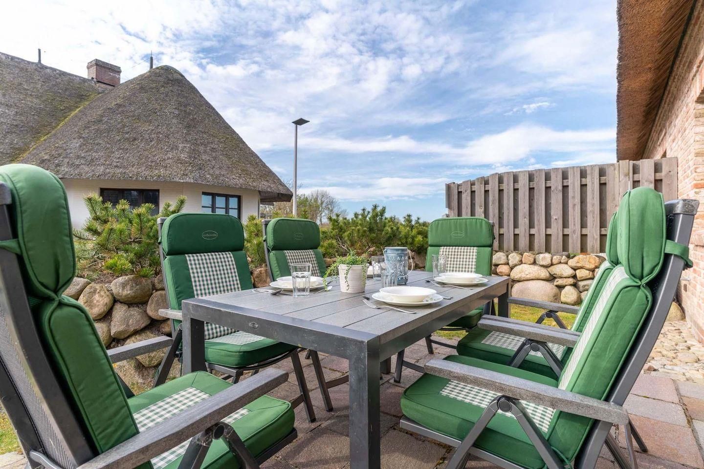 Die luxuriöse Haushälfte unter Reet wurde mit exklusiven Möbeln ausgestattet und bietet großzügigen Platz für 6 Personen. Das Grundstück mit Stellplatz und 2 Terrassen inklusive Gartenmöbeln und Strandkorb wurde mit hübschen Pflanzen und einem Friesenwall angelegt