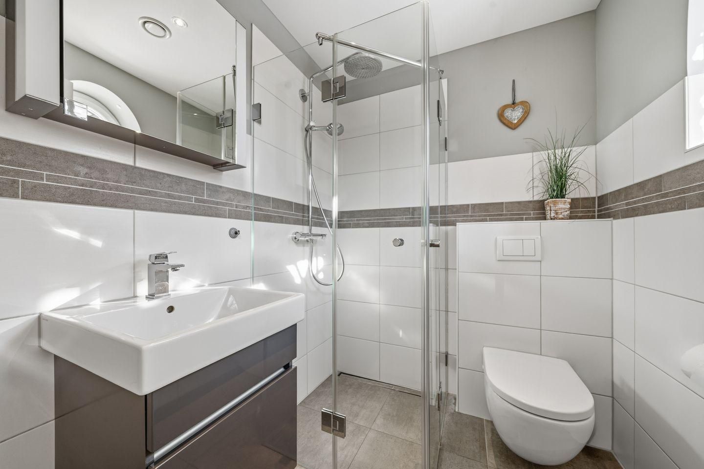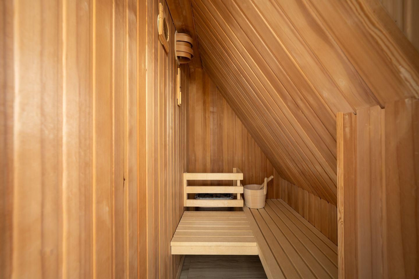 Im Erdgeschoss befindet sich der großzügige Wohnraum mit einer offenen Küche und einem gemütlichen Essbereich. Die Küche ist mit hochwertigen Geräten voll ausgestattet. Ein edler Kaminofen sorgt im Wohnraum leicht und unkompliziert für knisternde Momente. Im Erdgeschoss ist ebenso ein großer Flur und ein HWR. Die beiden Bäder, eines im EG das andere im OG, sind großzügig gestaltet und bieten genügend Platz für Ihre Utensilien. Das volle Wohlfühlprogramm erwartet Sie im Obergeschoss, hier gelangen Sie über das Bad direkt in die Sauna.