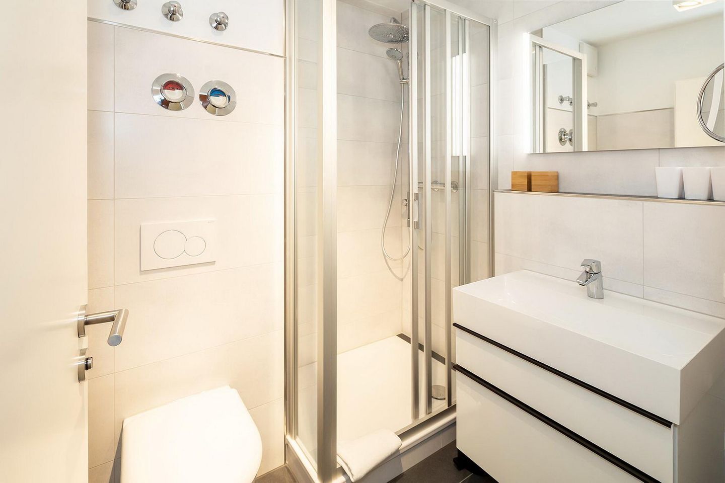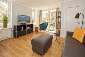 Das helle und moderne Nichtraucher-Apartment verfügt über große Fenster, kostenfreies WLAN und eine voll ausgestattete offene Küche mit Geschirrspüler, Kühlschrank mit Gefrierfach, Kaffeemaschine, Toaster, Wasserkocher, Backofen und Mikrowelle sowie über einen Essbereich. Im Wohnbereich befindet sich eine Schlafcouch und ein großer Flatscreen-TV (50 Zoll) mit Blu-ray-Player und ein modernes DAB-Radio. Das separate Schlafzimmer ist mit einem bequemen Doppelbett und einem Flatscreen-TV (30 Zoll) ausgestattet. Ein Kinderbett kann gegen Entgelt aufgestellt werden, und auf Wunsch könnt ihr einen Hochstuhl hinzubuchen. Im geschmackvollen Badezimmer befinden sich eine Regendusche, ein Waschtisch mit Föhn, Kosmetikspiegel und ein Handtuchheizkörper. Das Apartment verfügt über einen Flur mit Garderobe. Ein erholsamer Urlaubstag kann auf der überdachten und mit Gartenmöbeln ausgestatteten Terrasse ausklingen. Die Terrasse ist vom Wohnzimmer aus begehbar.
