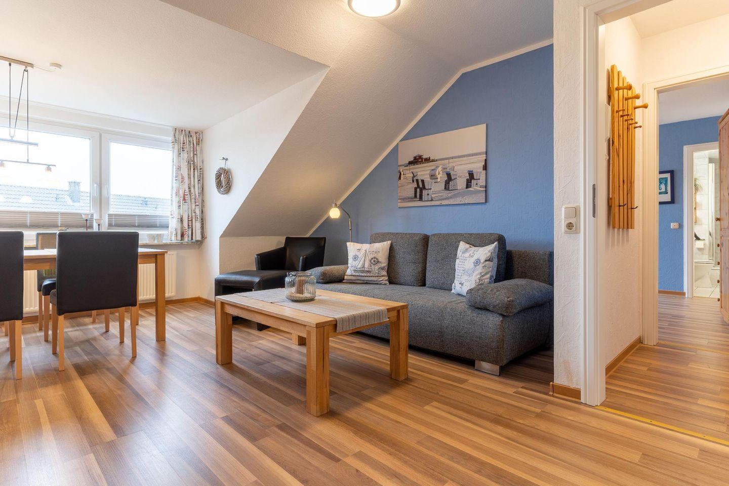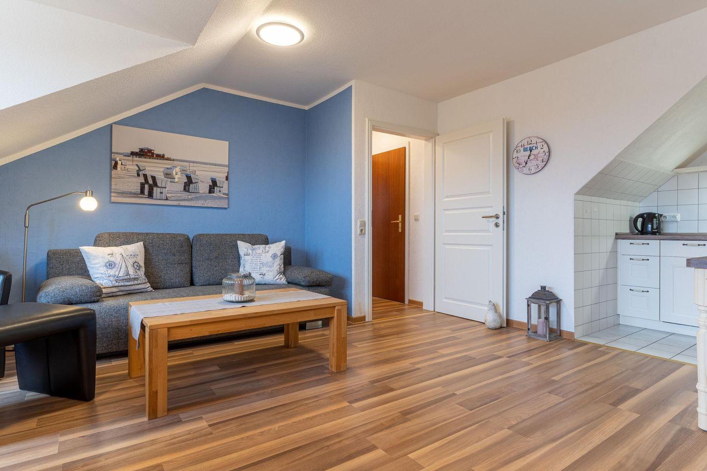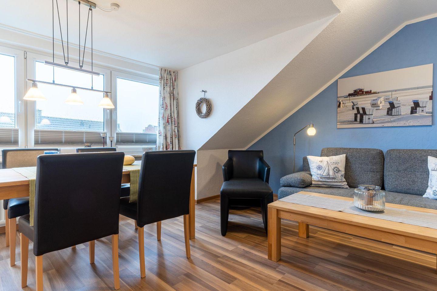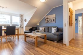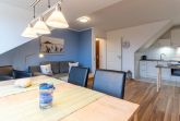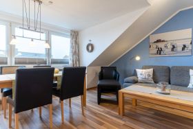 In diesem Appartement im 2. Obergeschoss haben sie komfortabel Platz für 4 Personen und blicken direkt über den Deich auf die Strandkörbe und Pfahlbauten am Strand.