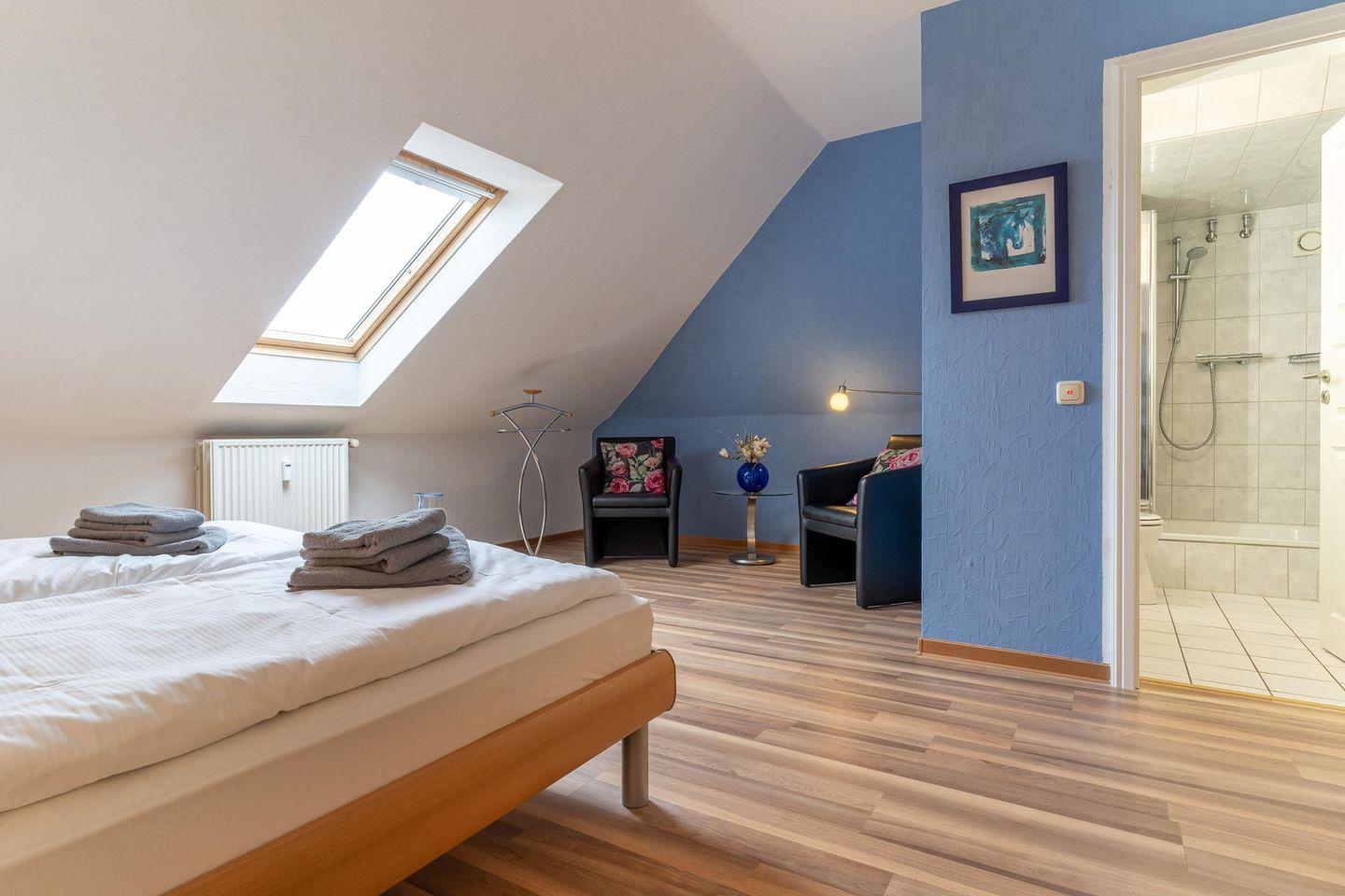 Das Schlafzimmer mit 2 Kommoden, 2 Nachttischen, Spiegel, Beistelltisch und Kleiderschrank verfügt über ein Doppelbett (2,00 x 1,80 m). Als weitere Schlafmöglichkeit dient Ihnen eine Schlafcouch. Das Badezimmer besteht aus einer Dusche, Waschbecken und WC. Zur Unterhaltung dient ein Sat-TV Flachbildschirm, Radio sowie WLAN (inklusive).