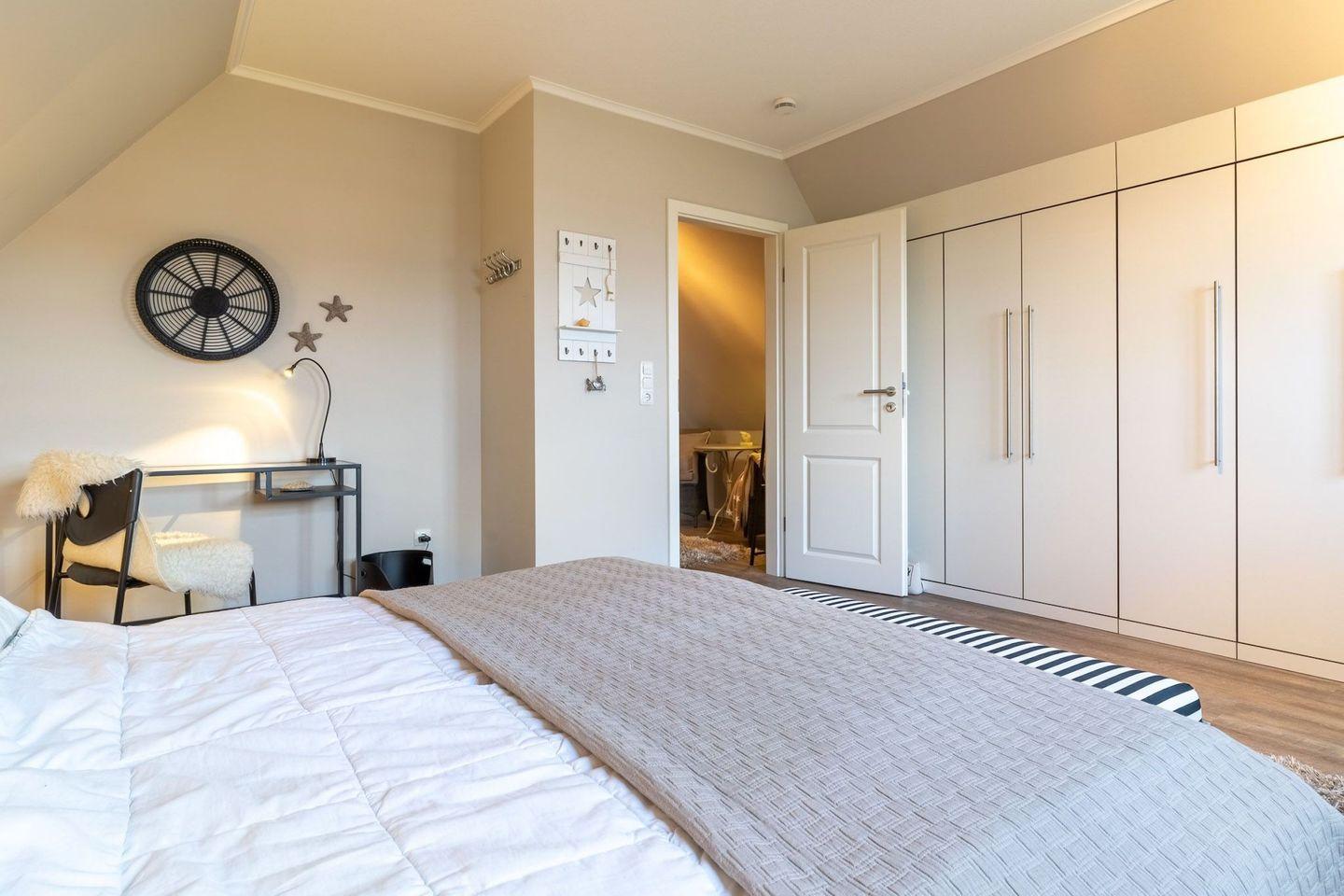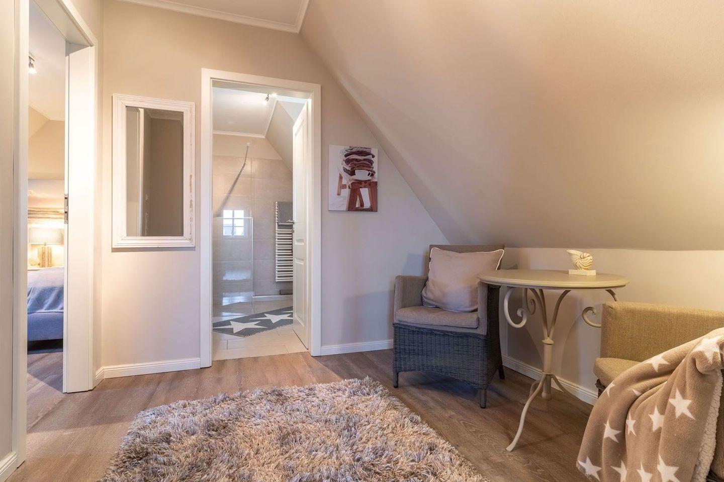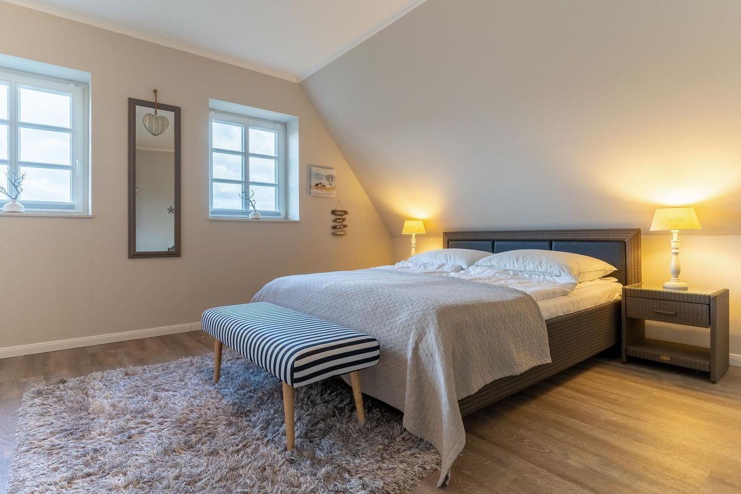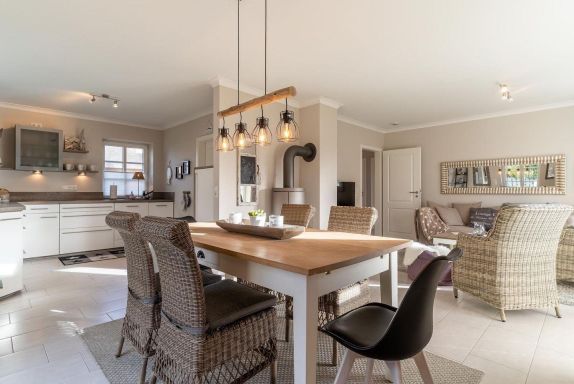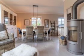 Dieses wunderschöne Doppelhaus unter Reet verfügt über ca. 113 m² Wohnfläche und bietet großzügigen Platz für 6 Personen. Im Erdgeschoss befindet sich der lichtdurchflutete Wohnraum mit TV, Kamin, einer großzügigen Sitzecke. Die offene Wohnküche verfügt über hochwertige Geräte und ist voll ausgestattet für gemeinsames Kochen. Die Wohnräume sind mit exklusiven Möbeln eingerichtet. An den Wohnbereich schließen sich ein Flur, sowie ein Hauswirtschaftsraum. Ebenso ist im Erdgeschoss ein Doppelschlafzimmer mit Gästebad und Dusche. Das gesamte Erdgeschoss verfügt über geschmackvolle Fußbodenfliesen.