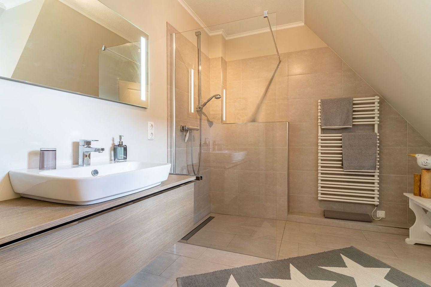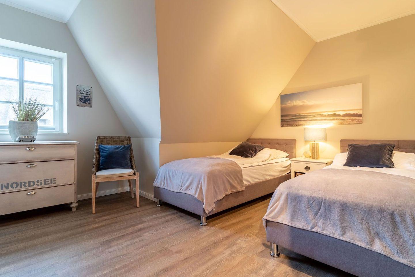 Über eine Holztreppe gelangt man in das Obergeschoss. Die zwei weiteren Schlafzimmern, eines mit einem Doppelbett und eines mit 2 Einzelbetten, sorgen für ruhevolle Erholung. Darüber hinaus befindet sich im Obergeschoss ein weiteres großzügiges Duschbad.